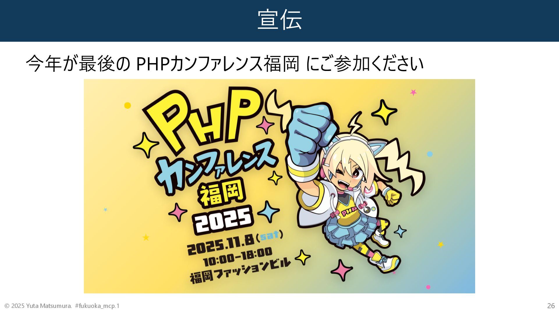 宣伝 今年が最後の PHPカンファレンス福岡 にご参加ください © 2025 Yuta Matsumura. #fukuoka_mcp.1 26