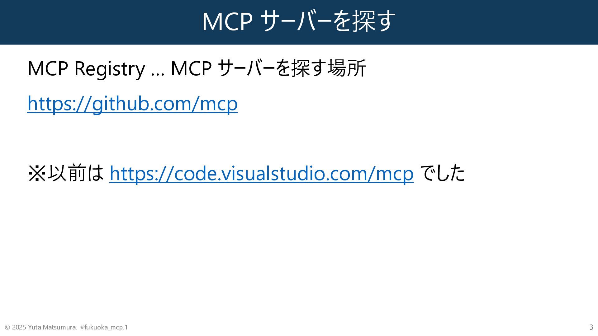 MCP サーバーを探す MCP Registry … MCP サーバーを探す場所 https://github.com/mcp ※以前は https://code.visualstudio.com/mcp