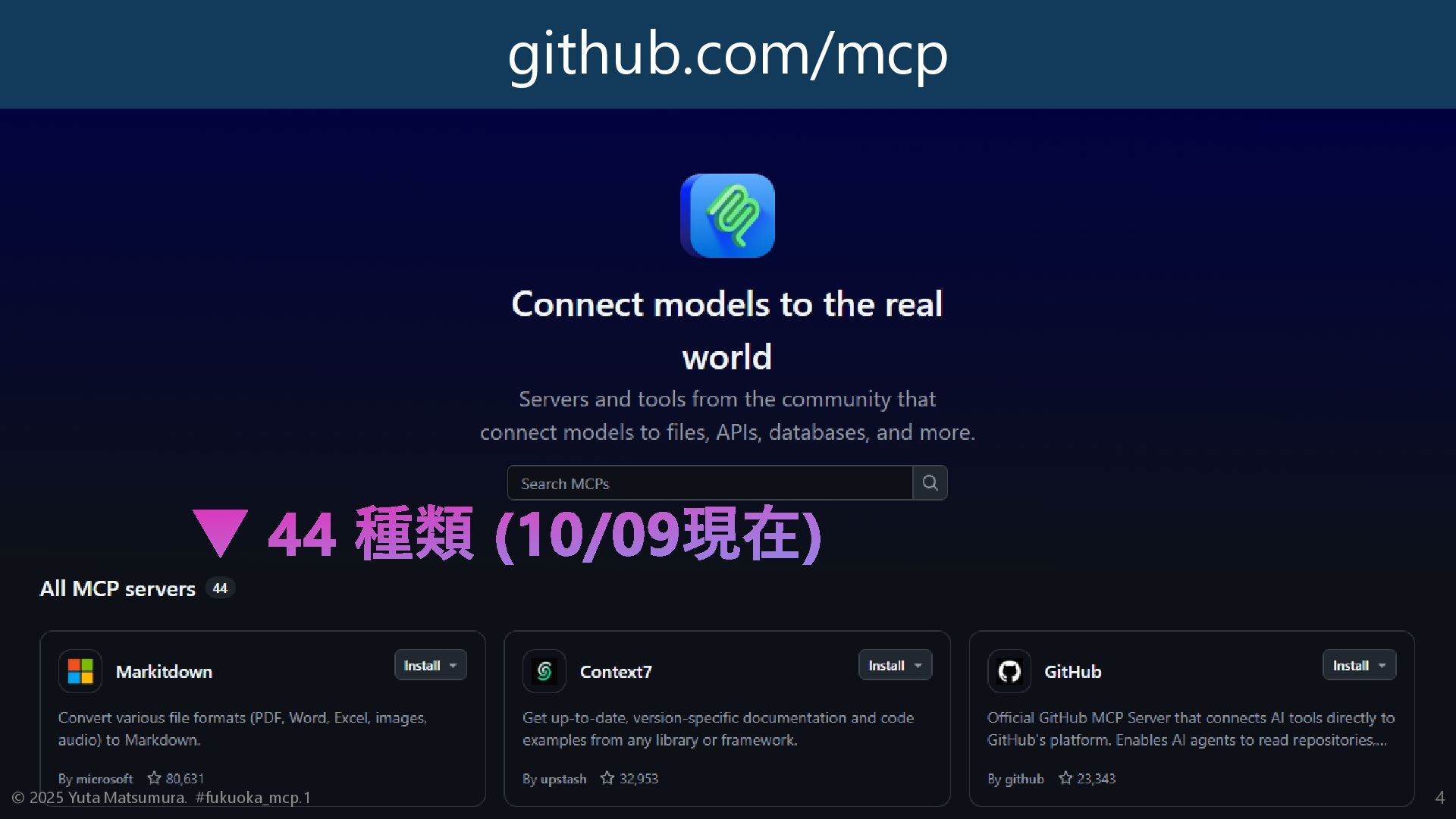 github.com/mcp © 2025 Yuta Matsumura. #fukuoka_mcp.1 4 ▼ 44 種類