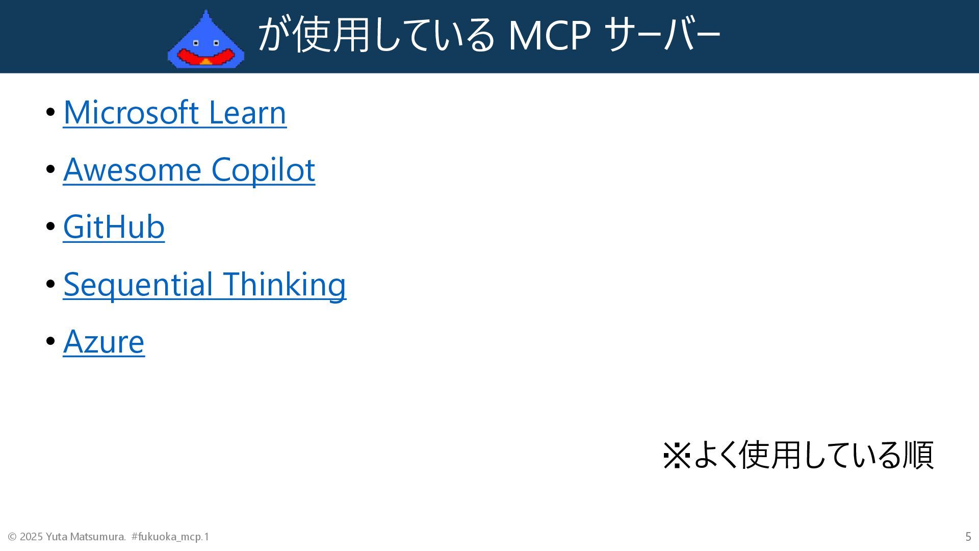 GitHub • Sequential Thinking • Azure ※よく使用している順 © 2025 Yuta Matsumura. #fukuoka_mcp.1 5