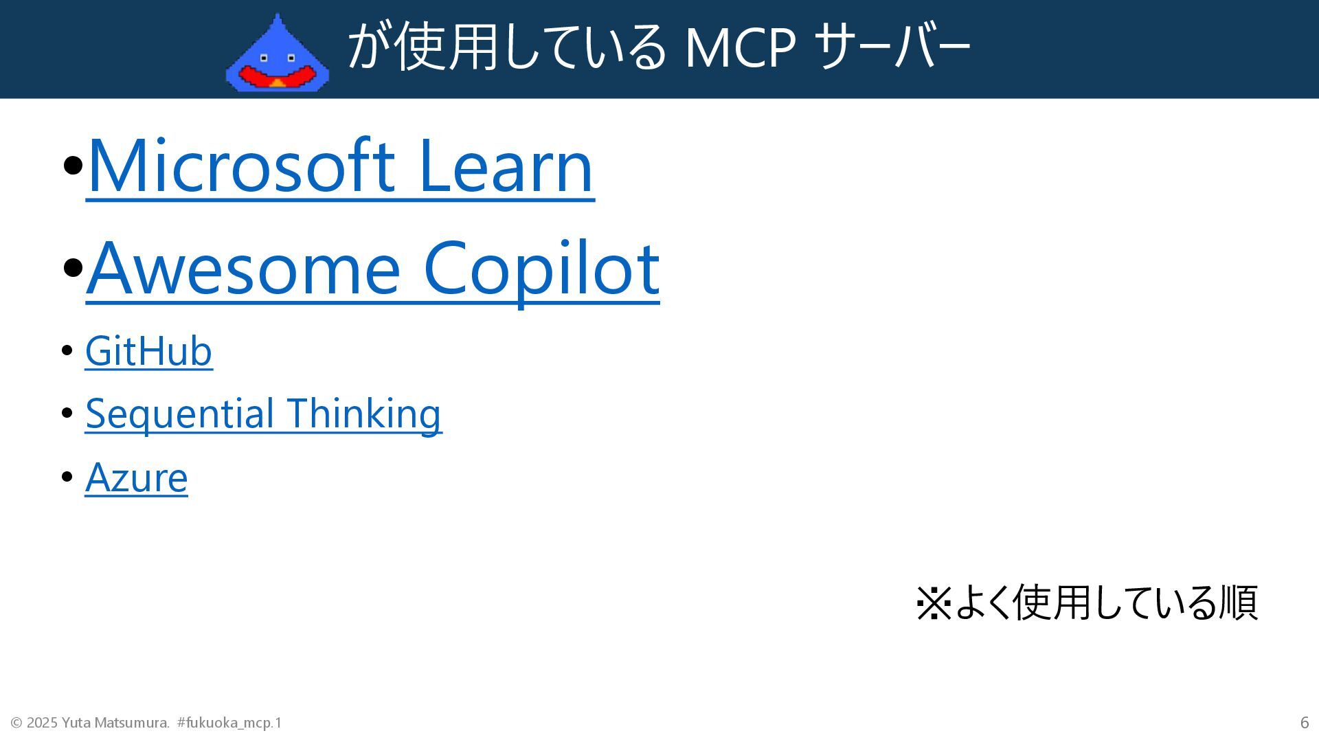 Sequential Thinking • Azure ※よく使用している順 © 2025 Yuta Matsumura. #fukuoka_mcp.1 6