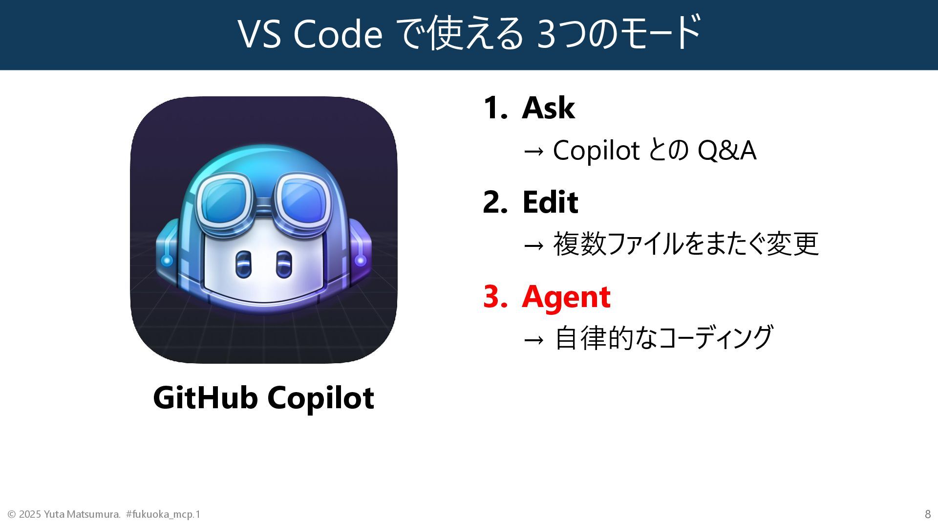 VS Code で使える 3つのモード GitHub Copilot © 2025 Yuta Matsumura.