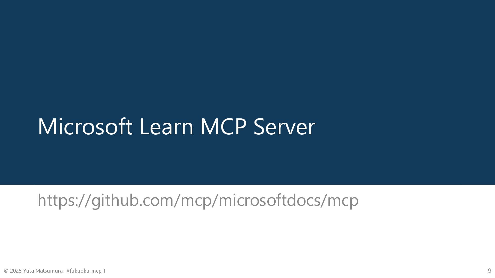 Microsoft Learn MCP Server https://github.com/mcp/microsoftdocs/mcp © 2025 Yuta Matsumura. #fukuoka_mcp.1