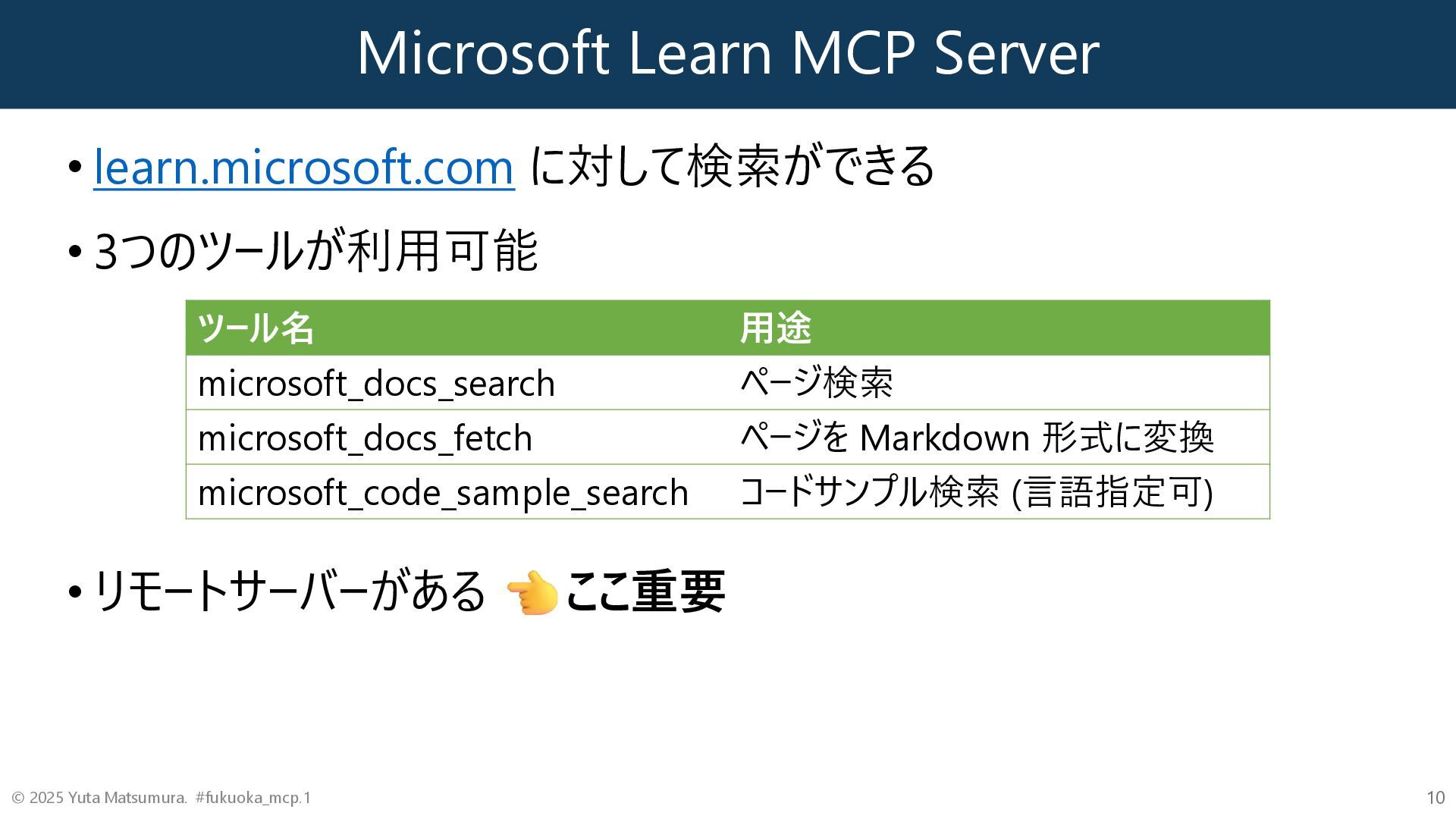 リモートサーバーがある ここ重要 © 2025 Yuta Matsumura. #fukuoka_mcp.1 10 ツール名 用途 microsoft_docs_search ページ検索 microsoft_docs_fetch ページを Markdown 形式に変換 microsoft_code_sample_search コードサンプル検索 (言語指定可)