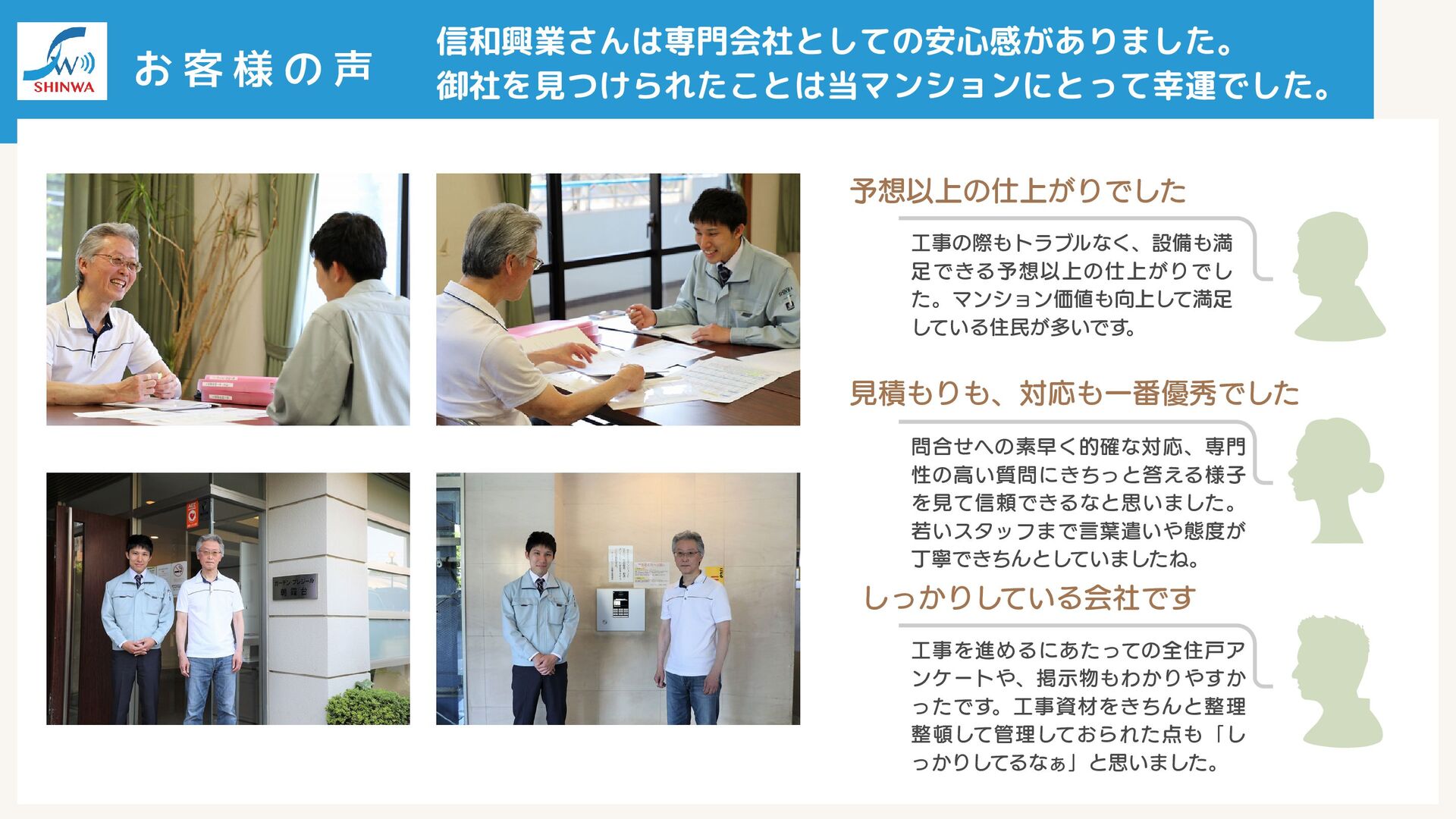 ンケートや、掲示物もわかりやすか ったです。工事資材をきちんと整理 整頓して管理しておられた点も「し っかりしてるなぁ」と思いました。 予想以上の仕上がりでした 見積もりも、対応も一番優秀でした しっかりしている会社です お 客 様 の 声 信和興業さんは専門会社としての安心感がありました。 御社を見つけられたことは当マンションにとって幸運でした。