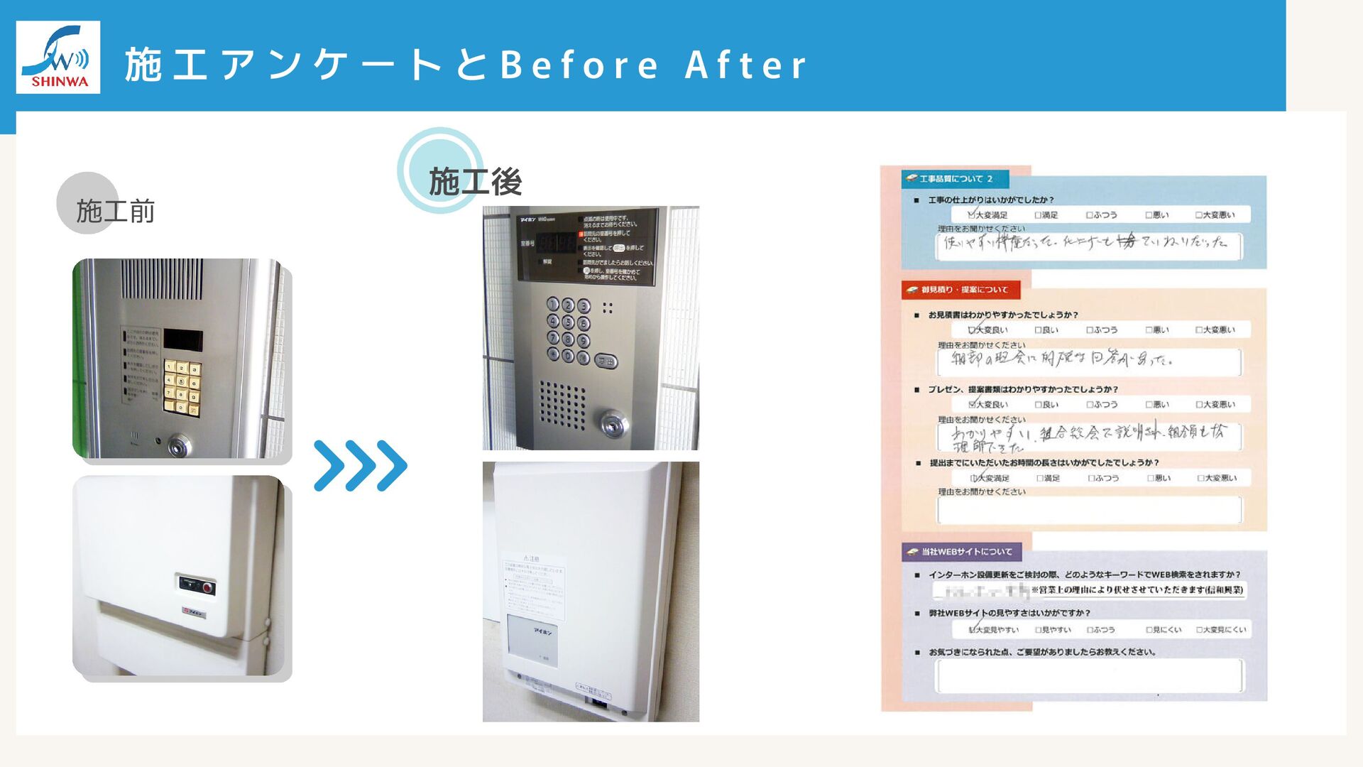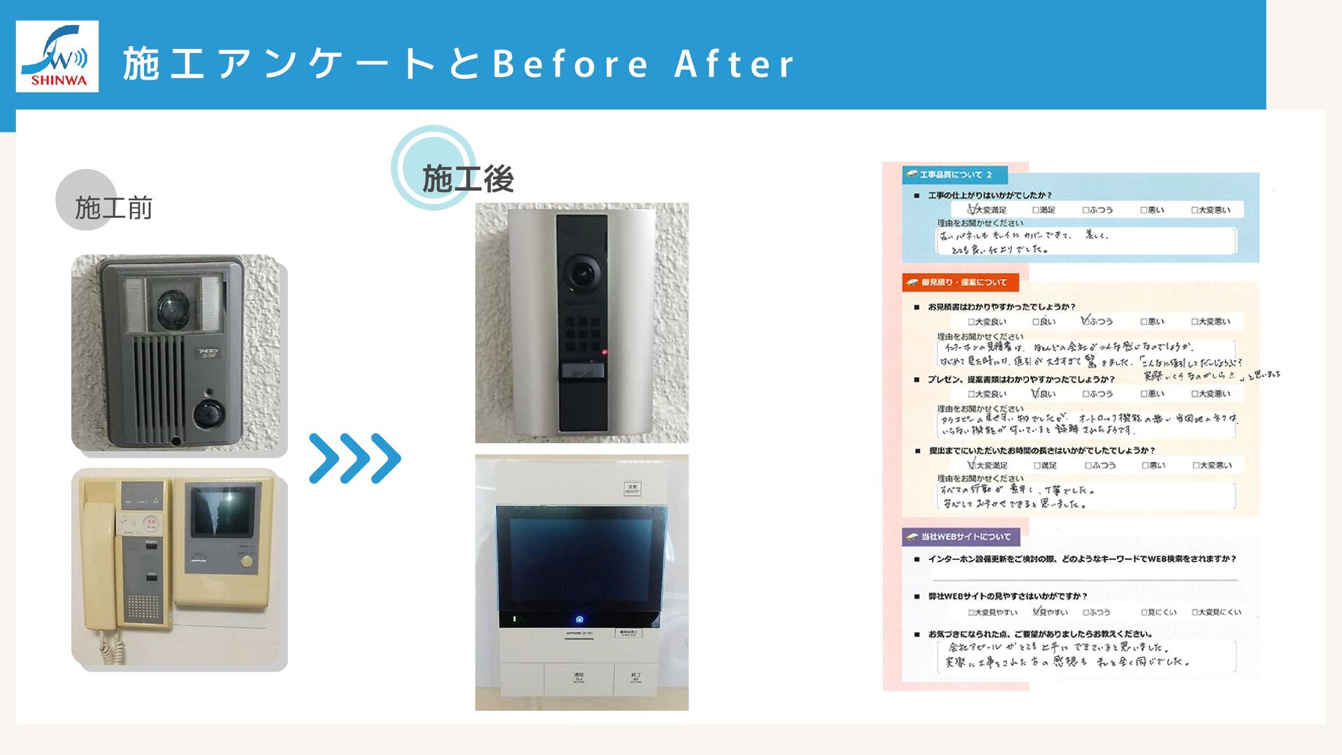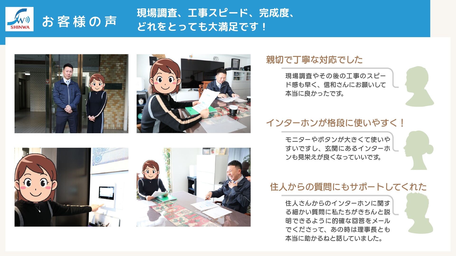 現場調査やその後の工事のスピー ド感も早く、信和さんにお願いして 本当に良かったです。 親切で丁寧な対応でした モニターやボタンが大きくて使いや すいですし、玄関にあるインターホ ンも見栄えが良くなっていいです。 インターホンが格段に使いやすく! 住人さんからのインターホンに関す る細かい質問に私たちがきちんと説