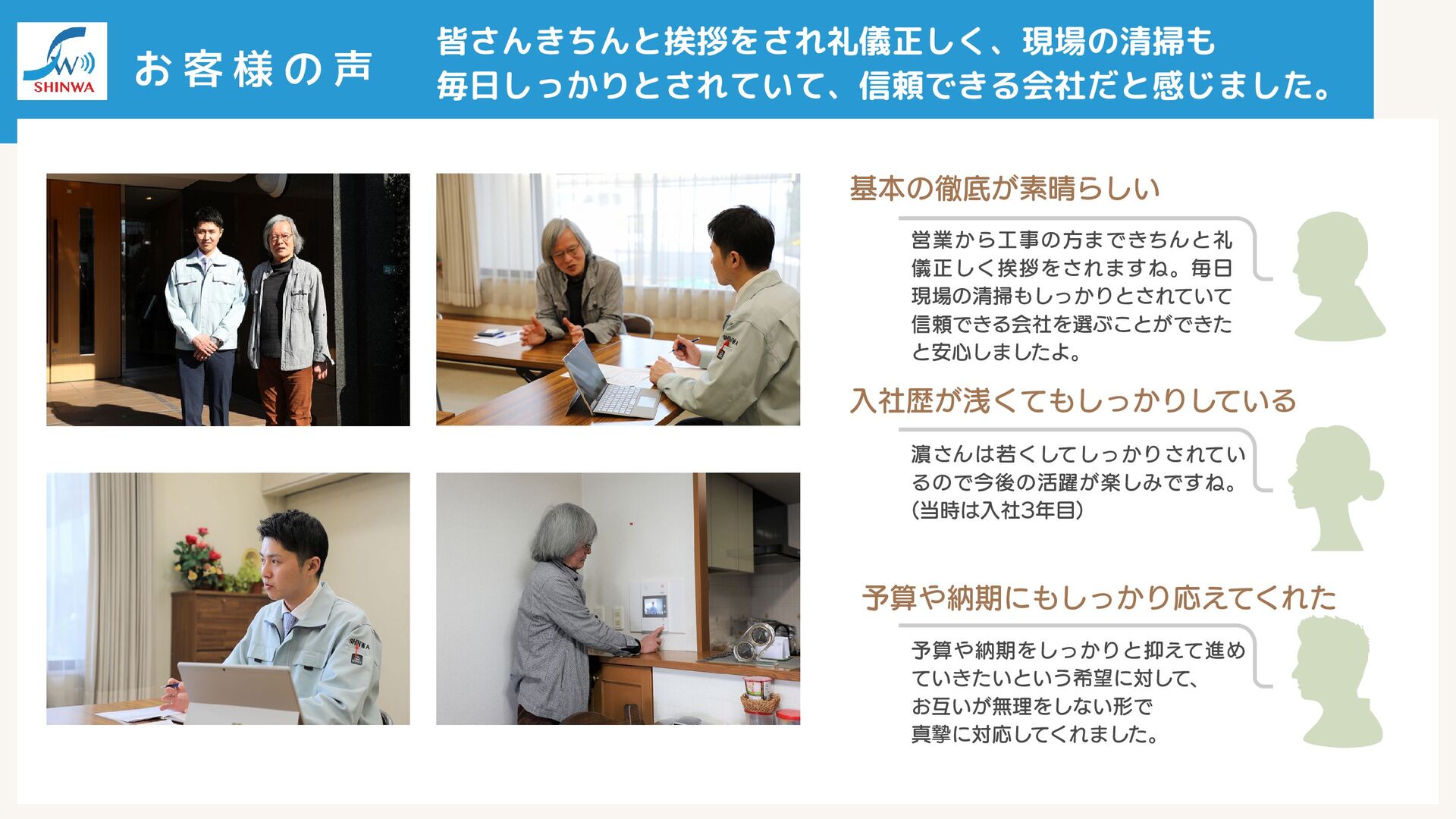 営業から工事の方まできちんと礼 儀正しく挨拶をされますね。毎日 現場の清掃もしっかりとされていて 信頼できる会社を選ぶことができた と安心しましたよ。 濵さんは若くしてしっかりされてい るので今後の活躍が楽しみですね。 (当時は入社3年目) 予算や納期をしっかりと抑えて進め ていきたいという希望に対して、