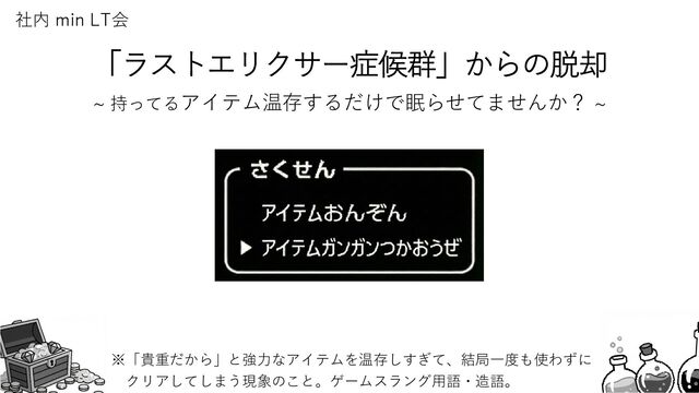 「ラストエリクサー症候群」からの脱却 ~ 持ってるアイテム温存するだけで眠らせてませんか? ~ ※「貴重だから」と強力なアイテムを温存しすぎて、結局一度も使わずに クリアしてしまう現象のこと。ゲームスラング用語・造語。 社内 min LT会