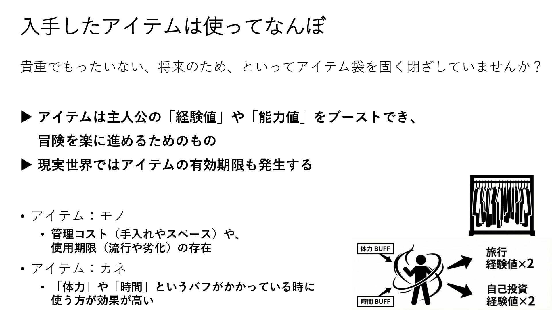 入手したアイテムは使ってなんぼ アイテムは主人公の「経験値」や「能力値」をブーストでき、 冒険を楽に進めるためのもの 現実世界ではアイテムの有効期限も発生する 貴重でもったいない、将来のため、といってアイテム袋を固く閉ざしていませんか? • アイテム:モノ • 管理コスト(手入れやスペース)や、 使用期限(流行や劣化)の存在