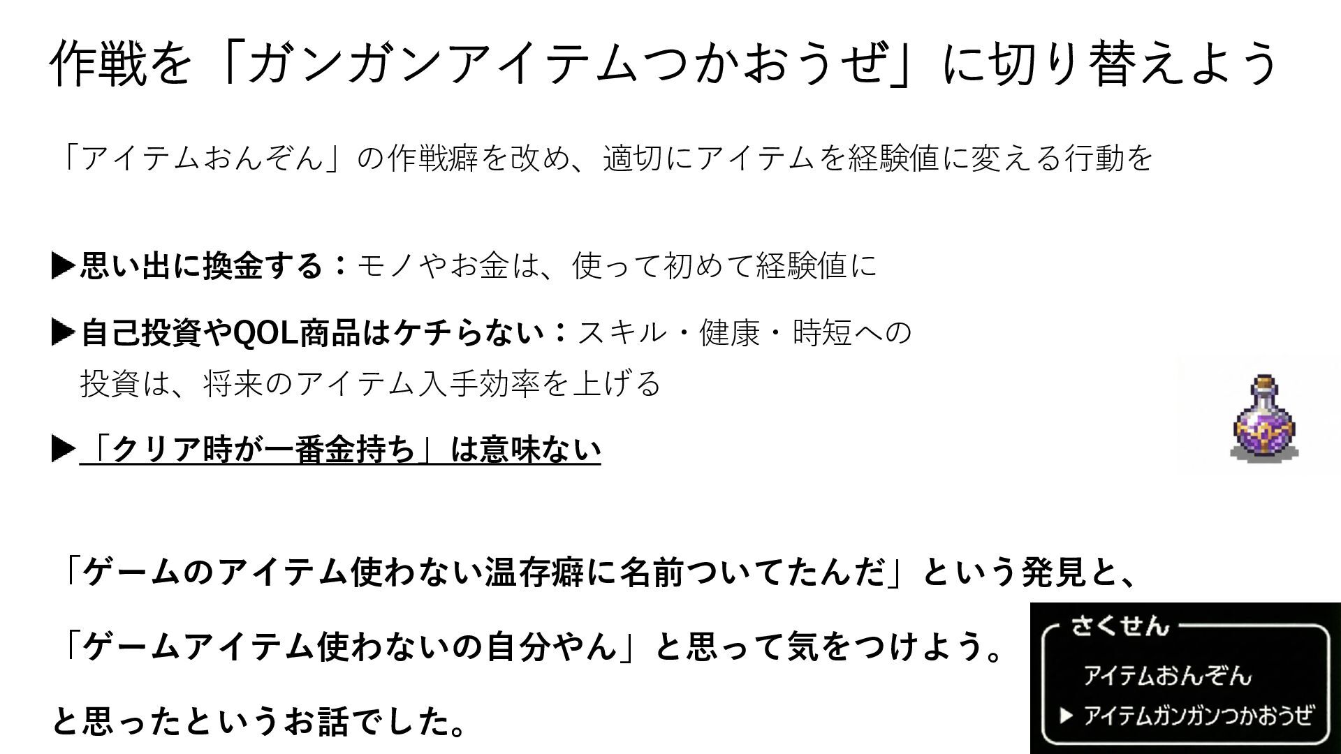 作戦を「ガンガンアイテムつかおうぜ」に切り替えよう 「アイテムおんぞん」の作戦癖を改め、適切にアイテムを経験値に変える行動を 思い出に換金する:モノやお金は、使って初めて経験値に 自己投資やQOL商品はケチらない:スキル・健康・時短への 投資は、将来のアイテム入手効率を上げる 「クリア時が一番金持ち」は意味ない 「ゲームのアイテム使わない温存癖に名前ついてたんだ」という発見と、 「ゲームアイテム使わないの自分やん」と思って気をつけよう。 と思ったというお話でした。