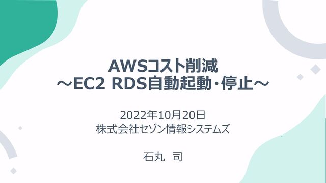 . AWSコスト削減 ~EC2 RDS自動起動・停止~ 2022年10月20日 株式会社セゾン情報システムズ 石丸 司