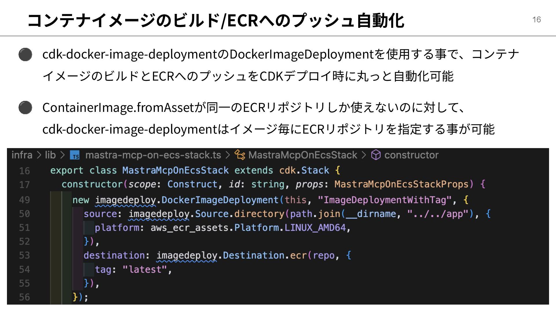 コンテナイメージのビルド/ECRへのプッシュ⾃動化 16 ⚫ cdk-docker-image-deploymentのDockerImageDeploymentを使⽤する事で、コンテナ イメージのビルドとECRへのプッシュをCDKデプロイ時に丸っと⾃動化可能 ⚫ ContainerImage.fromAssetが同⼀のECRリポジトリしか使えないのに対して、 cdk-docker-image-deploymentはイメージ毎にECRリポジトリを指定する事が可能