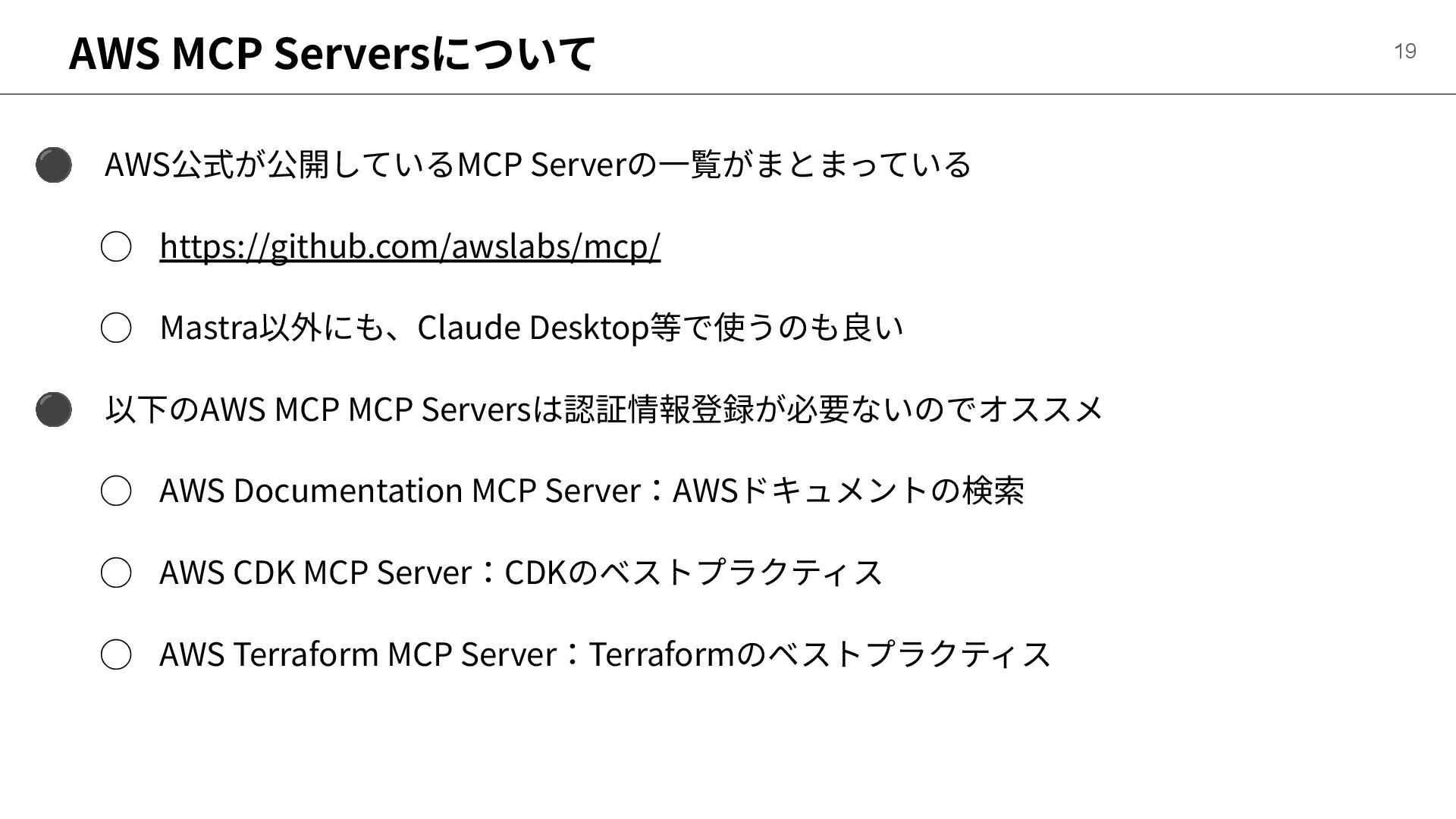 Mastra以外にも、Claude Desktop等で使うのも良い ⚫ 以下のAWS MCP MCP Serversは認証情報登録が必要ないのでオススメ ◯ AWS Documentation MCP Server:AWSドキュメントの検索 ◯ AWS CDK MCP Server:CDKのベストプラクティス ◯ AWS Terraform MCP Server:Terraformのベストプラクティス