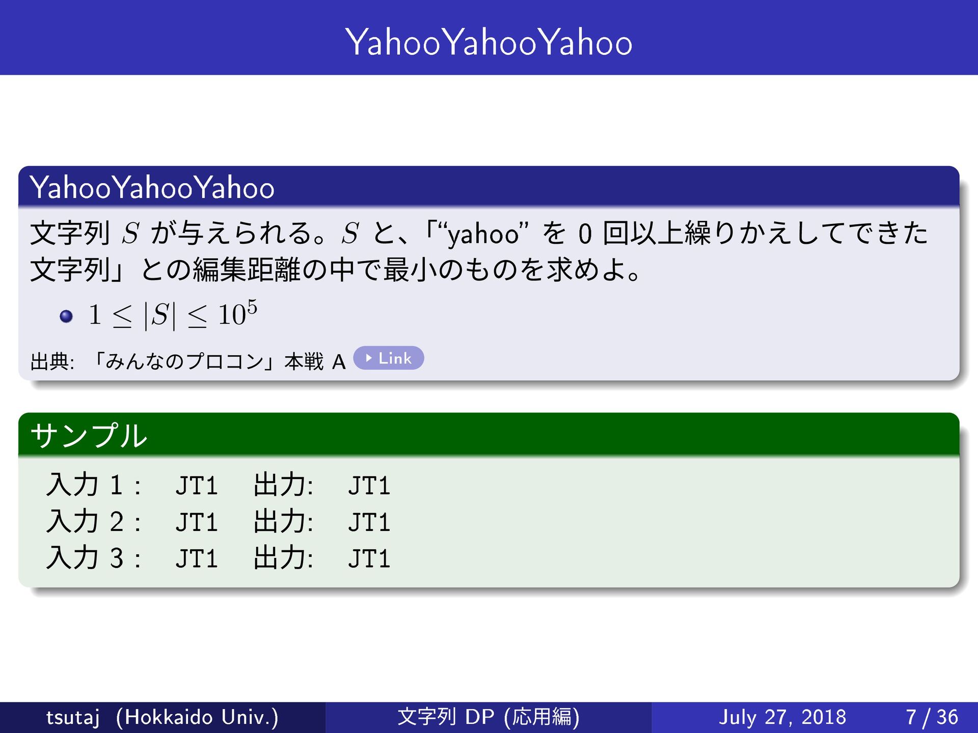Λঢ়ଶͱ͍ͯ͠ ͕ͨɾɾɾ ෳจࣈྻͰ͋Εɺ֤จࣈྻͷ prex Λྻڍͯ͠ɺͦΕΒΛͯ͢ঢ় ଶͱ͠Α͏ʂ P = {AAA, AAG, T, TCA, TG} ͷ߹ɺ͋ΓಘΔঢ়ଶ A, AA, AAA, AAG, T, TC, TCA, TG ͜ͷঢ়ଶؒͷભҠ͕ѲͰ͖Εɺઌ΄Ͳͱಉ༷ʹղ͚Δʂ dp[i][j] := S Λ i จࣈ·Ͱݟͨͱ͖ɺͦͷ sux ͕ j ൪ͷঢ়ଶͱ Ұக͍ͯ͠ΔΑ͏ʹ͢ΔͨΊʹඞཁͳૢ࡞ճͷ࠷খ next ྻΛಘΔલॲཧ: O(N2L2 + NL3 log(NL)), DP O(NL|S|) L Pi ͷ্͞ݶ tsutaj (Hokkaido Univ.) จࣈྻ DP (Ԡ༻ฤ) July 27, 2018 22 / 36
