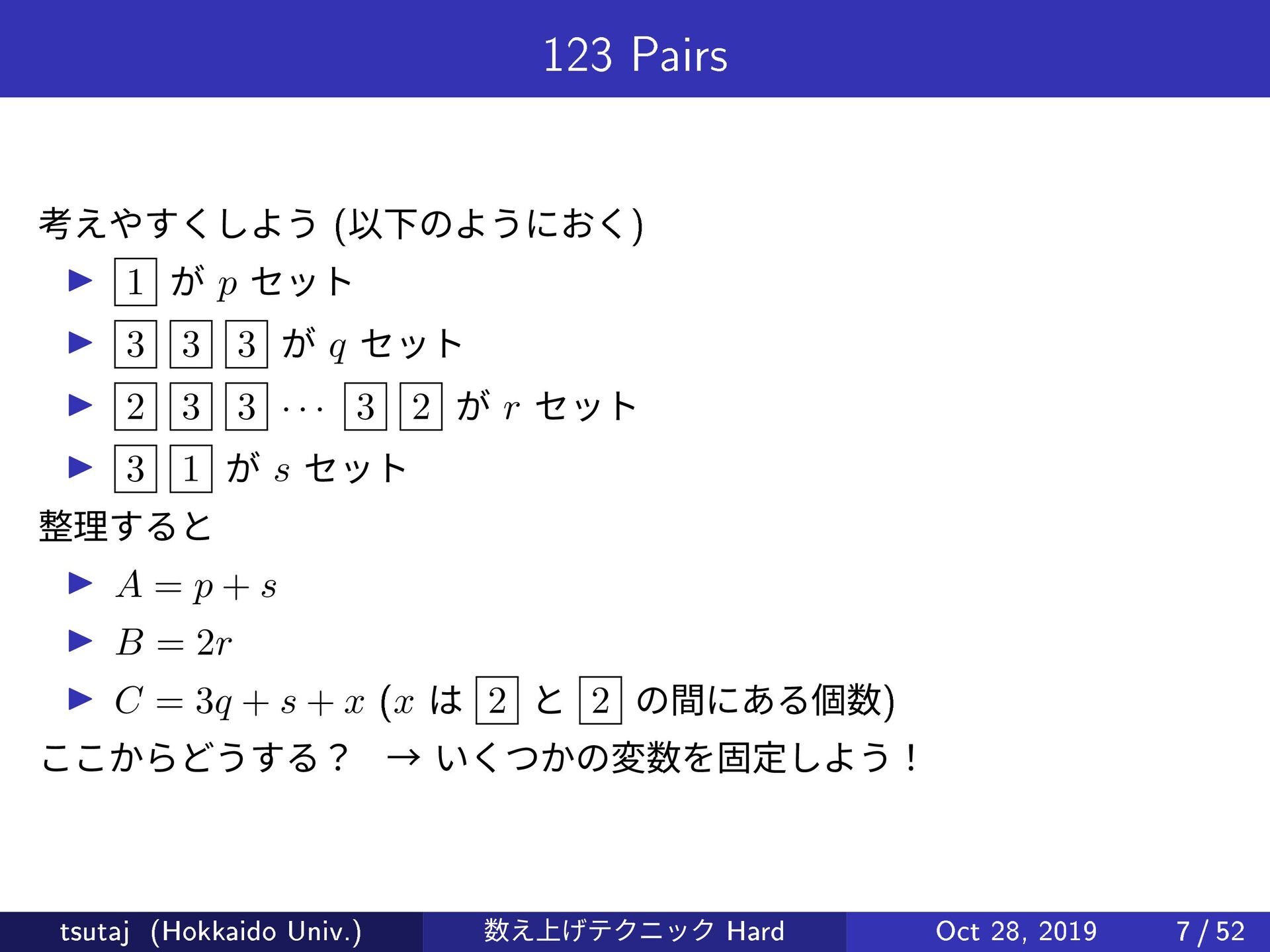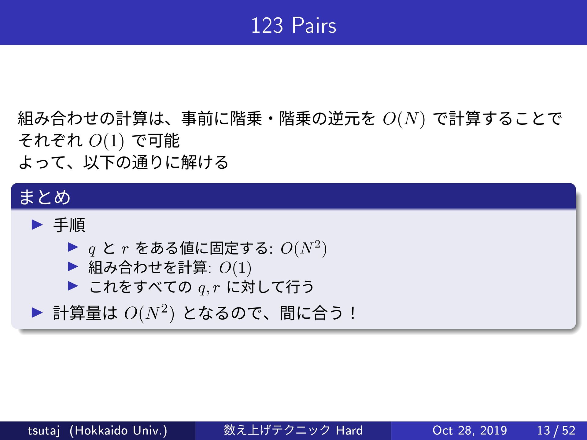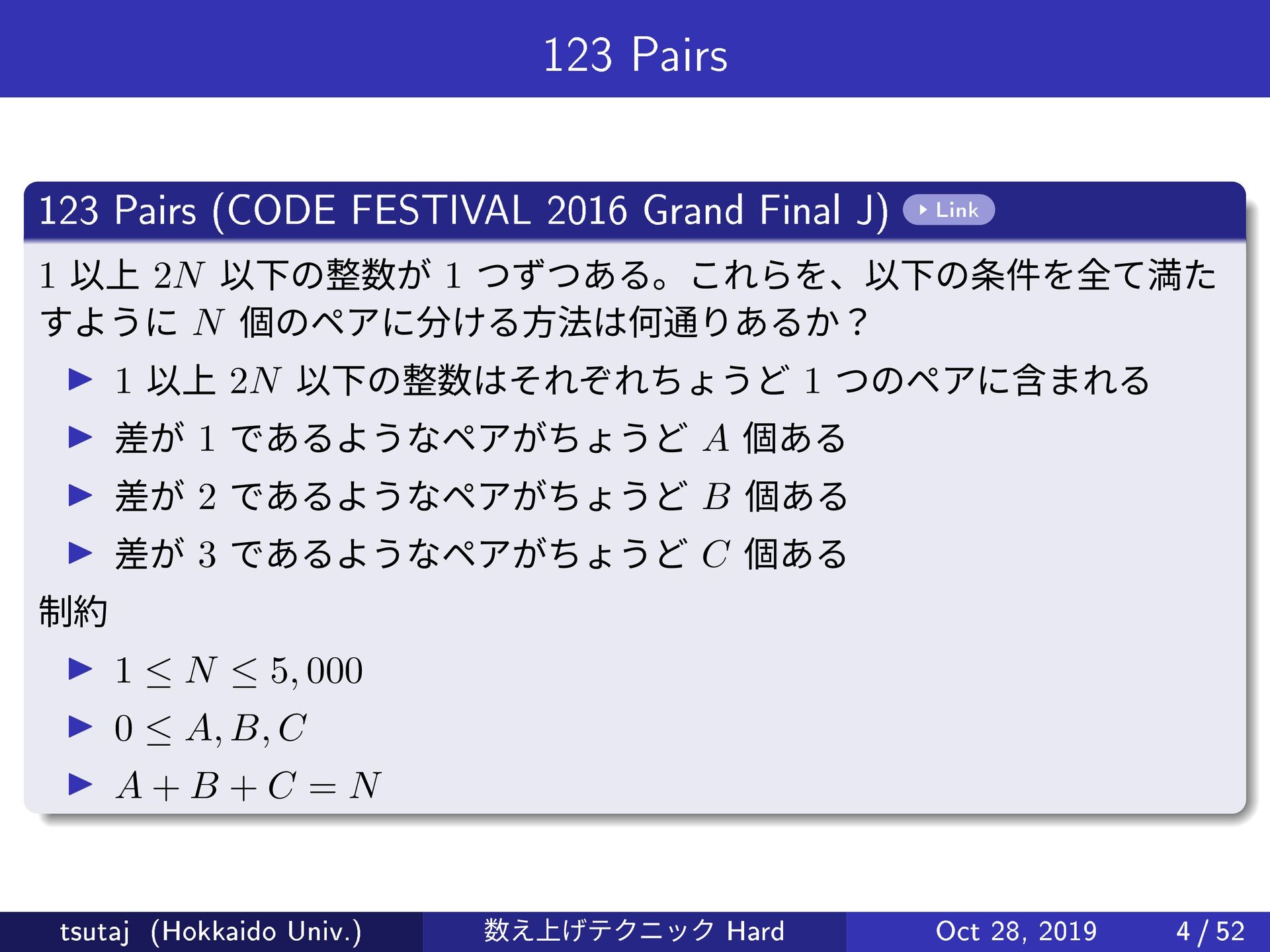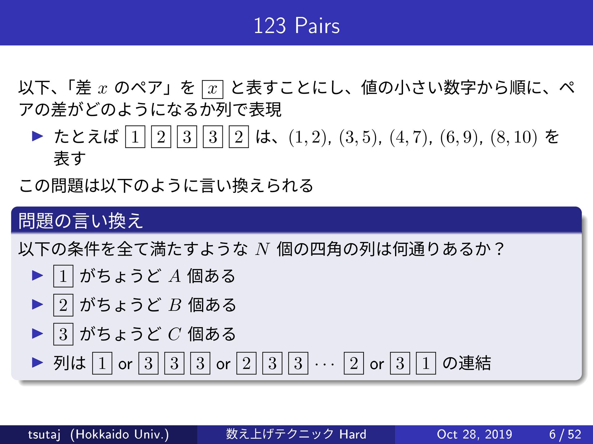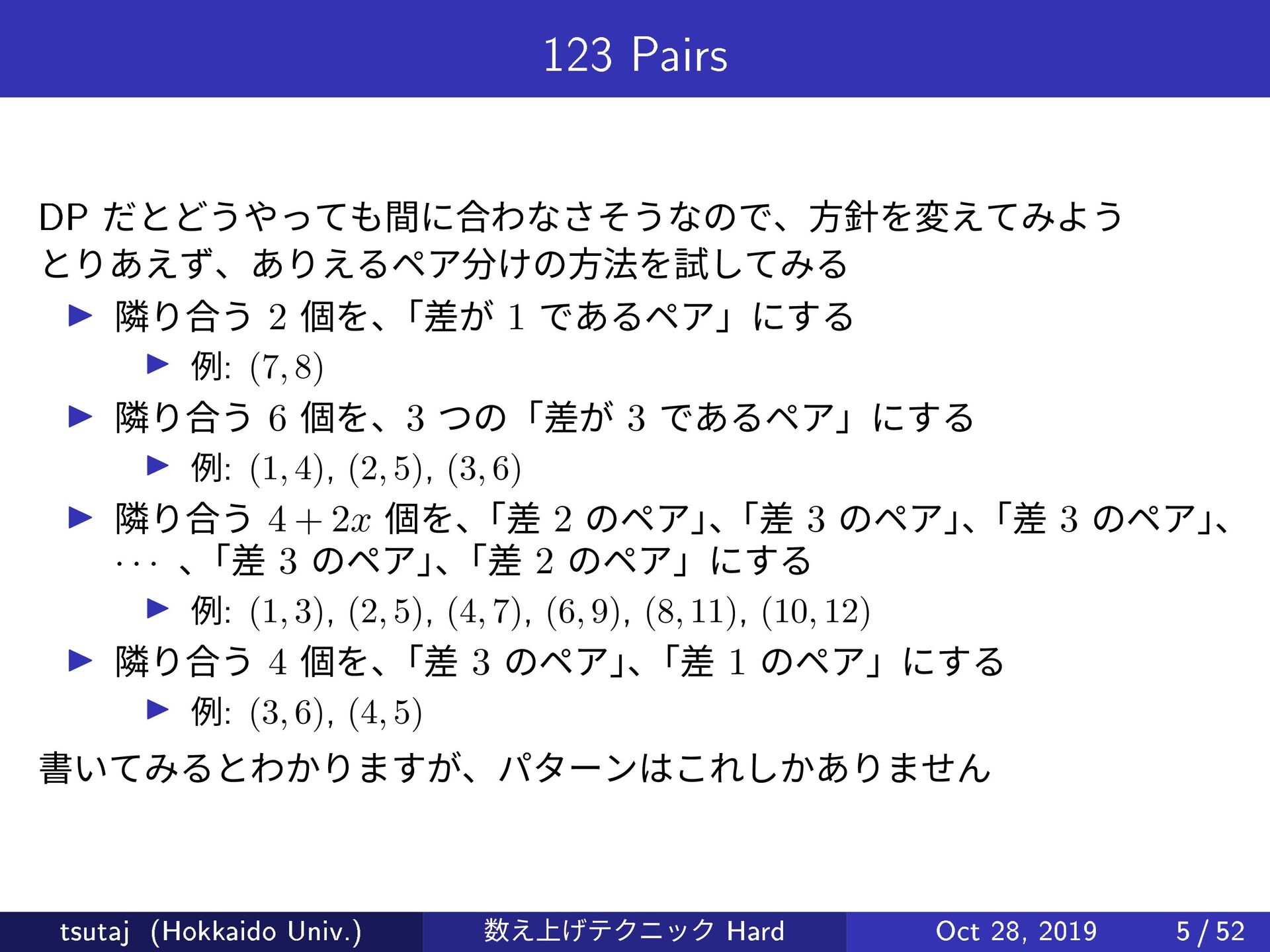1 Ͱ͋ΔϖΞʯʹ͢Δ ▶ ྫ: (7, 8) ▶ ྡΓ߹͏ 6 ݸΛɺ3 ͭͷʮ͕ࠩ 3 Ͱ͋ΔϖΞʯʹ͢Δ ▶ ྫ: (1, 4), (2, 5), (3, 6) ▶ ྡΓ߹͏ 4 + 2x ݸΛɺ ʮࠩ 2 ͷϖΞʯ ɺ ʮࠩ 3 ͷϖΞʯ ɺ ʮࠩ 3 ͷϖΞʯ ɺ · · · ɺ ʮࠩ 3 ͷϖΞʯ ɺ ʮࠩ 2 ͷϖΞʯʹ͢Δ ▶ ྫ: (1, 3), (2, 5), (4, 7), (6, 9), (8, 11), (10, 12) ▶ ྡΓ߹͏ 4 ݸΛɺ ʮࠩ 3 ͷϖΞʯ ɺ ʮࠩ 1 ͷϖΞʯʹ͢Δ ▶ ྫ: (3, 6), (4, 5) ॻ͍ͯΈΔͱΘ͔Γ·͕͢ɺύλʔϯ͜Ε͔͋͠Γ·ͤΜ tsutaj (Hokkaido Univ.) ্͑͛ςΫχοΫ Hard Oct 28, 2019 5 / 52