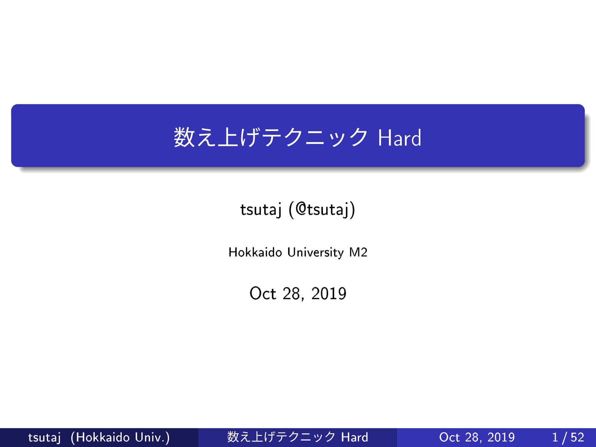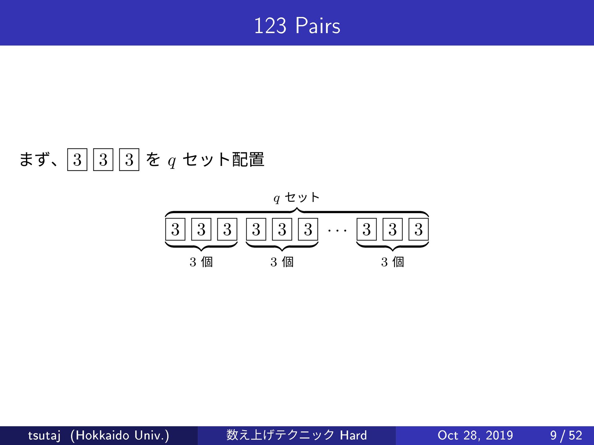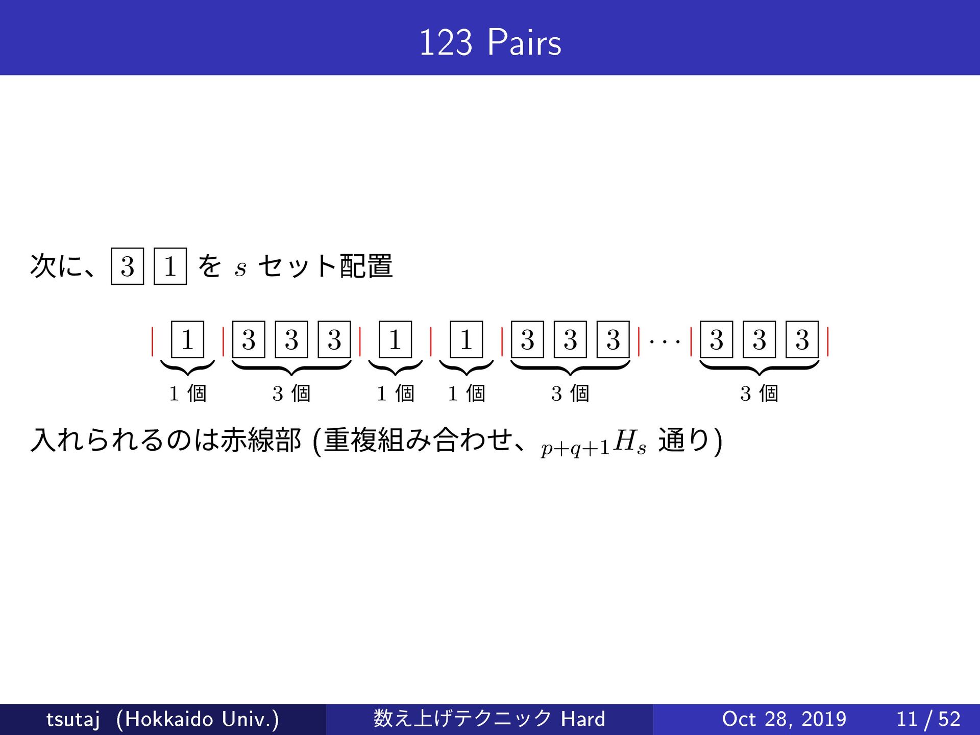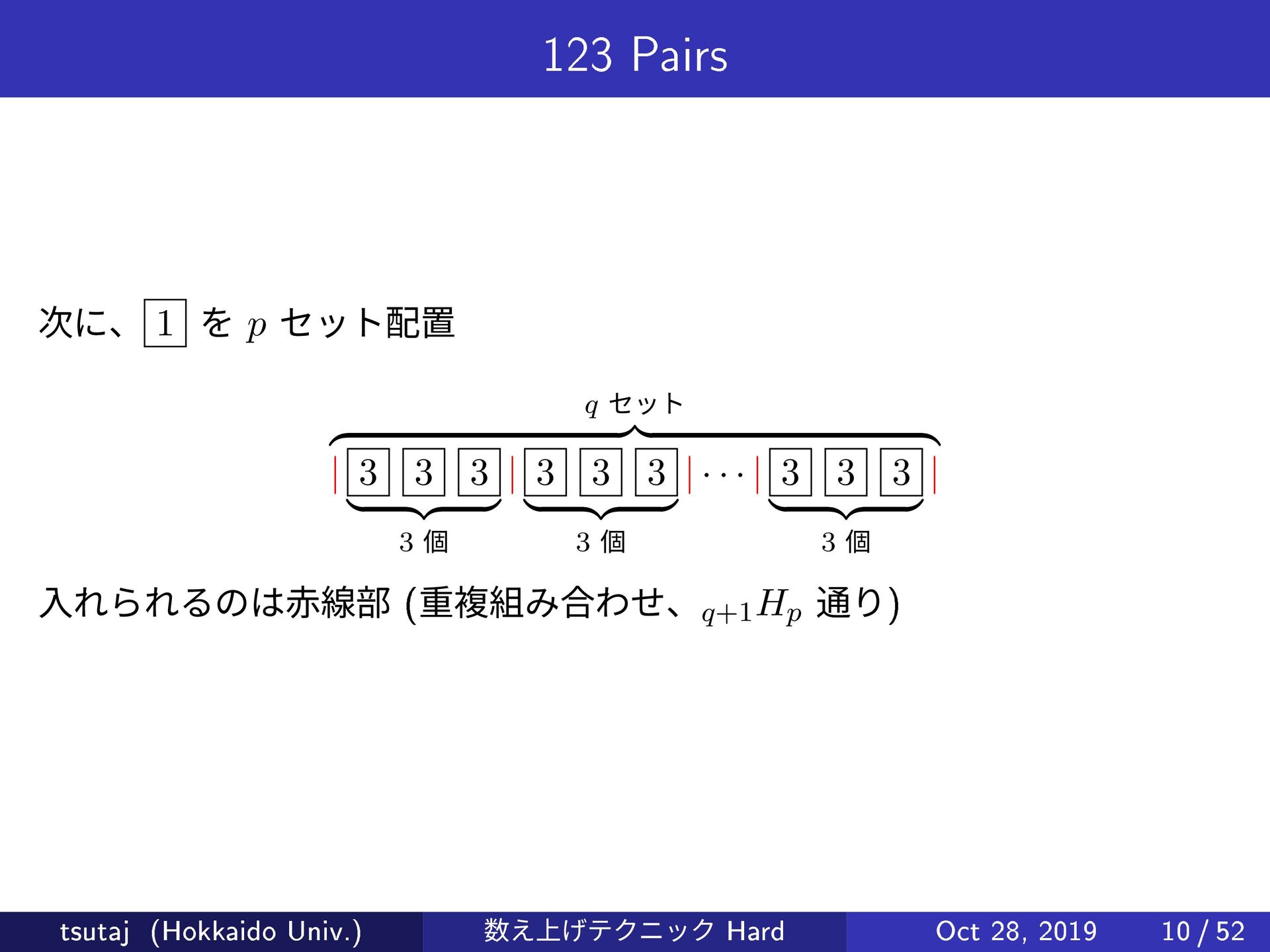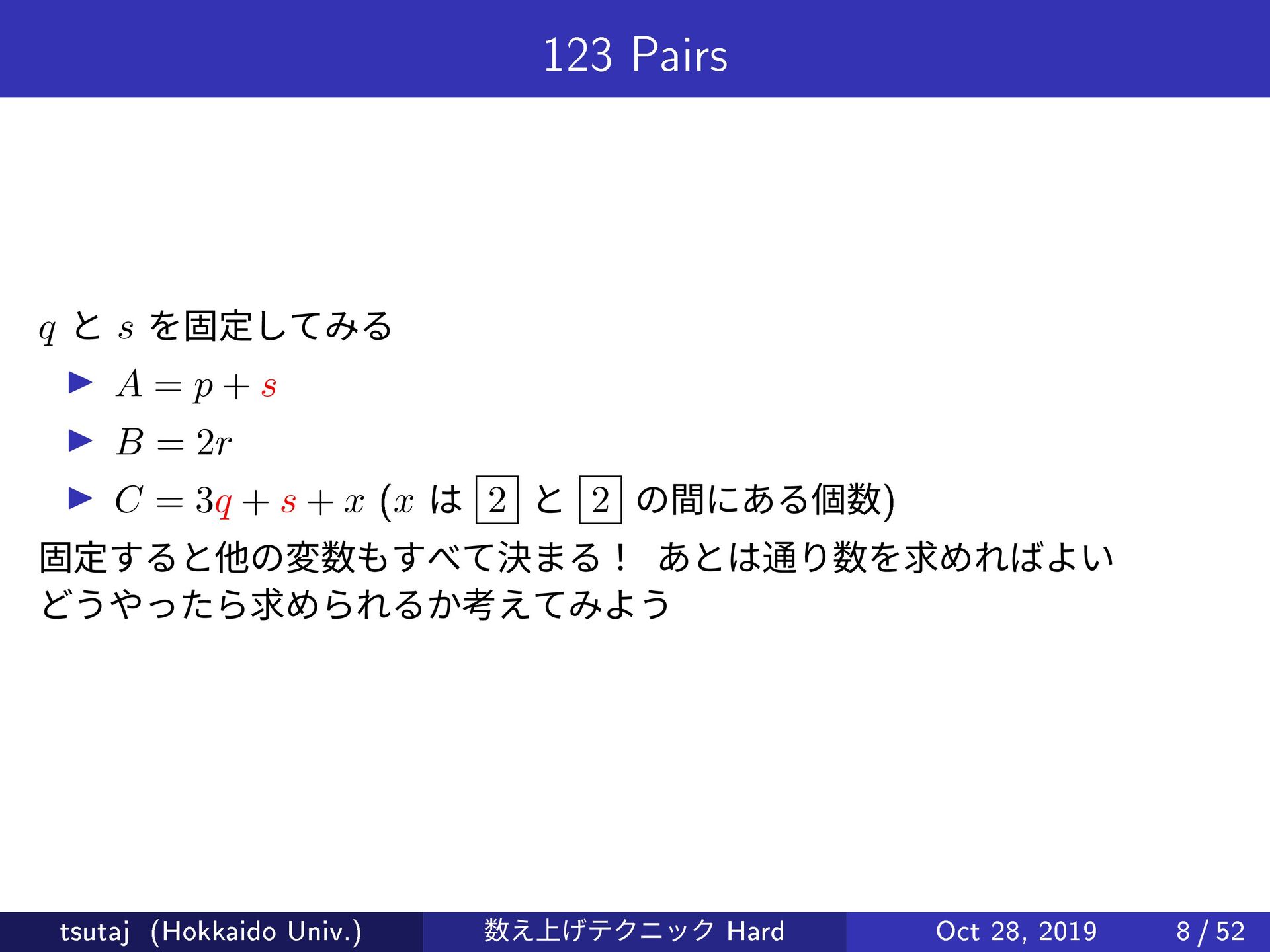 1 Ͱ͋ΔϖΞʯʹ͢Δ ▶ ྫ: (7, 8) ▶ ྡΓ߹͏ 6 ݸΛɺ3 ͭͷʮ͕ࠩ 3 Ͱ͋ΔϖΞʯʹ͢Δ ▶ ྫ: (1, 4), (2, 5), (3, 6) ▶ ྡΓ߹͏ 4 + 2x ݸΛɺ ʮࠩ 2 ͷϖΞʯ ɺ ʮࠩ 3 ͷϖΞʯ ɺ ʮࠩ 3 ͷϖΞʯ ɺ · · · ɺ ʮࠩ 3 ͷϖΞʯ ɺ ʮࠩ 2 ͷϖΞʯʹ͢Δ ▶ ྫ: (1, 3), (2, 5), (4, 7), (6, 9), (8, 11), (10, 12) ▶ ྡΓ߹͏ 4 ݸΛɺ ʮࠩ 3 ͷϖΞʯ ɺ ʮࠩ 1 ͷϖΞʯʹ͢Δ ▶ ྫ: (3, 6), (4, 5) ॻ͍ͯΈΔͱΘ͔Γ·͕͢ɺύλʔϯ͜Ε͔͋͠Γ·ͤΜ tsutaj (Hokkaido Univ.) ্͑͛ςΫχοΫ Hard Oct 28, 2019 5 / 52