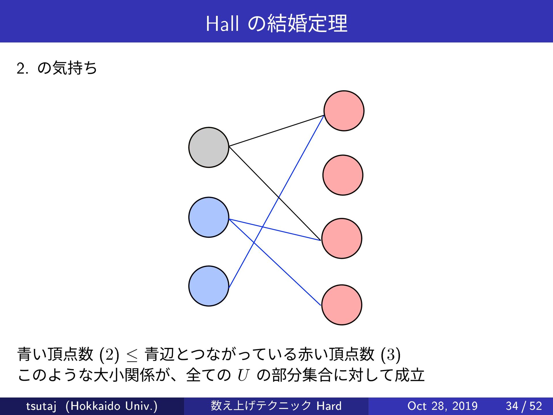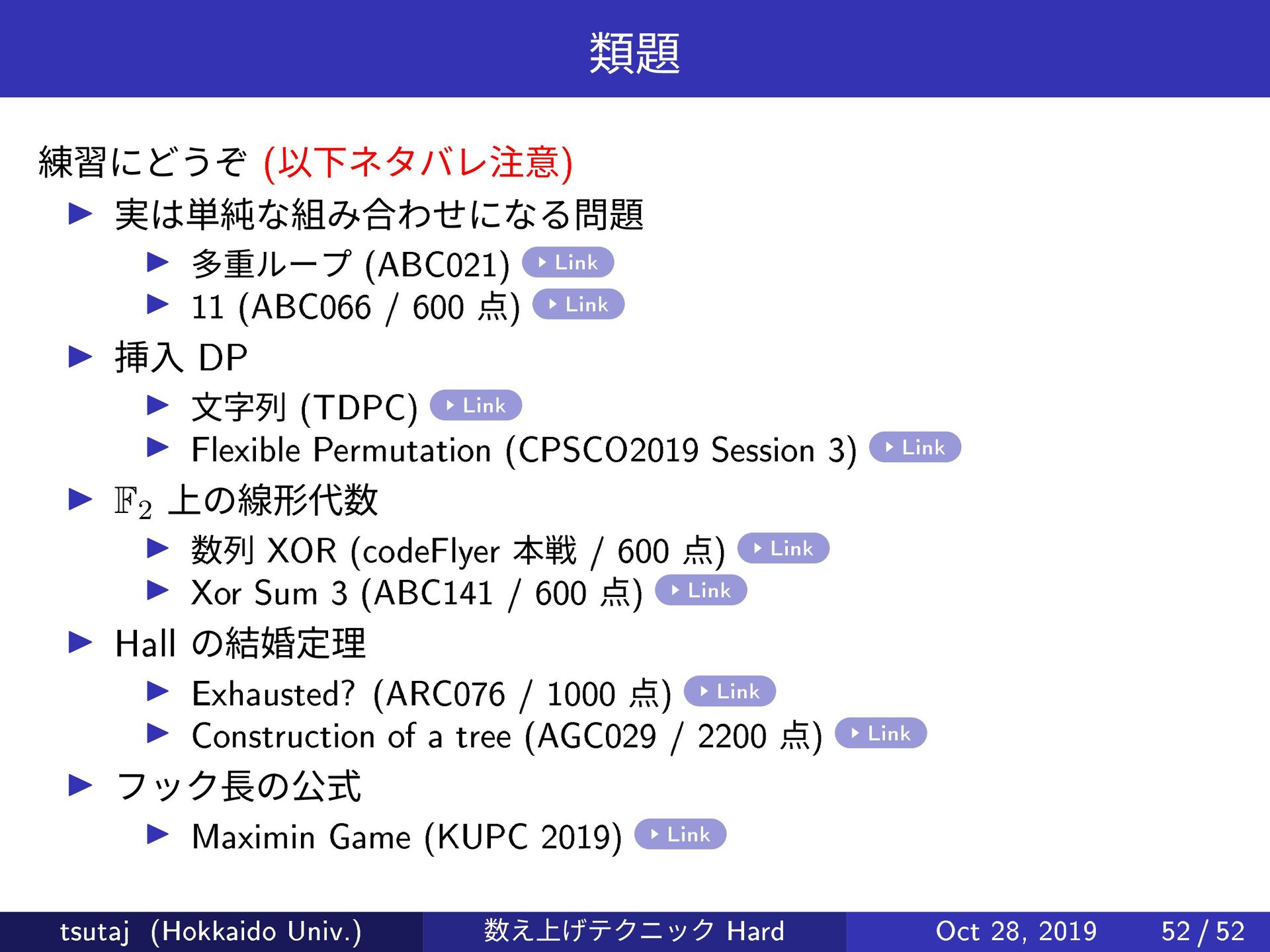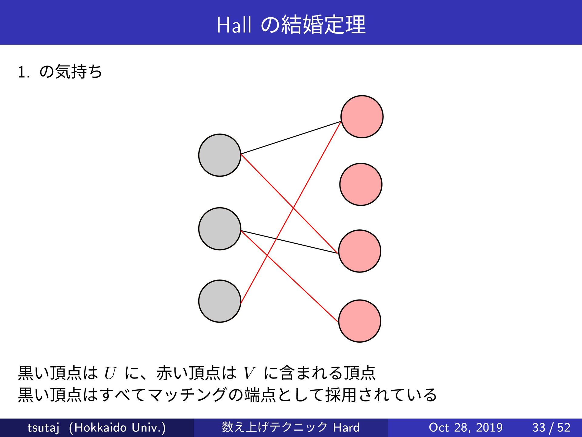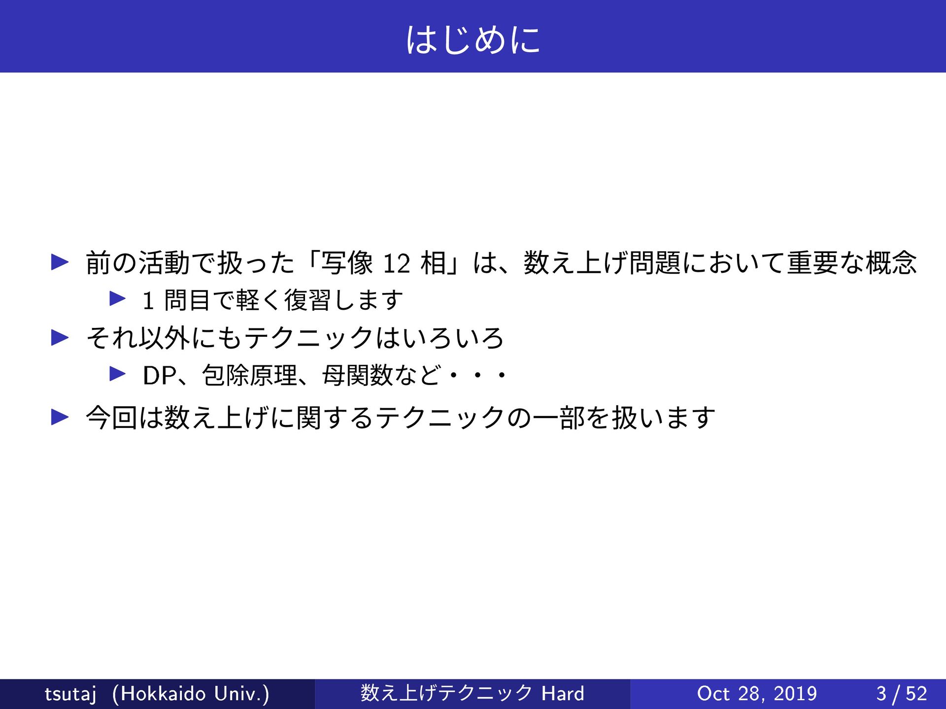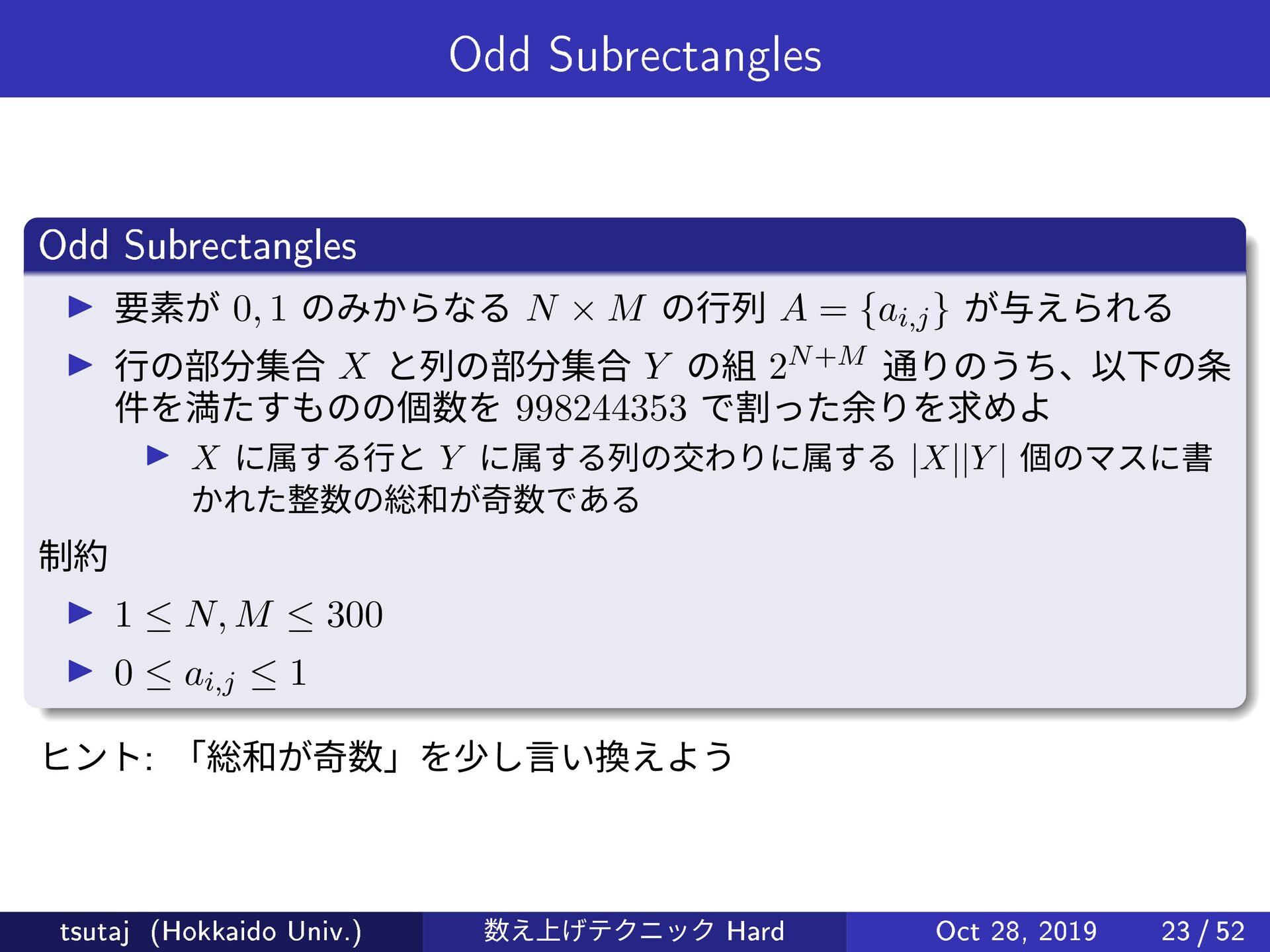 1 Ͱ͋ΔϖΞʯʹ͢Δ ▶ ྫ: (7, 8) ▶ ྡΓ߹͏ 6 ݸΛɺ3 ͭͷʮ͕ࠩ 3 Ͱ͋ΔϖΞʯʹ͢Δ ▶ ྫ: (1, 4), (2, 5), (3, 6) ▶ ྡΓ߹͏ 4 + 2x ݸΛɺ ʮࠩ 2 ͷϖΞʯ ɺ ʮࠩ 3 ͷϖΞʯ ɺ ʮࠩ 3 ͷϖΞʯ ɺ · · · ɺ ʮࠩ 3 ͷϖΞʯ ɺ ʮࠩ 2 ͷϖΞʯʹ͢Δ ▶ ྫ: (1, 3), (2, 5), (4, 7), (6, 9), (8, 11), (10, 12) ▶ ྡΓ߹͏ 4 ݸΛɺ ʮࠩ 3 ͷϖΞʯ ɺ ʮࠩ 1 ͷϖΞʯʹ͢Δ ▶ ྫ: (3, 6), (4, 5) ॻ͍ͯΈΔͱΘ͔Γ·͕͢ɺύλʔϯ͜Ε͔͋͠Γ·ͤΜ tsutaj (Hokkaido Univ.) ্͑͛ςΫχοΫ Hard Oct 28, 2019 5 / 52