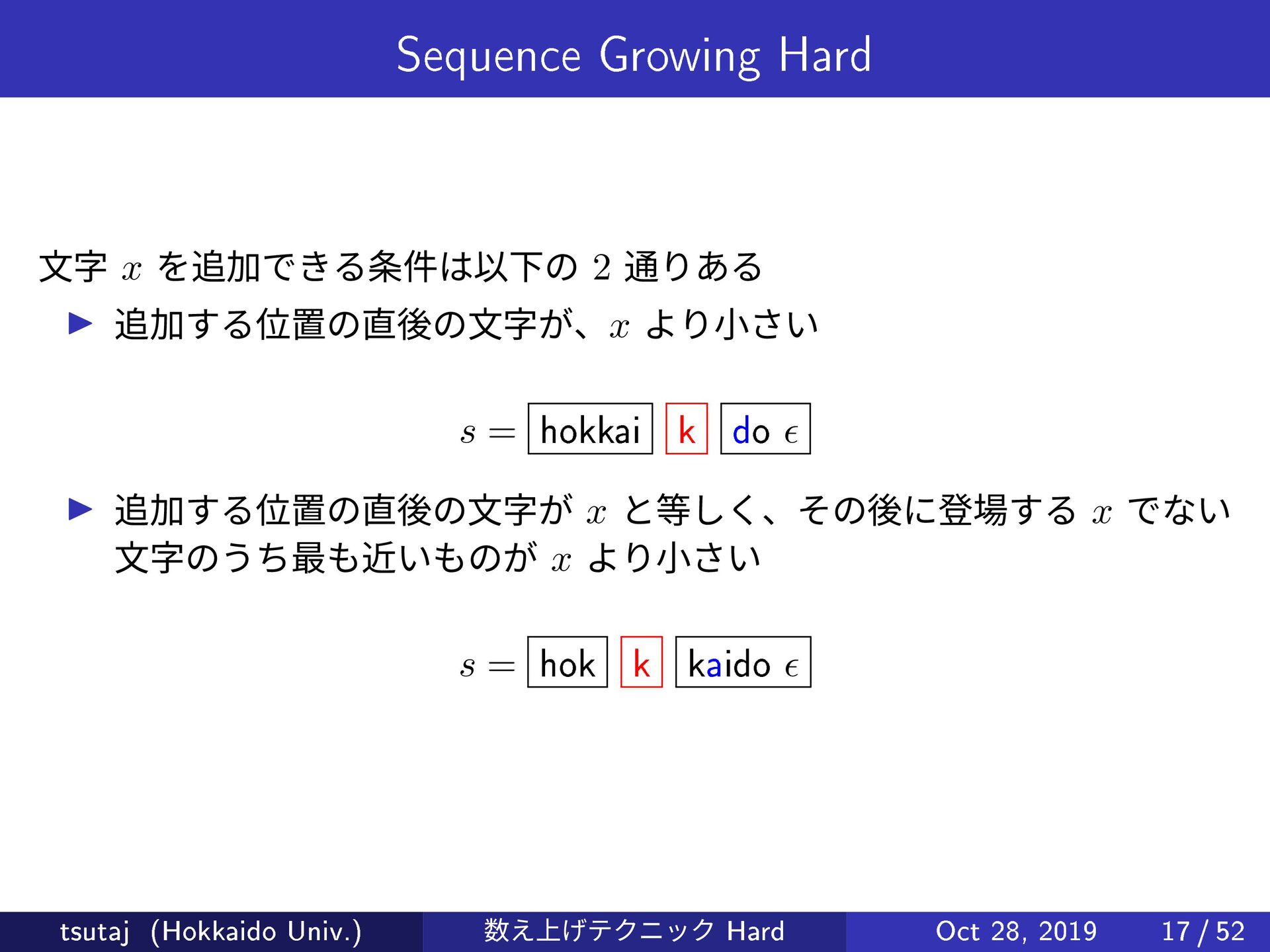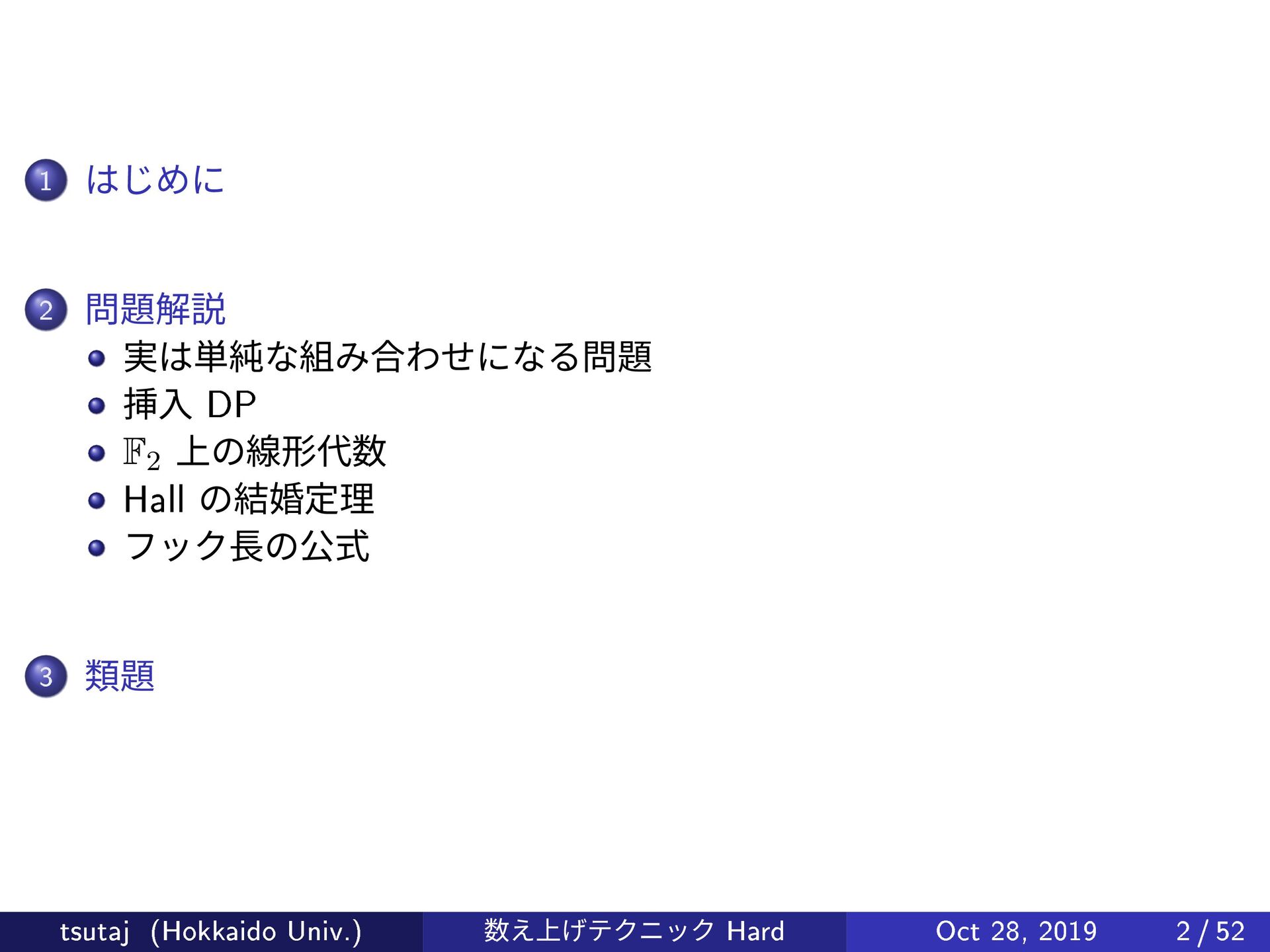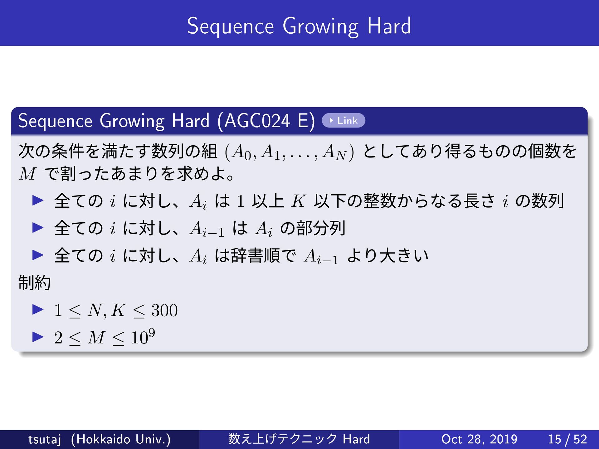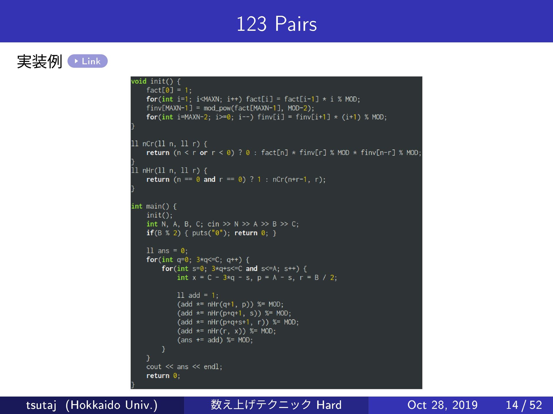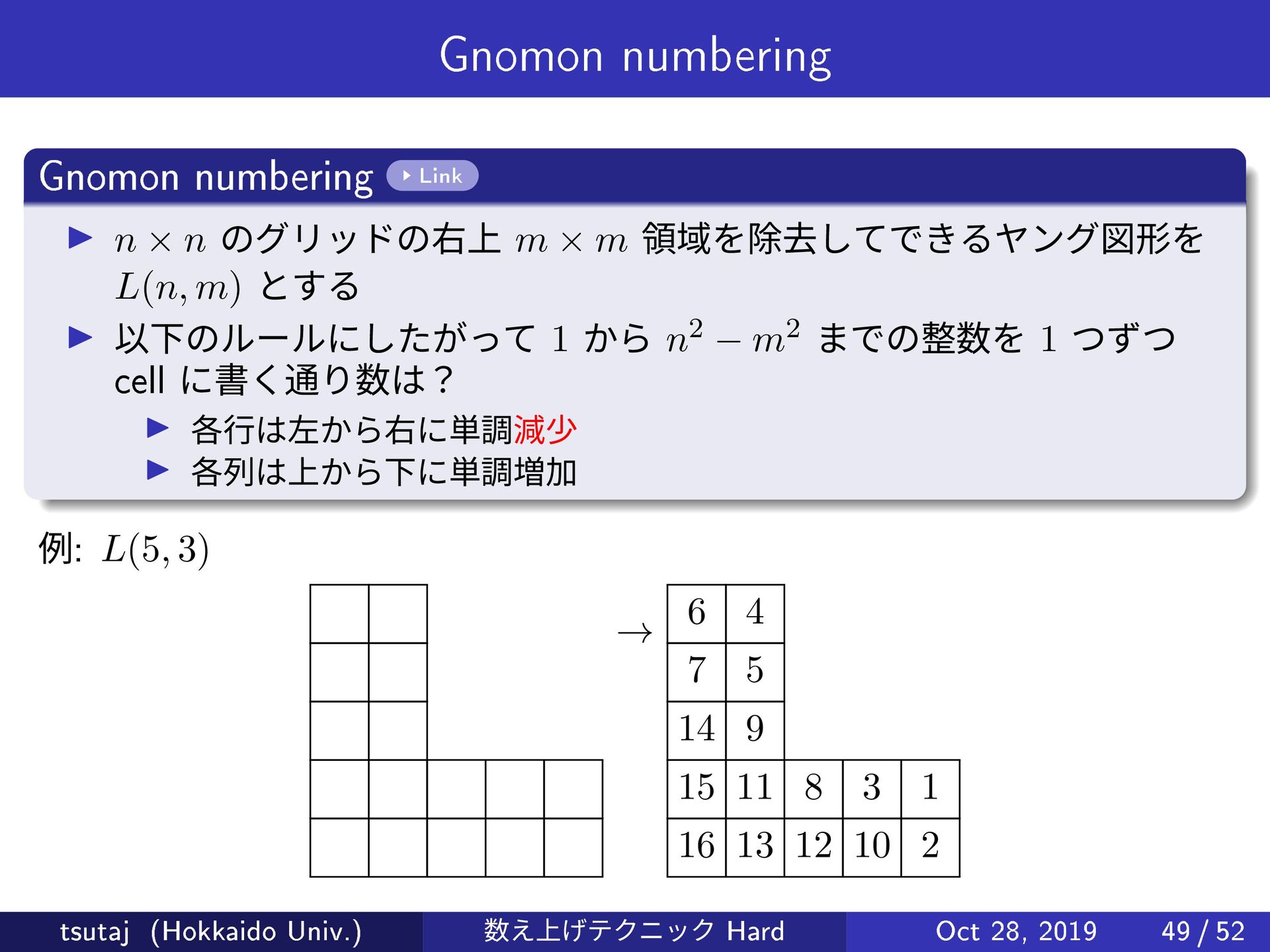 1 Ͱ͋ΔϖΞʯʹ͢Δ ▶ ྫ: (7, 8) ▶ ྡΓ߹͏ 6 ݸΛɺ3 ͭͷʮ͕ࠩ 3 Ͱ͋ΔϖΞʯʹ͢Δ ▶ ྫ: (1, 4), (2, 5), (3, 6) ▶ ྡΓ߹͏ 4 + 2x ݸΛɺ ʮࠩ 2 ͷϖΞʯ ɺ ʮࠩ 3 ͷϖΞʯ ɺ ʮࠩ 3 ͷϖΞʯ ɺ · · · ɺ ʮࠩ 3 ͷϖΞʯ ɺ ʮࠩ 2 ͷϖΞʯʹ͢Δ ▶ ྫ: (1, 3), (2, 5), (4, 7), (6, 9), (8, 11), (10, 12) ▶ ྡΓ߹͏ 4 ݸΛɺ ʮࠩ 3 ͷϖΞʯ ɺ ʮࠩ 1 ͷϖΞʯʹ͢Δ ▶ ྫ: (3, 6), (4, 5) ॻ͍ͯΈΔͱΘ͔Γ·͕͢ɺύλʔϯ͜Ε͔͋͠Γ·ͤΜ tsutaj (Hokkaido Univ.) ্͑͛ςΫχοΫ Hard Oct 28, 2019 5 / 52