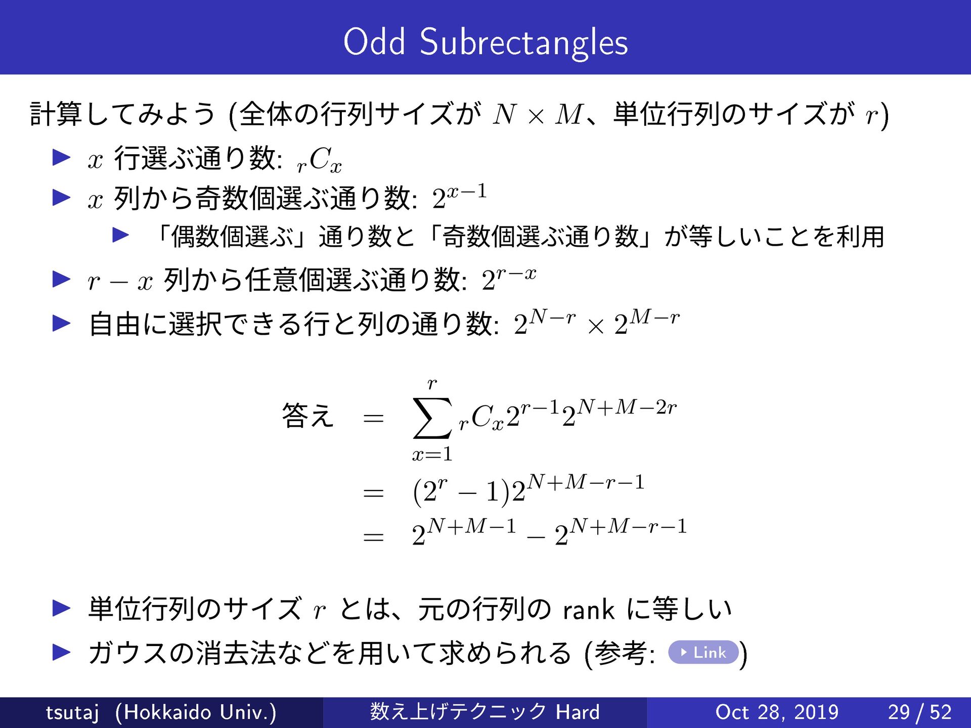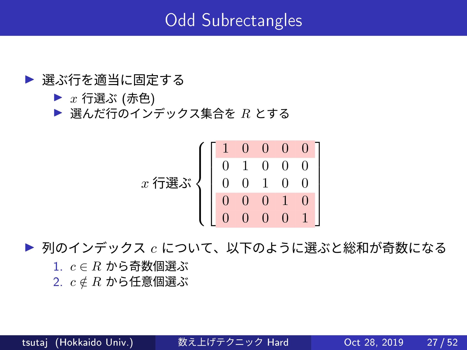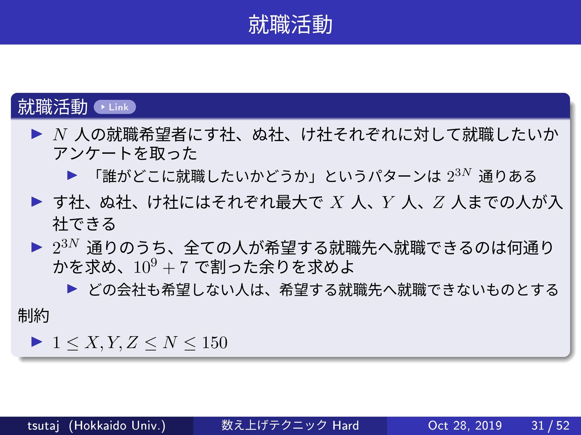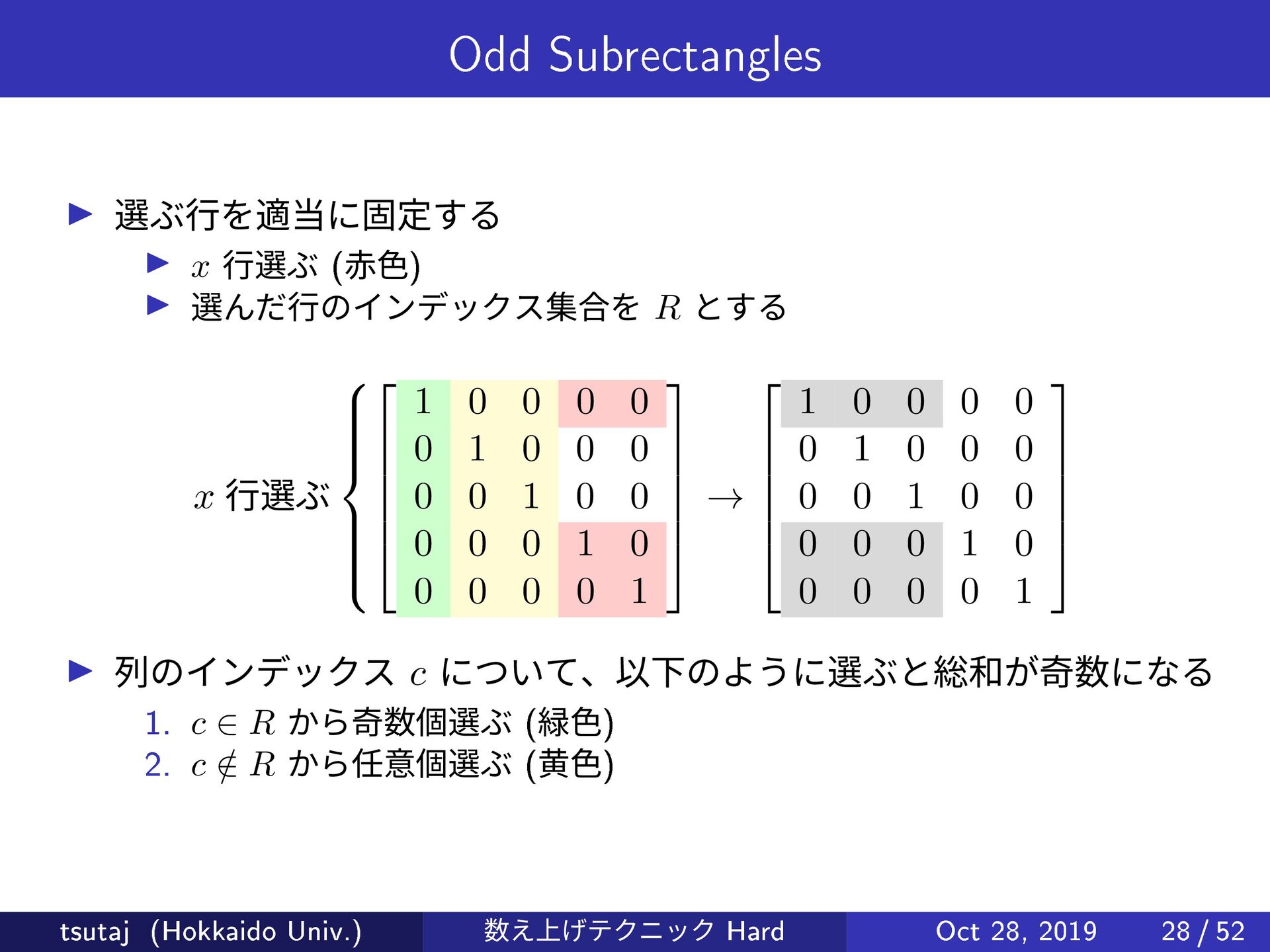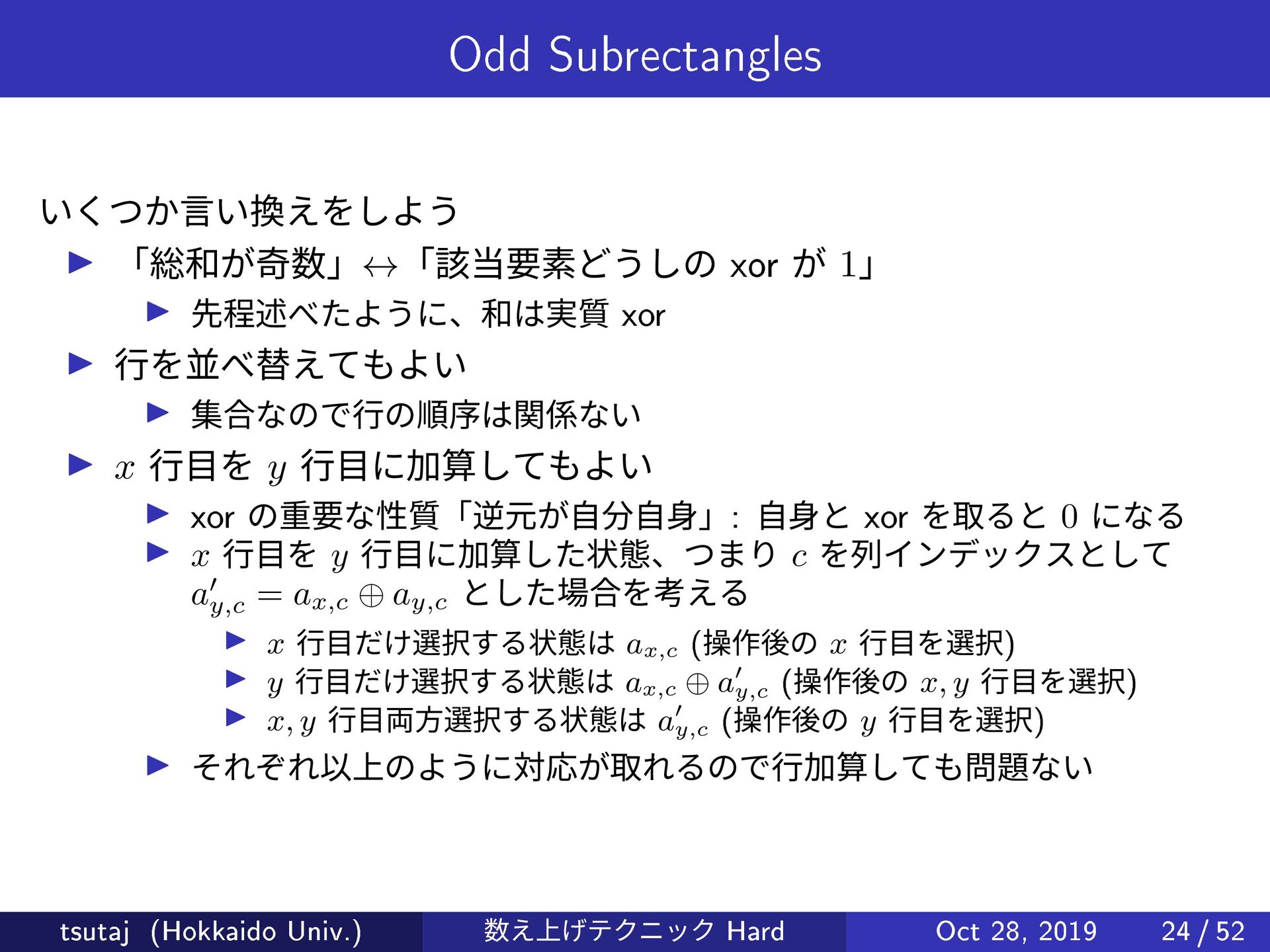 1 Ͱ͋ΔϖΞʯʹ͢Δ ▶ ྫ: (7, 8) ▶ ྡΓ߹͏ 6 ݸΛɺ3 ͭͷʮ͕ࠩ 3 Ͱ͋ΔϖΞʯʹ͢Δ ▶ ྫ: (1, 4), (2, 5), (3, 6) ▶ ྡΓ߹͏ 4 + 2x ݸΛɺ ʮࠩ 2 ͷϖΞʯ ɺ ʮࠩ 3 ͷϖΞʯ ɺ ʮࠩ 3 ͷϖΞʯ ɺ · · · ɺ ʮࠩ 3 ͷϖΞʯ ɺ ʮࠩ 2 ͷϖΞʯʹ͢Δ ▶ ྫ: (1, 3), (2, 5), (4, 7), (6, 9), (8, 11), (10, 12) ▶ ྡΓ߹͏ 4 ݸΛɺ ʮࠩ 3 ͷϖΞʯ ɺ ʮࠩ 1 ͷϖΞʯʹ͢Δ ▶ ྫ: (3, 6), (4, 5) ॻ͍ͯΈΔͱΘ͔Γ·͕͢ɺύλʔϯ͜Ε͔͋͠Γ·ͤΜ tsutaj (Hokkaido Univ.) ্͑͛ςΫχοΫ Hard Oct 28, 2019 5 / 52