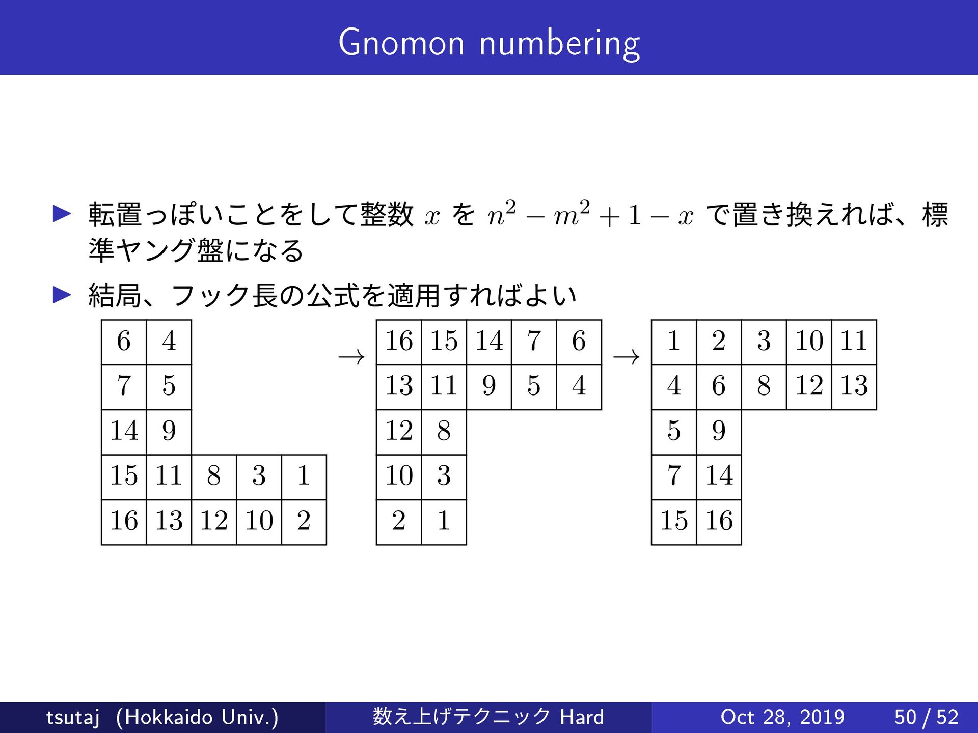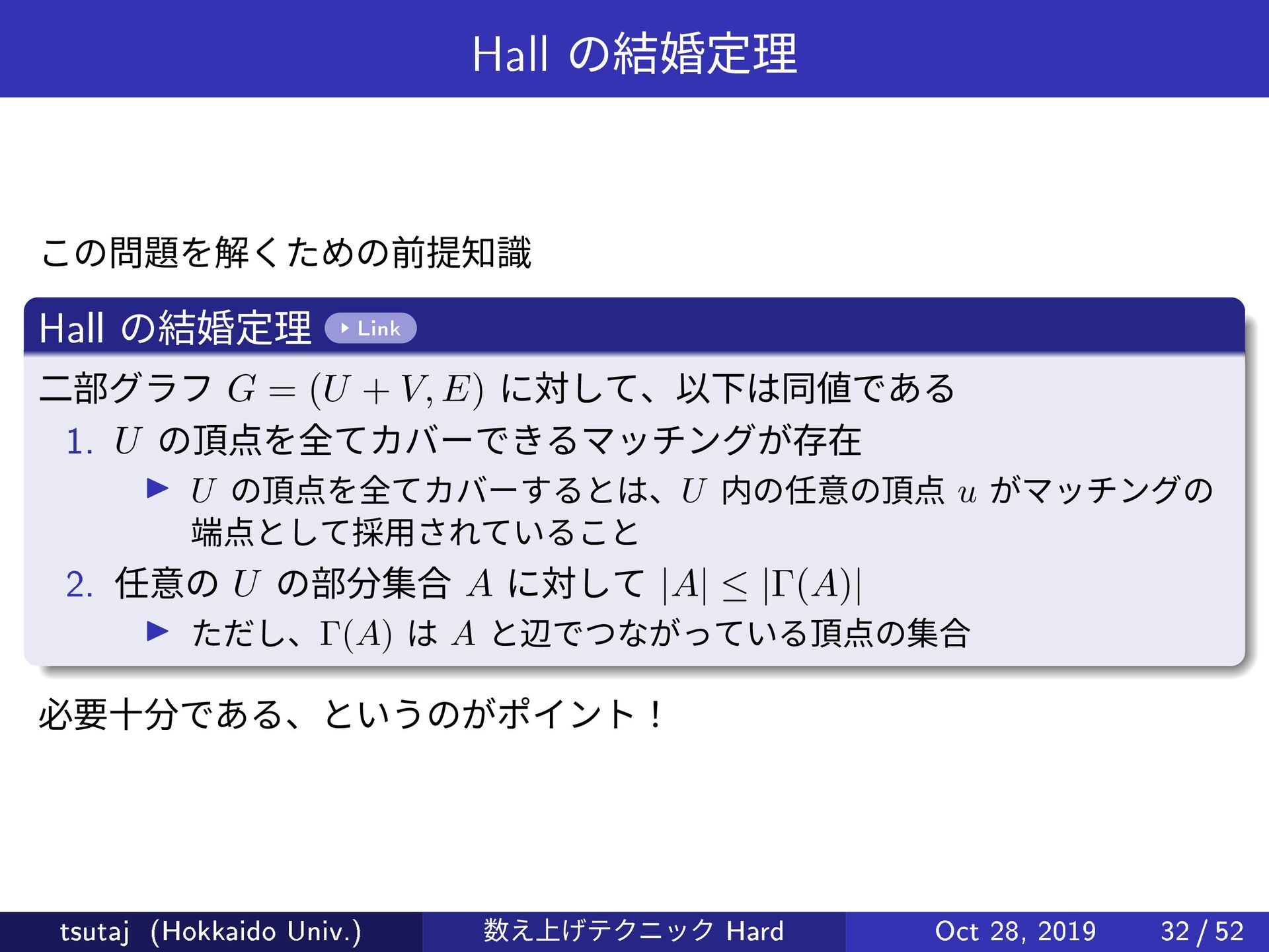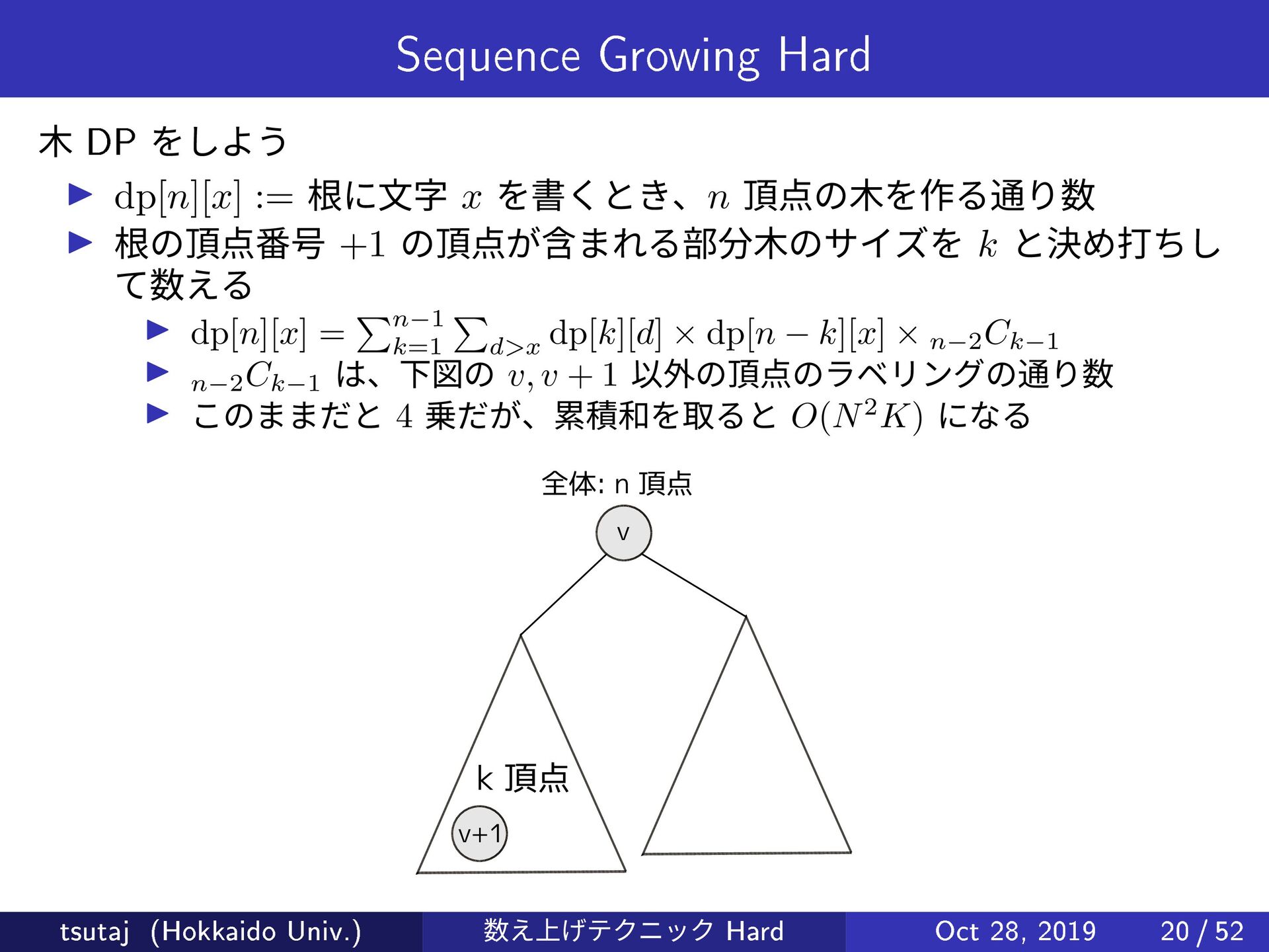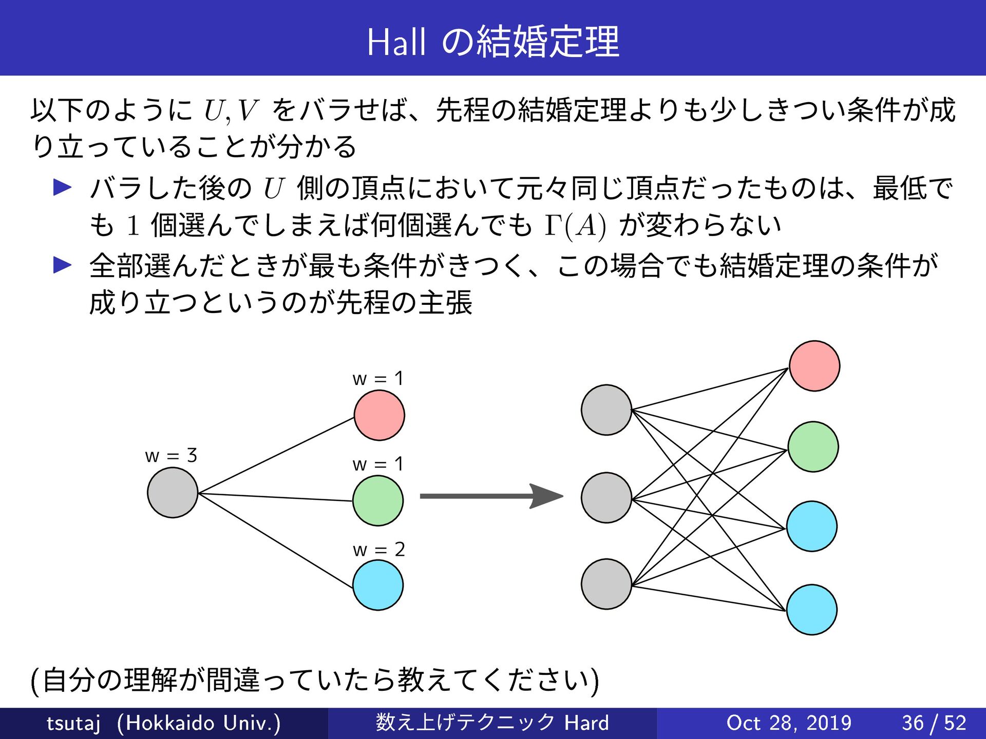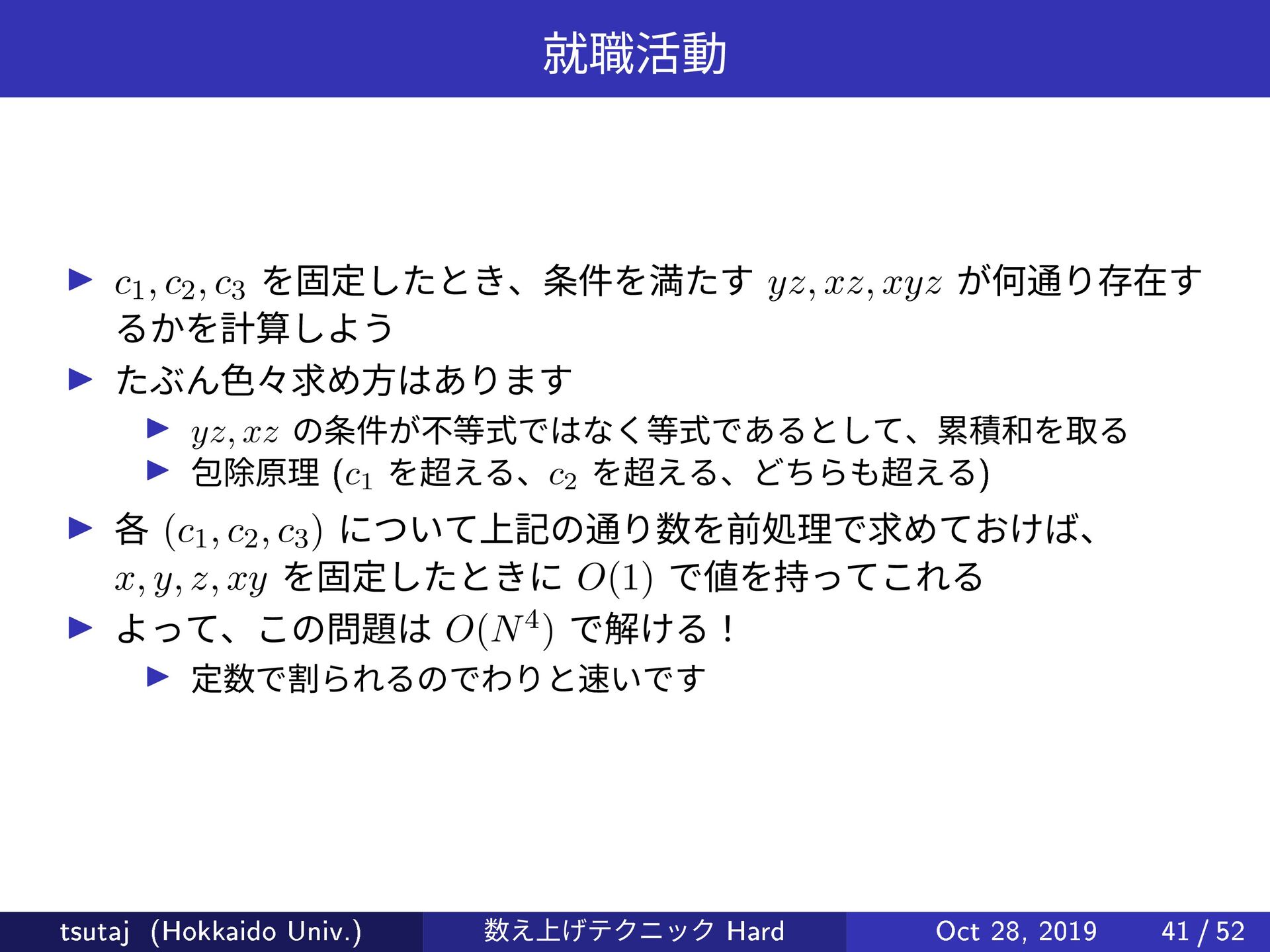 1 Ͱ͋ΔϖΞʯʹ͢Δ ▶ ྫ: (7, 8) ▶ ྡΓ߹͏ 6 ݸΛɺ3 ͭͷʮ͕ࠩ 3 Ͱ͋ΔϖΞʯʹ͢Δ ▶ ྫ: (1, 4), (2, 5), (3, 6) ▶ ྡΓ߹͏ 4 + 2x ݸΛɺ ʮࠩ 2 ͷϖΞʯ ɺ ʮࠩ 3 ͷϖΞʯ ɺ ʮࠩ 3 ͷϖΞʯ ɺ · · · ɺ ʮࠩ 3 ͷϖΞʯ ɺ ʮࠩ 2 ͷϖΞʯʹ͢Δ ▶ ྫ: (1, 3), (2, 5), (4, 7), (6, 9), (8, 11), (10, 12) ▶ ྡΓ߹͏ 4 ݸΛɺ ʮࠩ 3 ͷϖΞʯ ɺ ʮࠩ 1 ͷϖΞʯʹ͢Δ ▶ ྫ: (3, 6), (4, 5) ॻ͍ͯΈΔͱΘ͔Γ·͕͢ɺύλʔϯ͜Ε͔͋͠Γ·ͤΜ tsutaj (Hokkaido Univ.) ্͑͛ςΫχοΫ Hard Oct 28, 2019 5 / 52