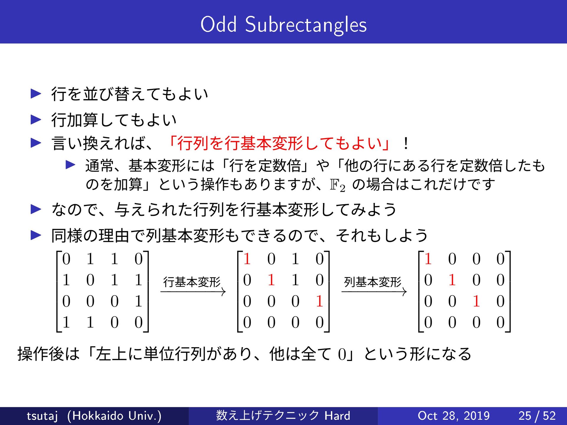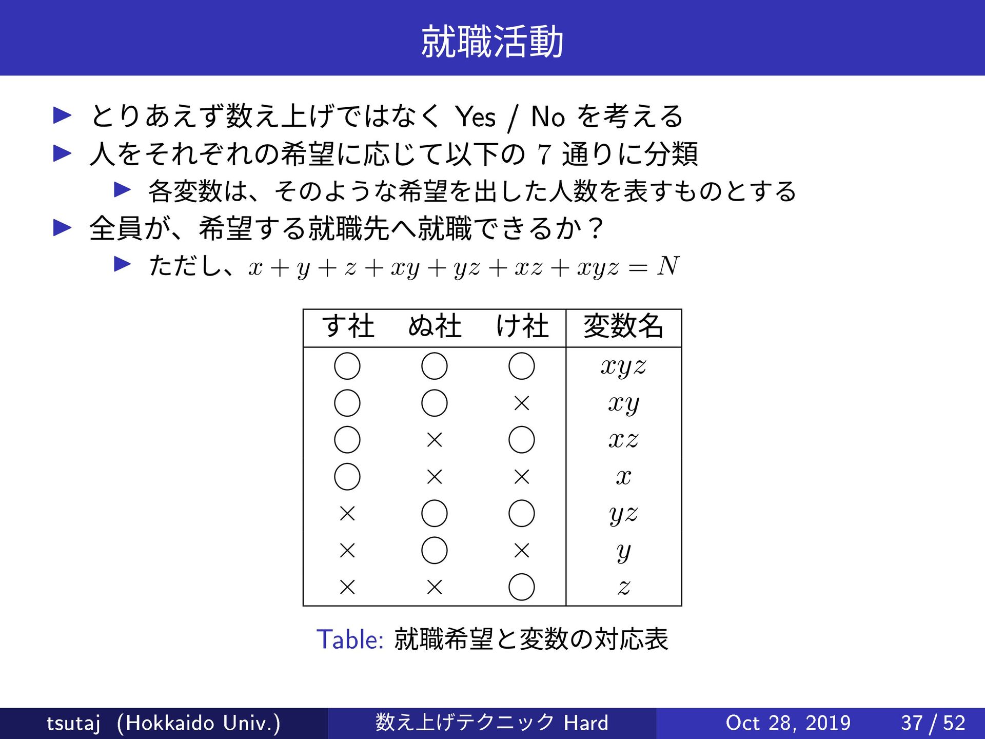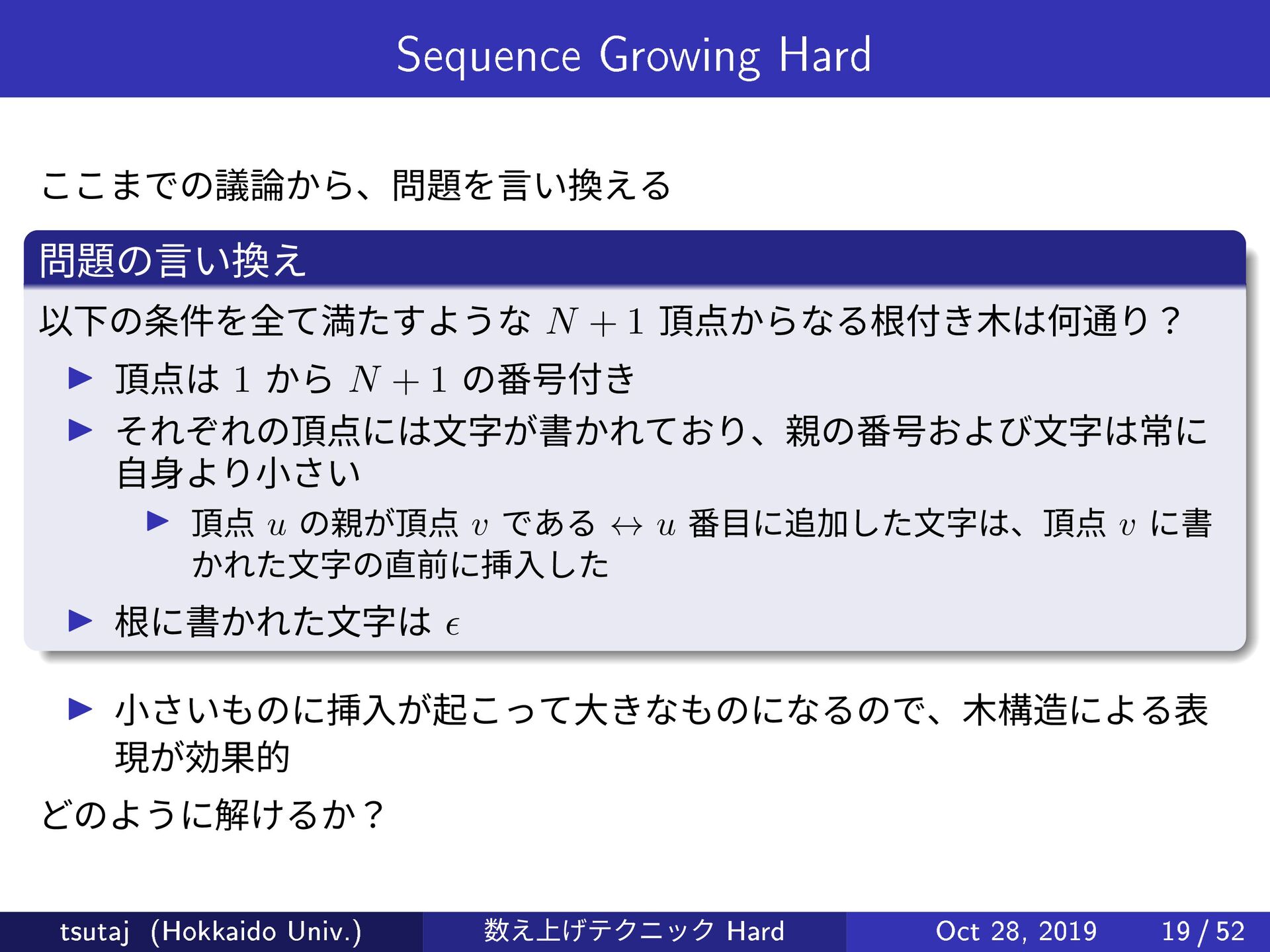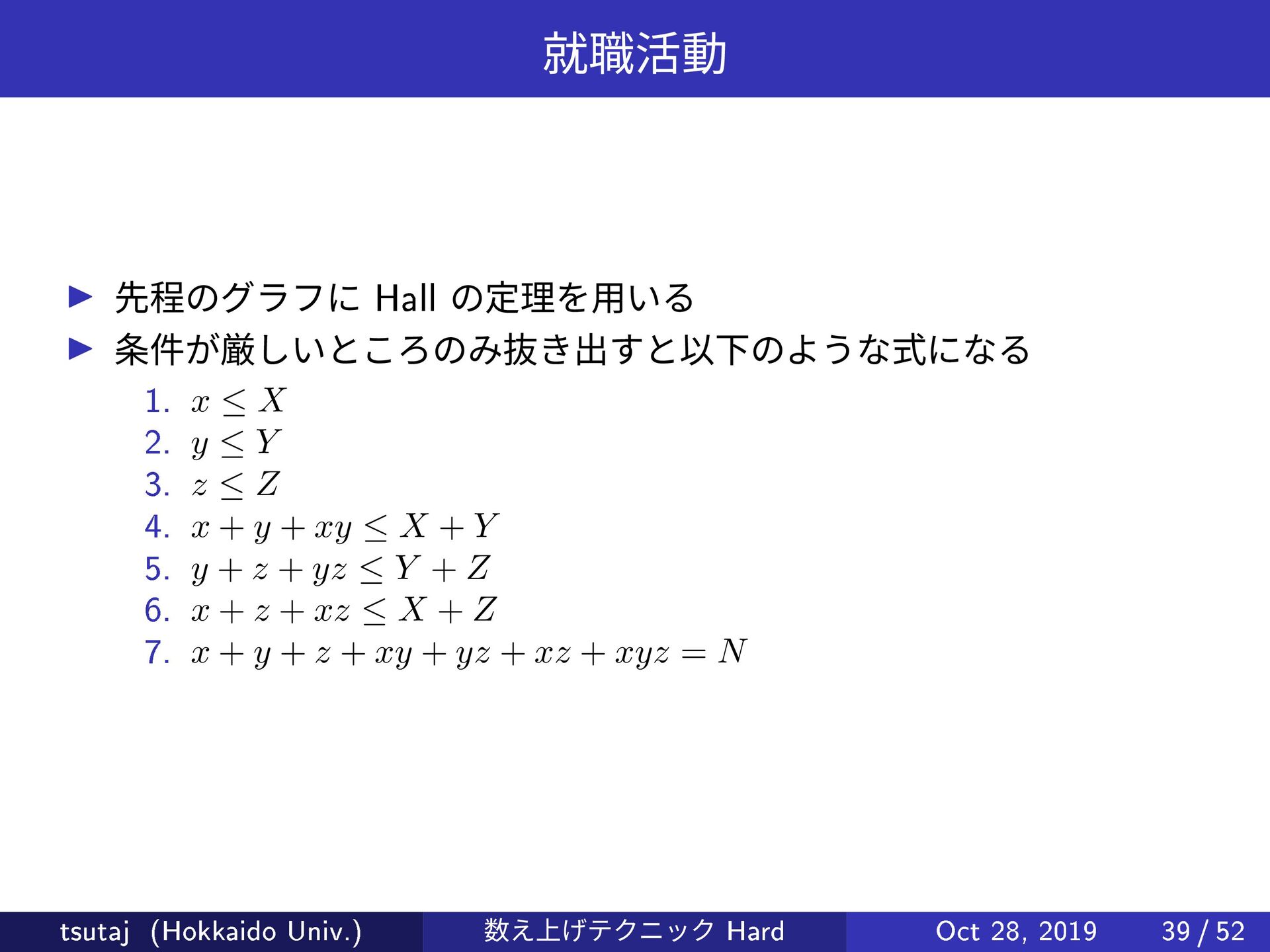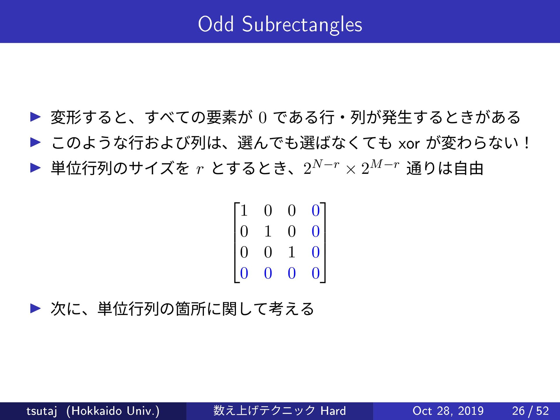 1 Ͱ͋ΔϖΞʯʹ͢Δ ▶ ྫ: (7, 8) ▶ ྡΓ߹͏ 6 ݸΛɺ3 ͭͷʮ͕ࠩ 3 Ͱ͋ΔϖΞʯʹ͢Δ ▶ ྫ: (1, 4), (2, 5), (3, 6) ▶ ྡΓ߹͏ 4 + 2x ݸΛɺ ʮࠩ 2 ͷϖΞʯ ɺ ʮࠩ 3 ͷϖΞʯ ɺ ʮࠩ 3 ͷϖΞʯ ɺ · · · ɺ ʮࠩ 3 ͷϖΞʯ ɺ ʮࠩ 2 ͷϖΞʯʹ͢Δ ▶ ྫ: (1, 3), (2, 5), (4, 7), (6, 9), (8, 11), (10, 12) ▶ ྡΓ߹͏ 4 ݸΛɺ ʮࠩ 3 ͷϖΞʯ ɺ ʮࠩ 1 ͷϖΞʯʹ͢Δ ▶ ྫ: (3, 6), (4, 5) ॻ͍ͯΈΔͱΘ͔Γ·͕͢ɺύλʔϯ͜Ε͔͋͠Γ·ͤΜ tsutaj (Hokkaido Univ.) ্͑͛ςΫχοΫ Hard Oct 28, 2019 5 / 52