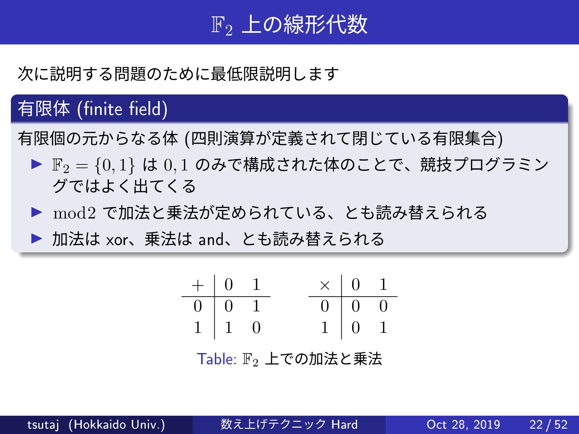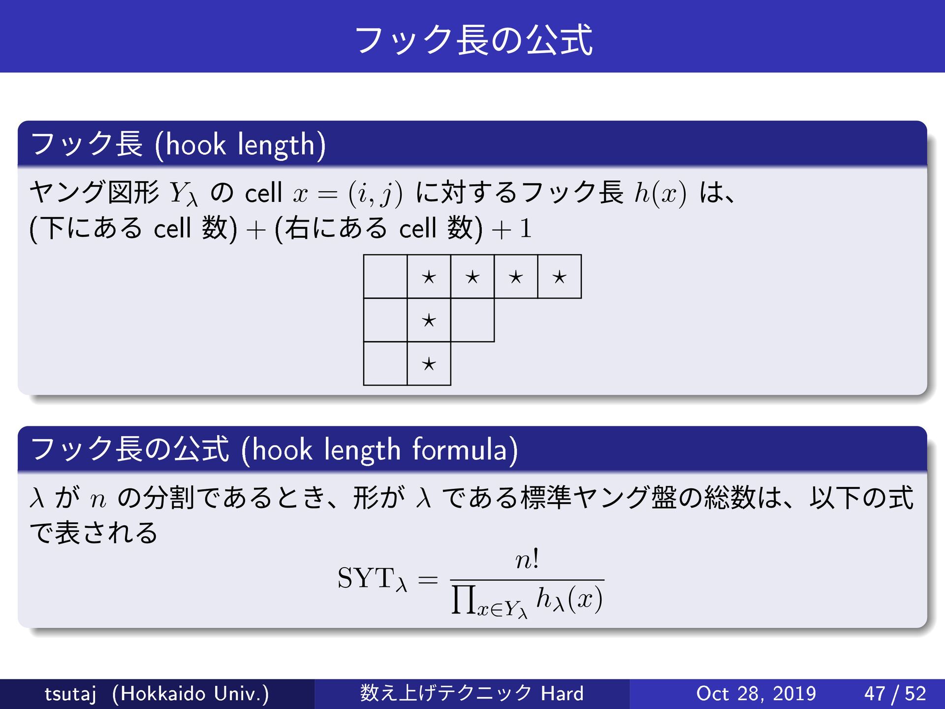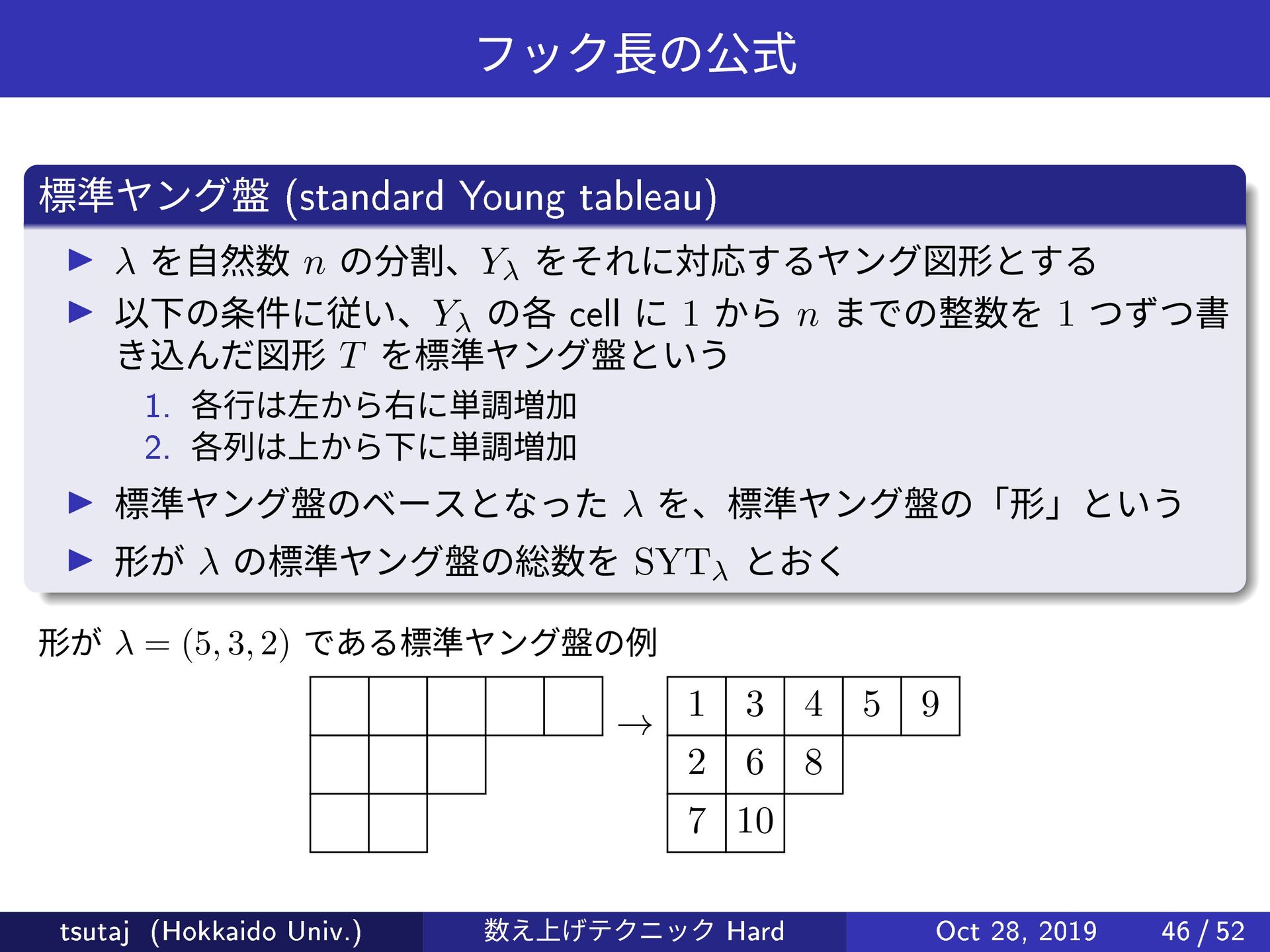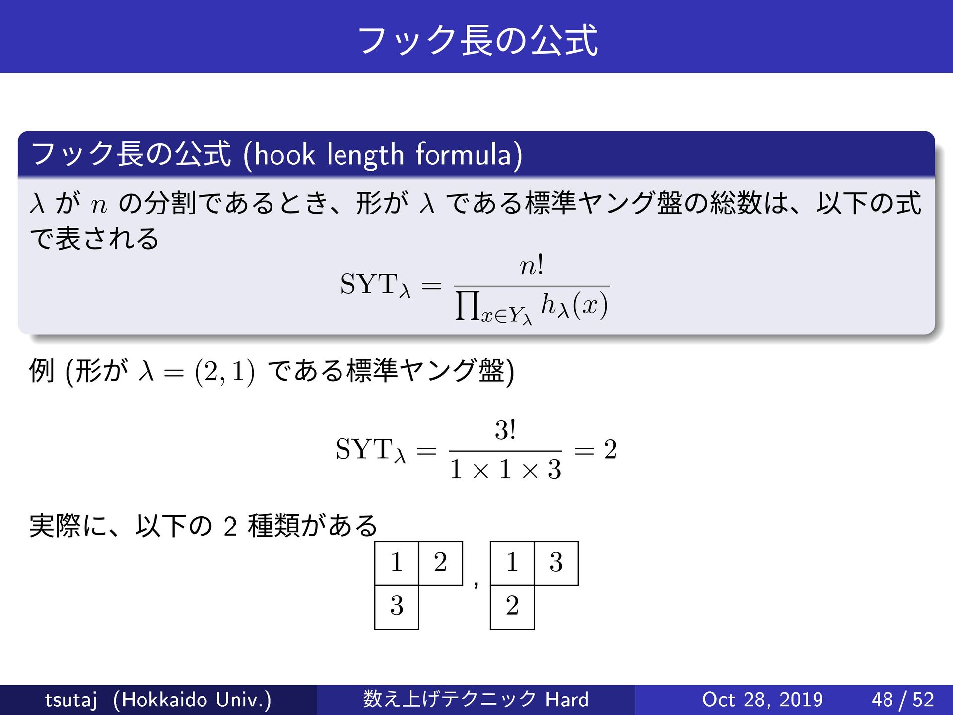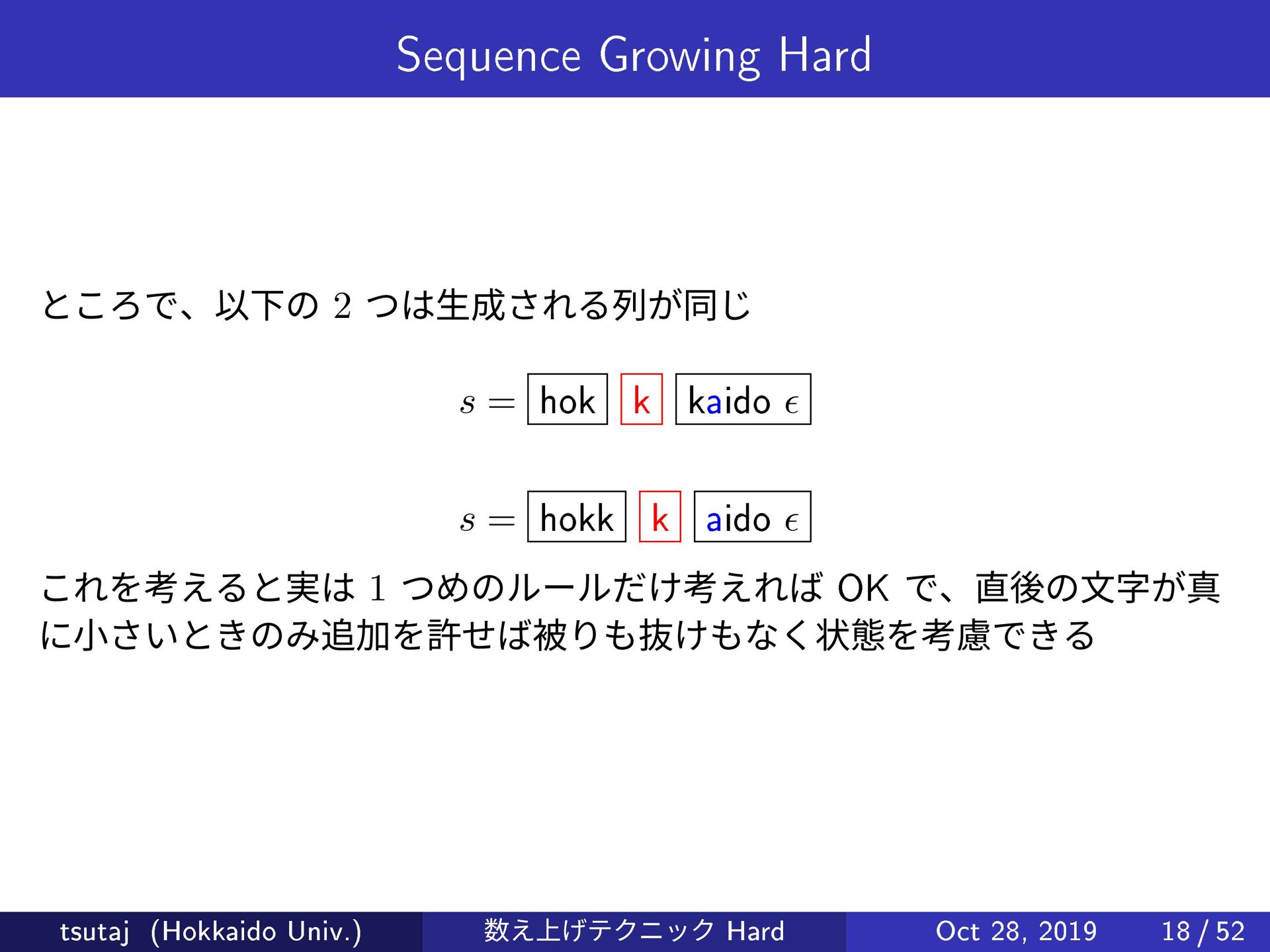 1 Ͱ͋ΔϖΞʯʹ͢Δ ▶ ྫ: (7, 8) ▶ ྡΓ߹͏ 6 ݸΛɺ3 ͭͷʮ͕ࠩ 3 Ͱ͋ΔϖΞʯʹ͢Δ ▶ ྫ: (1, 4), (2, 5), (3, 6) ▶ ྡΓ߹͏ 4 + 2x ݸΛɺ ʮࠩ 2 ͷϖΞʯ ɺ ʮࠩ 3 ͷϖΞʯ ɺ ʮࠩ 3 ͷϖΞʯ ɺ · · · ɺ ʮࠩ 3 ͷϖΞʯ ɺ ʮࠩ 2 ͷϖΞʯʹ͢Δ ▶ ྫ: (1, 3), (2, 5), (4, 7), (6, 9), (8, 11), (10, 12) ▶ ྡΓ߹͏ 4 ݸΛɺ ʮࠩ 3 ͷϖΞʯ ɺ ʮࠩ 1 ͷϖΞʯʹ͢Δ ▶ ྫ: (3, 6), (4, 5) ॻ͍ͯΈΔͱΘ͔Γ·͕͢ɺύλʔϯ͜Ε͔͋͠Γ·ͤΜ tsutaj (Hokkaido Univ.) ্͑͛ςΫχοΫ Hard Oct 28, 2019 5 / 52