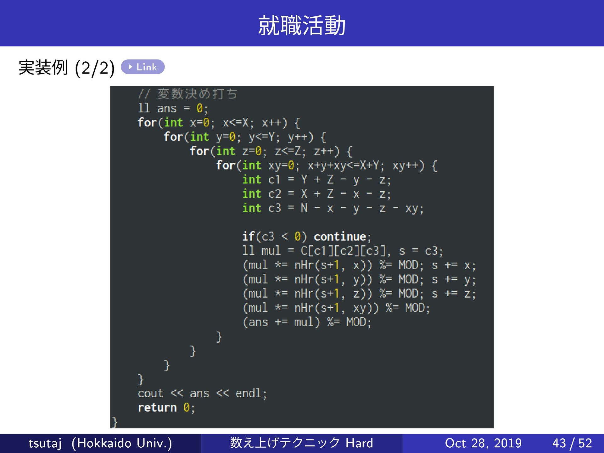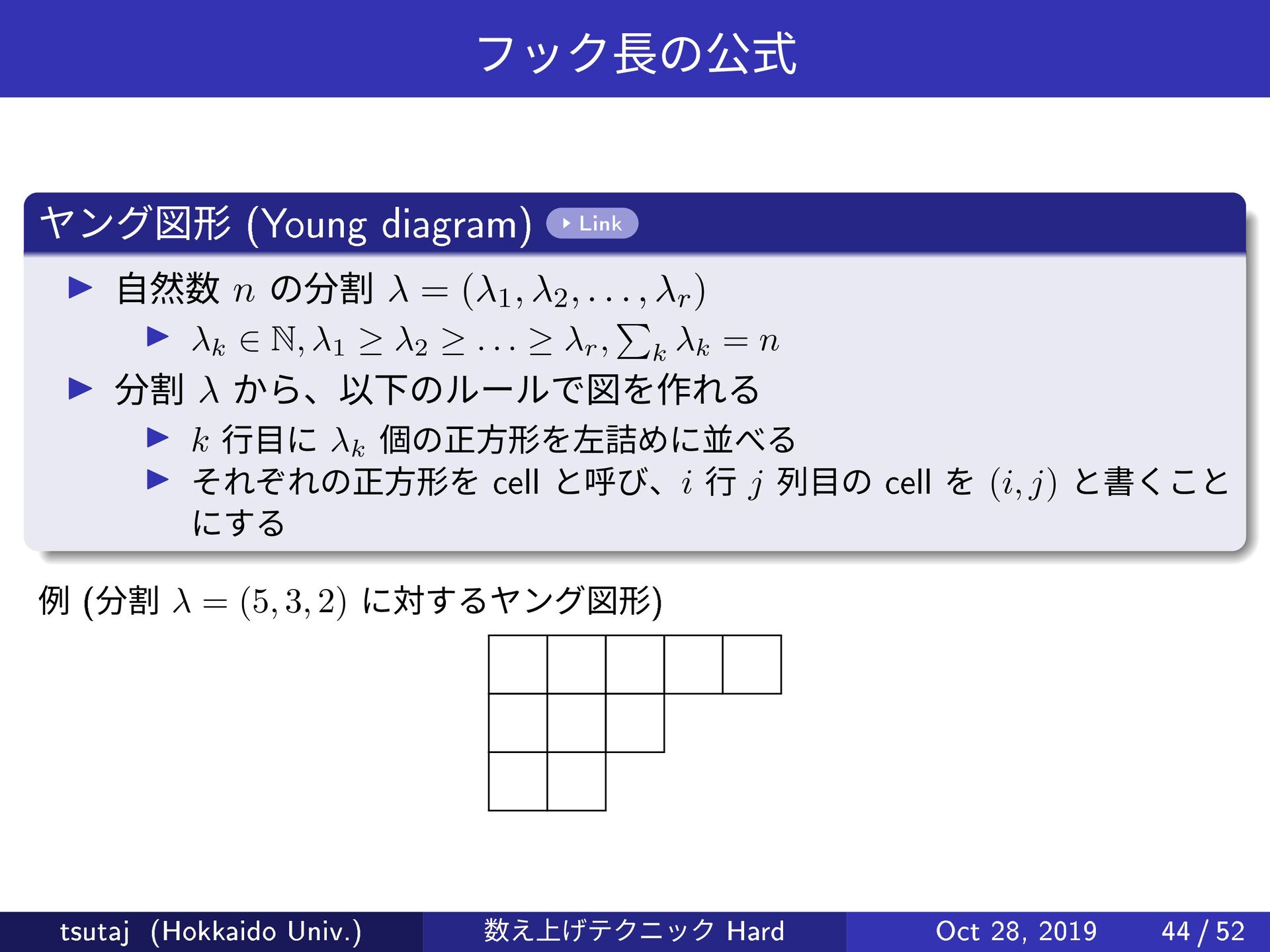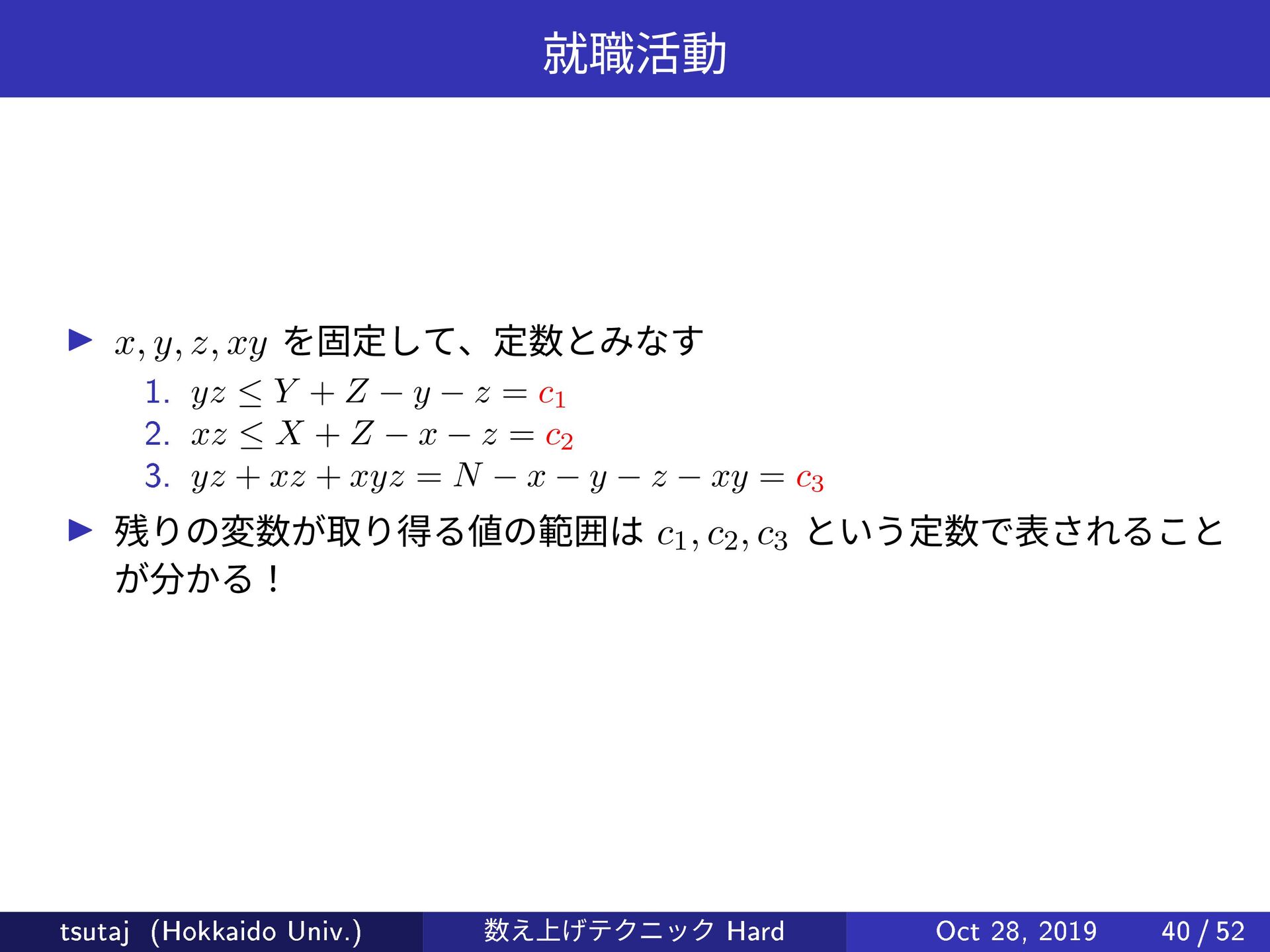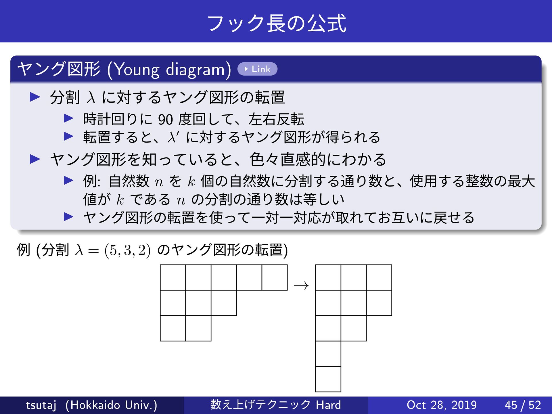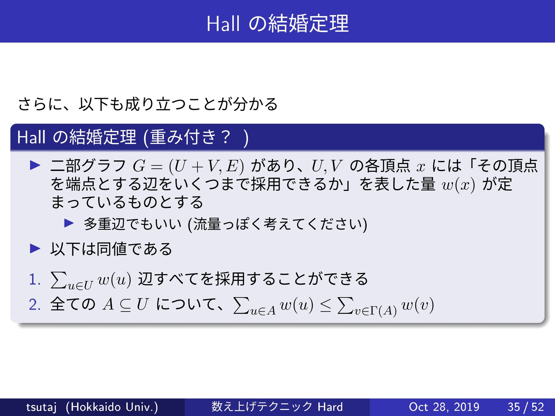 1 Ͱ͋ΔϖΞʯʹ͢Δ ▶ ྫ: (7, 8) ▶ ྡΓ߹͏ 6 ݸΛɺ3 ͭͷʮ͕ࠩ 3 Ͱ͋ΔϖΞʯʹ͢Δ ▶ ྫ: (1, 4), (2, 5), (3, 6) ▶ ྡΓ߹͏ 4 + 2x ݸΛɺ ʮࠩ 2 ͷϖΞʯ ɺ ʮࠩ 3 ͷϖΞʯ ɺ ʮࠩ 3 ͷϖΞʯ ɺ · · · ɺ ʮࠩ 3 ͷϖΞʯ ɺ ʮࠩ 2 ͷϖΞʯʹ͢Δ ▶ ྫ: (1, 3), (2, 5), (4, 7), (6, 9), (8, 11), (10, 12) ▶ ྡΓ߹͏ 4 ݸΛɺ ʮࠩ 3 ͷϖΞʯ ɺ ʮࠩ 1 ͷϖΞʯʹ͢Δ ▶ ྫ: (3, 6), (4, 5) ॻ͍ͯΈΔͱΘ͔Γ·͕͢ɺύλʔϯ͜Ε͔͋͠Γ·ͤΜ tsutaj (Hokkaido Univ.) ্͑͛ςΫχοΫ Hard Oct 28, 2019 5 / 52