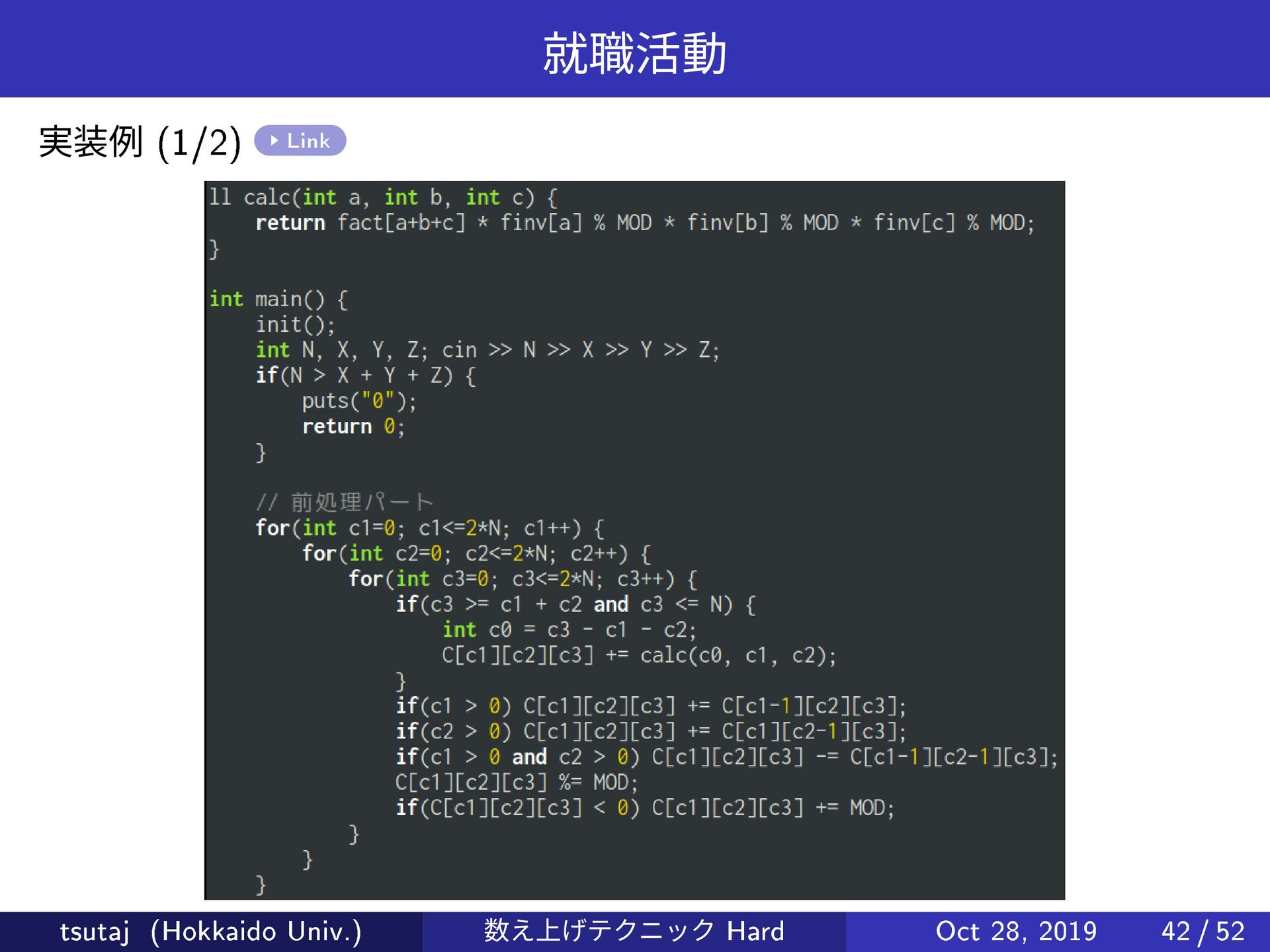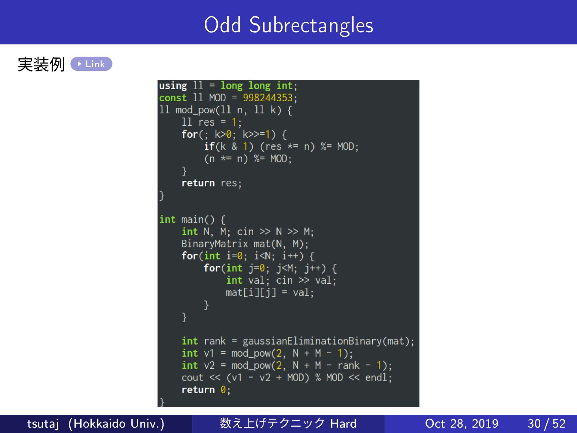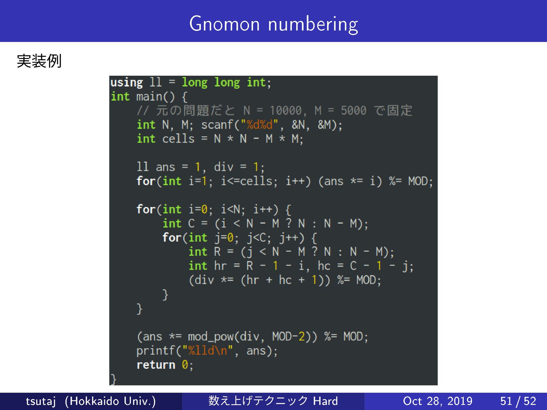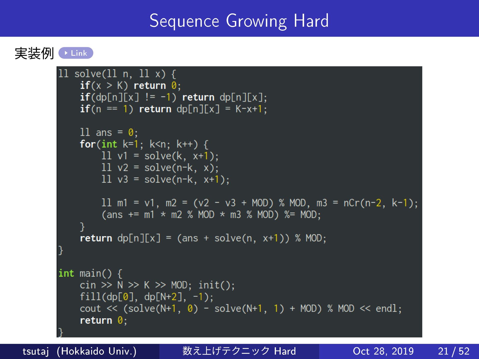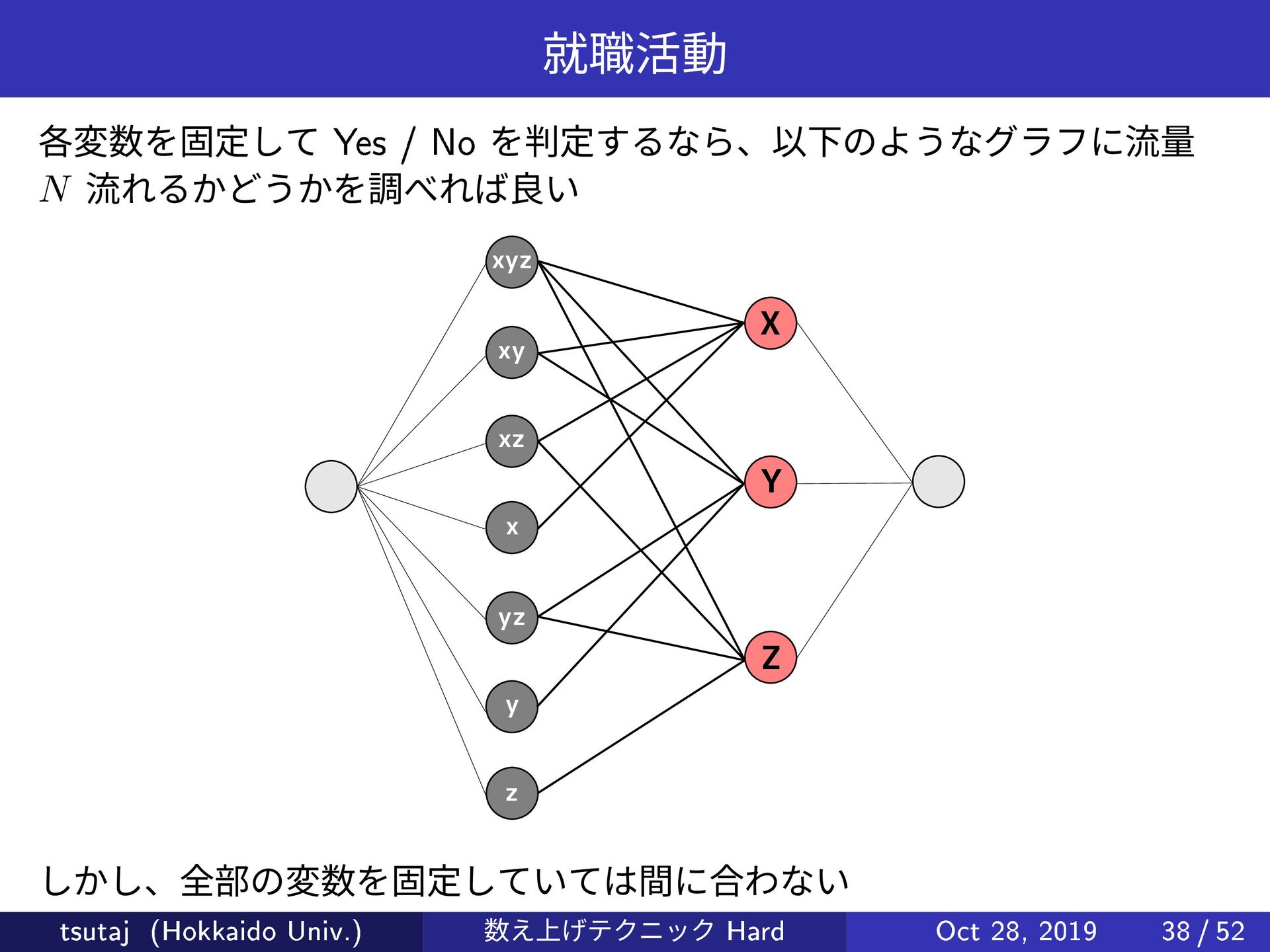 1 Ͱ͋ΔϖΞʯʹ͢Δ ▶ ྫ: (7, 8) ▶ ྡΓ߹͏ 6 ݸΛɺ3 ͭͷʮ͕ࠩ 3 Ͱ͋ΔϖΞʯʹ͢Δ ▶ ྫ: (1, 4), (2, 5), (3, 6) ▶ ྡΓ߹͏ 4 + 2x ݸΛɺ ʮࠩ 2 ͷϖΞʯ ɺ ʮࠩ 3 ͷϖΞʯ ɺ ʮࠩ 3 ͷϖΞʯ ɺ · · · ɺ ʮࠩ 3 ͷϖΞʯ ɺ ʮࠩ 2 ͷϖΞʯʹ͢Δ ▶ ྫ: (1, 3), (2, 5), (4, 7), (6, 9), (8, 11), (10, 12) ▶ ྡΓ߹͏ 4 ݸΛɺ ʮࠩ 3 ͷϖΞʯ ɺ ʮࠩ 1 ͷϖΞʯʹ͢Δ ▶ ྫ: (3, 6), (4, 5) ॻ͍ͯΈΔͱΘ͔Γ·͕͢ɺύλʔϯ͜Ε͔͋͠Γ·ͤΜ tsutaj (Hokkaido Univ.) ্͑͛ςΫχοΫ Hard Oct 28, 2019 5 / 52