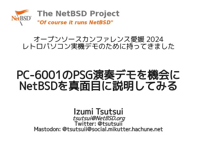 オープンソースカンファレンス2024愛媛の「NetBSDのご紹介」のセミナーで発表した『PC-6001のPSG演奏デモを機会にNetBSDを真面目に説明してみる』のスライドです。