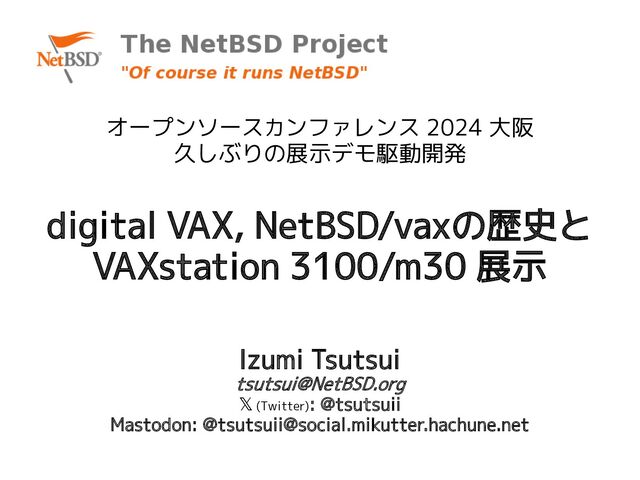 OSC2024 大阪 の NetBSDセミナーで発表した『digital VAX, NetBSD/vaxの歴史と VAXstation 3100/m30 展示 / OSC2024Osaka』のスライドです。 発表時のものから一部体裁と誤字その他を修正しています。