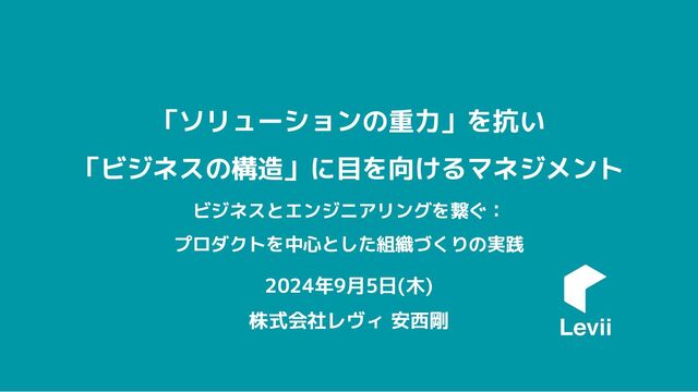 「ソリューションの重力」を抗い 「ビジネスの構造」に目を向けるマネジメント ビジネスとエンジニアリングを繋ぐ: プロダクトを中心とした組織づくりの実践 2024年9月5日(木) 株式会社レヴィ 安西剛