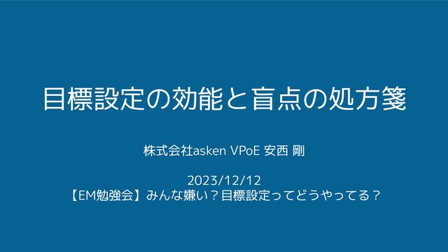 目標設定の効能と盲点の処方箋 株式会社asken VPoE 安西 剛 2023/12/12 【EM勉強会】みんな嫌い?目標設定ってどうやってる?