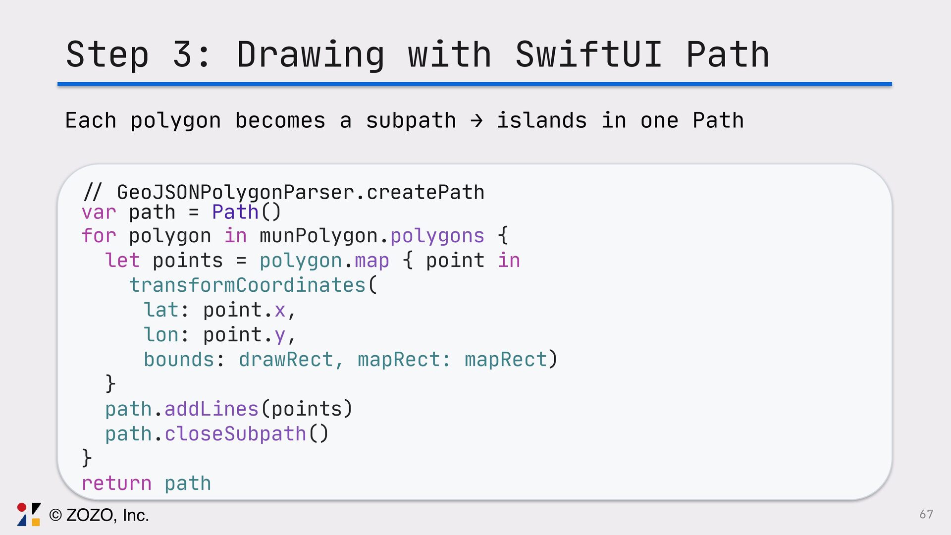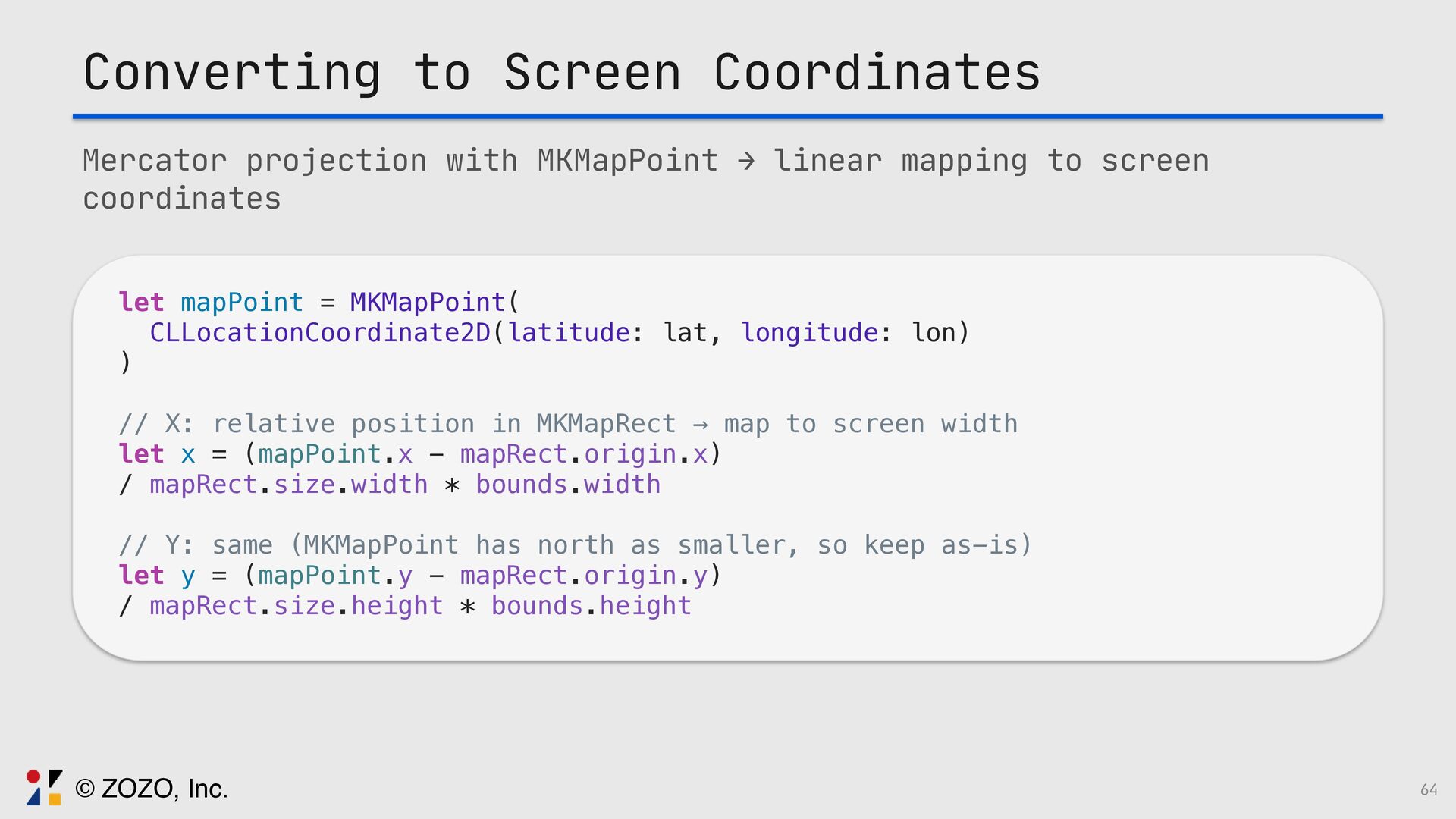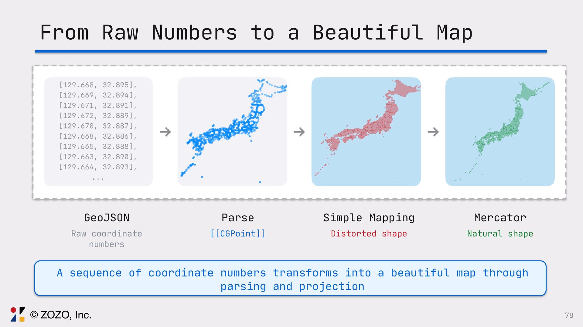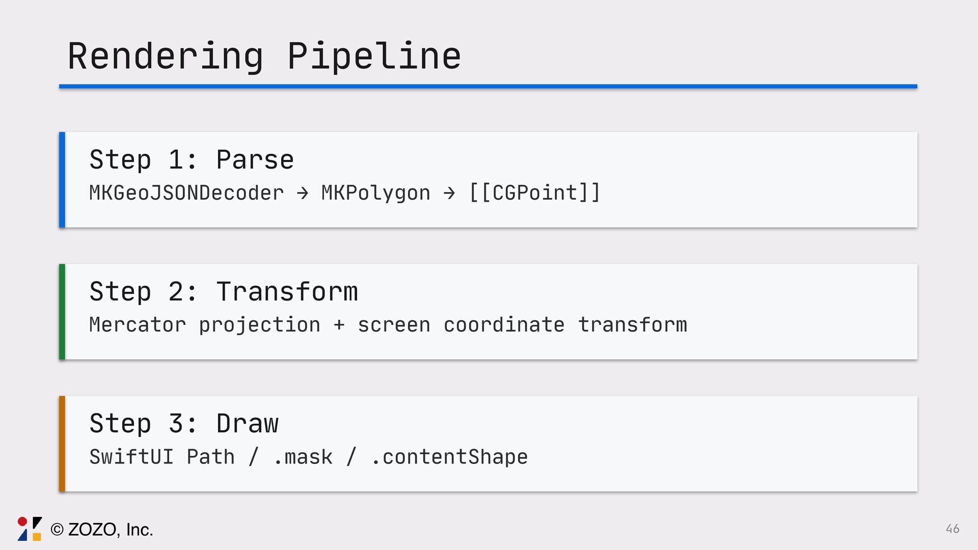 このトークでは、GeoJSONをSwiftUIで描画する方法、また実際に起きる図法由来の違和感をどう捉え、どの図法・変換・描画方法を選ぶことで「自然に見える地図」にしたのか、その設計と実装を実例とともに解説します。