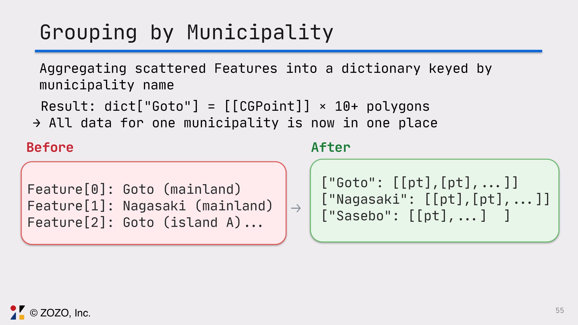 最初は手作業で地図を作っていましたが、ユーザーから市町村レベルの地図が欲しいと要望を受け、手作業だと時間がいくらあっても足りないという悩みを解決するためにGeoJSONを使った地図描画に挑戦しました。