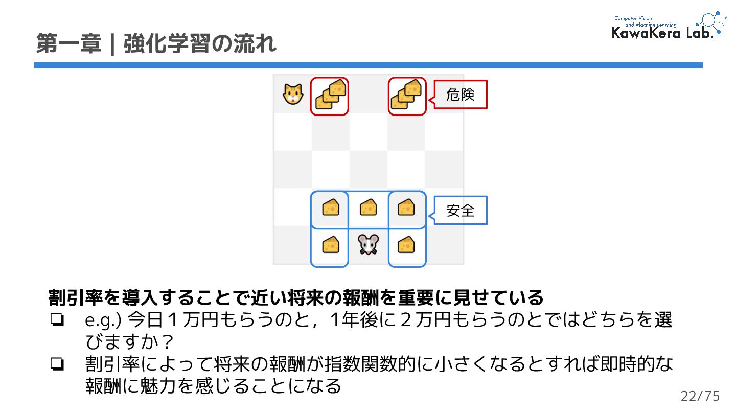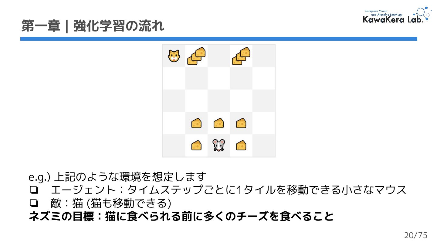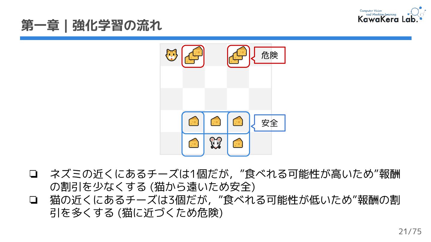a. γが大きい:割引の影響が小さい.エージェントが長期的な報酬を重視する b. γが小さい:割引の影響が大きい.エージェントが短期的な報酬を重視する 2. 各報酬はタイムステップ毎にγ (ガンマ) で割引される a. タイムステップが増加するにつれて,猫はネズミに近づくため将来の報酬が 発生する可能性は徐々に低くなる 第一章 | 強化学習の流れ 軌道 収益:累積報酬 γ:割引率 23/75