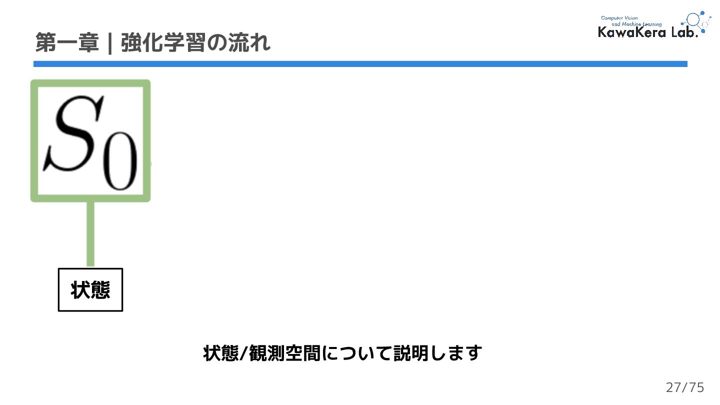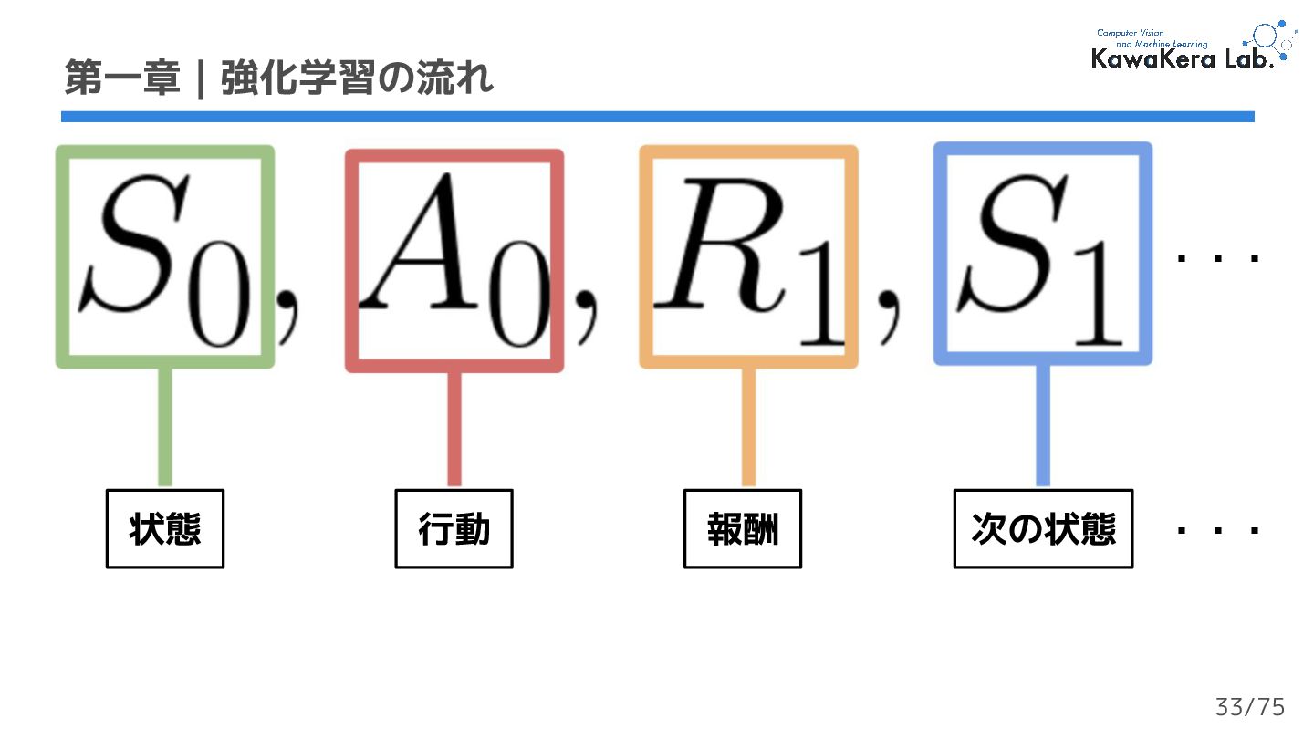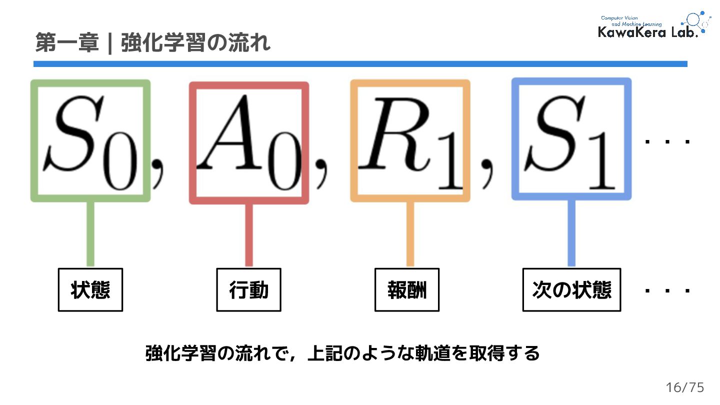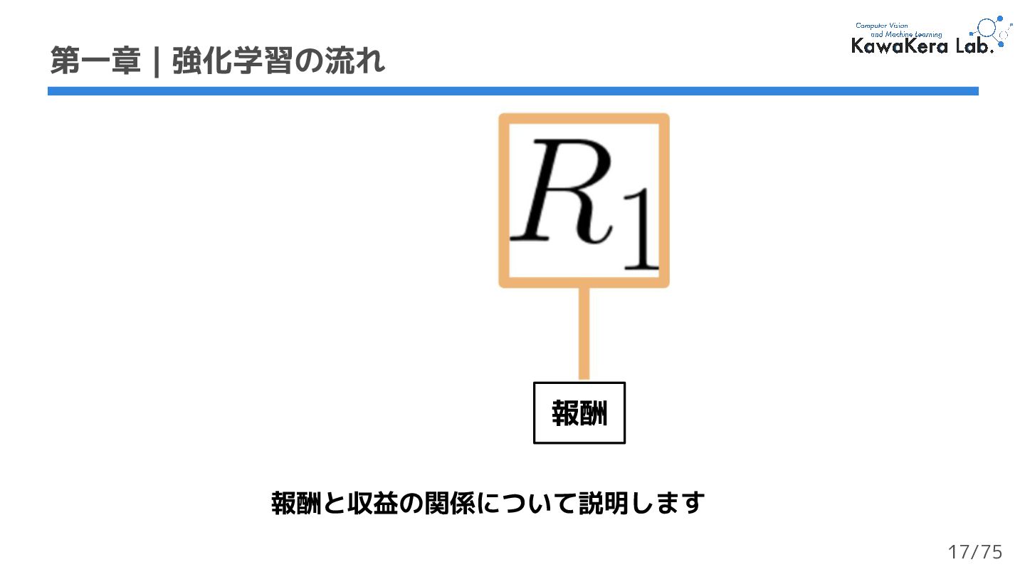 a. γが大きい:割引の影響が小さい.エージェントが長期的な報酬を重視する b. γが小さい:割引の影響が大きい.エージェントが短期的な報酬を重視する 2. 各報酬はタイムステップ毎にγ (ガンマ) で割引される a. タイムステップが増加するにつれて,猫はネズミに近づくため将来の報酬が 発生する可能性は徐々に低くなる 第一章 | 強化学習の流れ 軌道 収益:累積報酬 γ:割引率 23/75