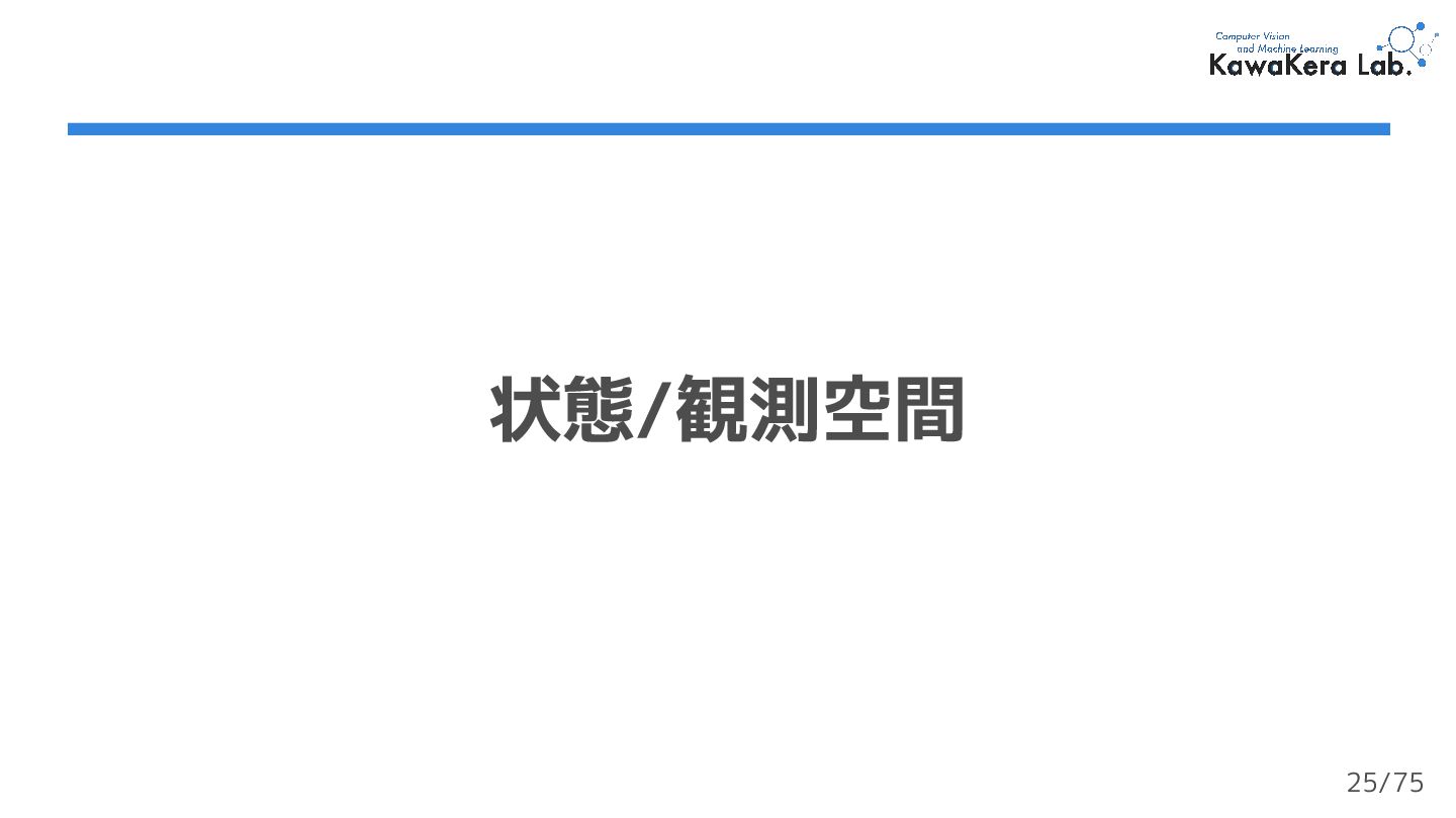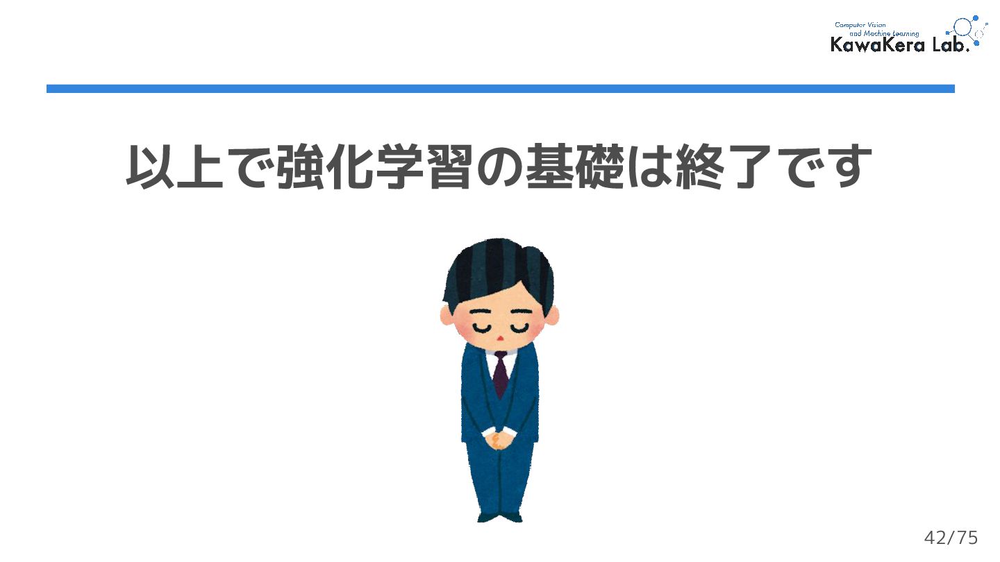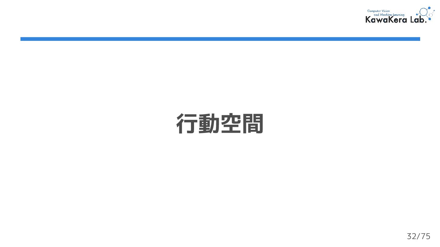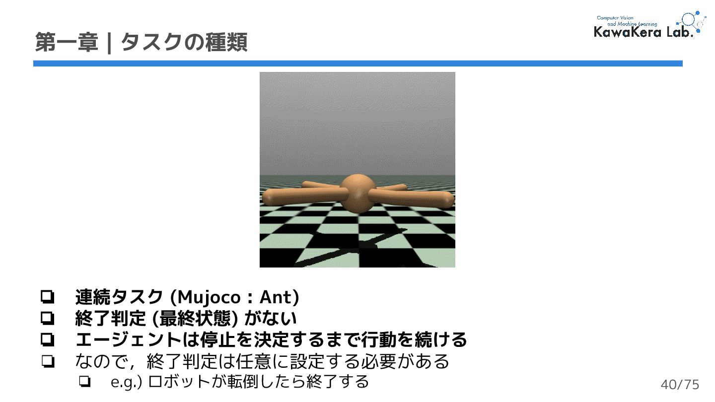 (最終状態) がない ❏ エージェントは停止を決定するまで行動を続ける ❏ なので,終了判定は任意に設定する必要がある ❏ e.g.) ロボットが転倒したら終了する 40/75