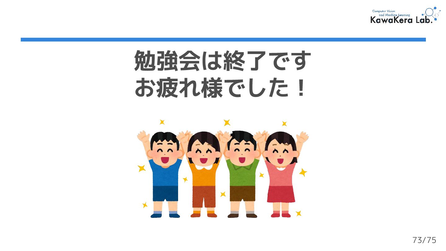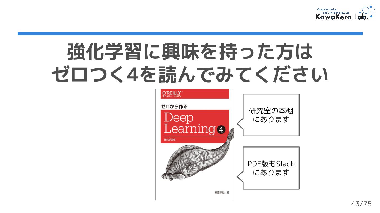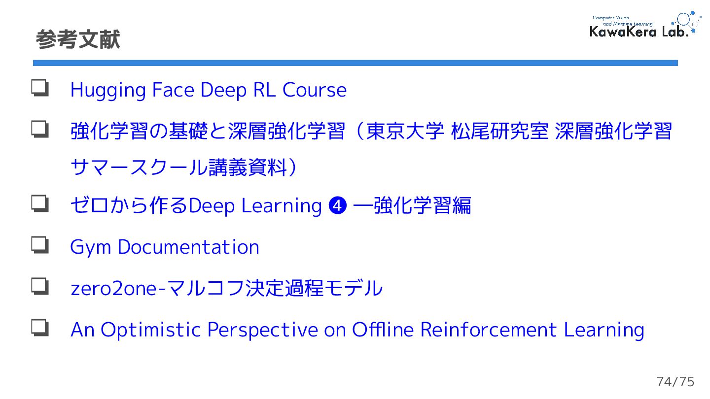 サマースクール講義資料) ❏ ゼロから作るDeep Learning ❹ ―強化学習編 ❏ Gym Documentation ❏ zero2one-マルコフ決定過程モデル ❏ An Optimistic Perspective on Offline Reinforcement Learning 参考文献 74/75