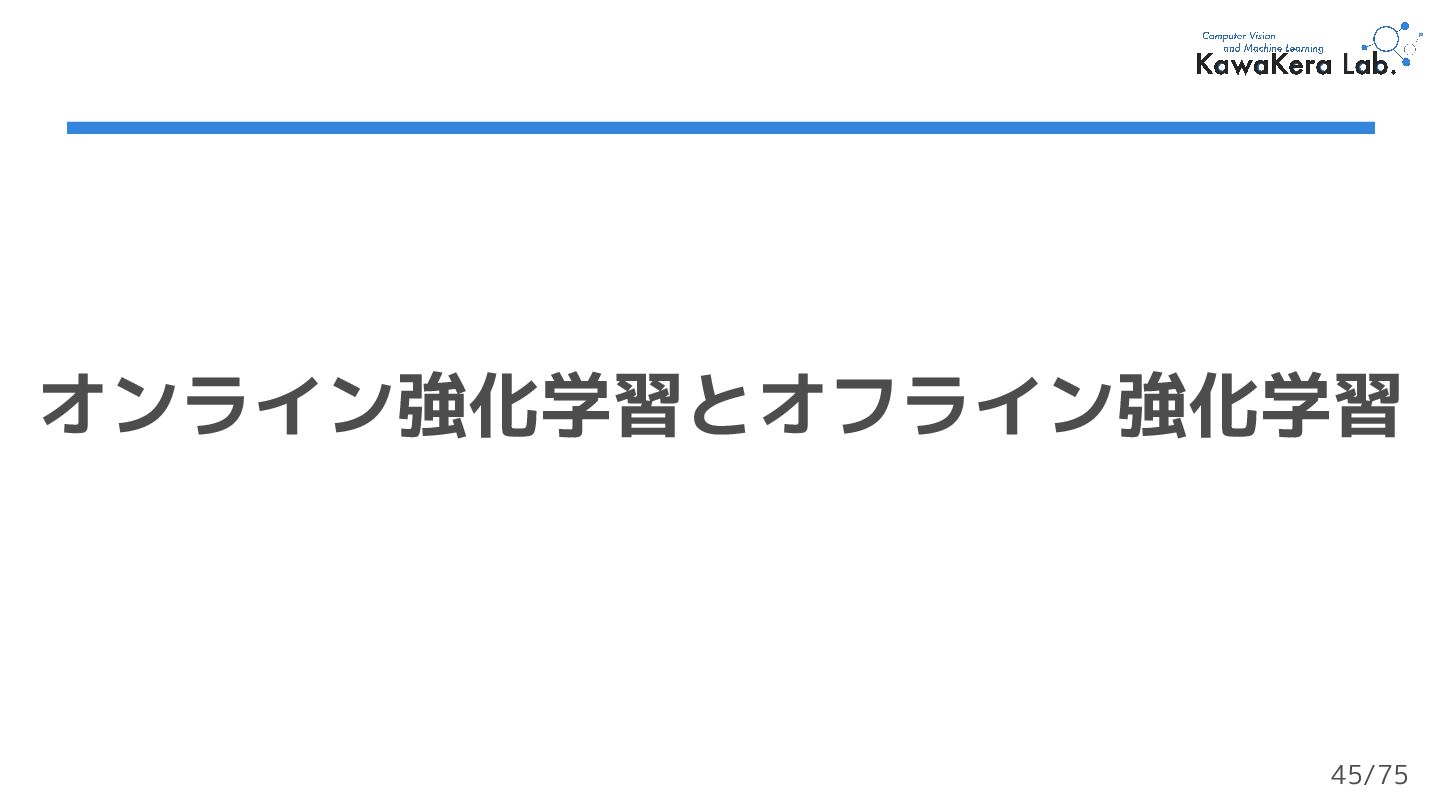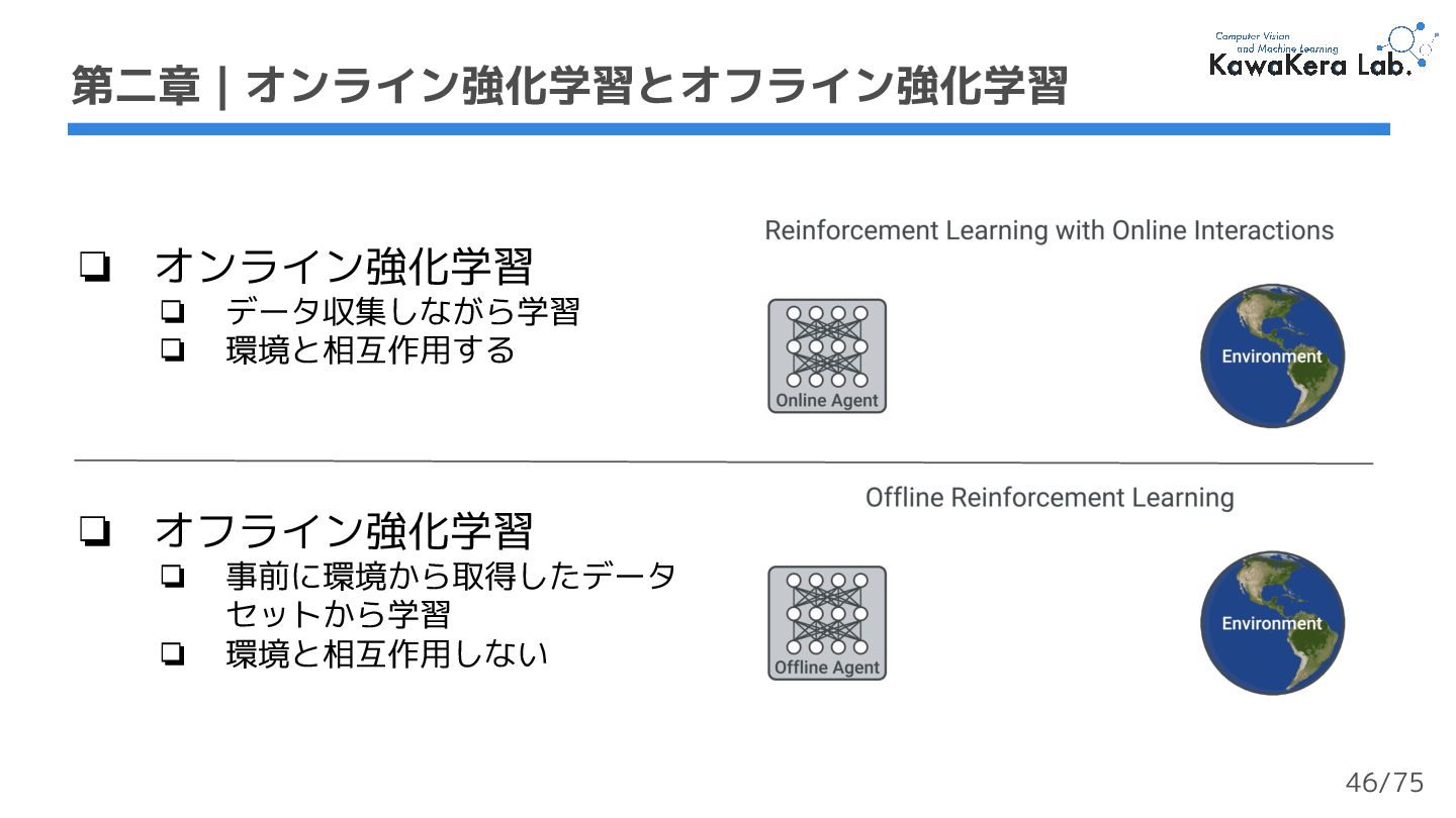 オフライン強化学習 ❏ 事前に環境から取得したデータ セットから学習 ❏ 環境と相互作用しない 46/75