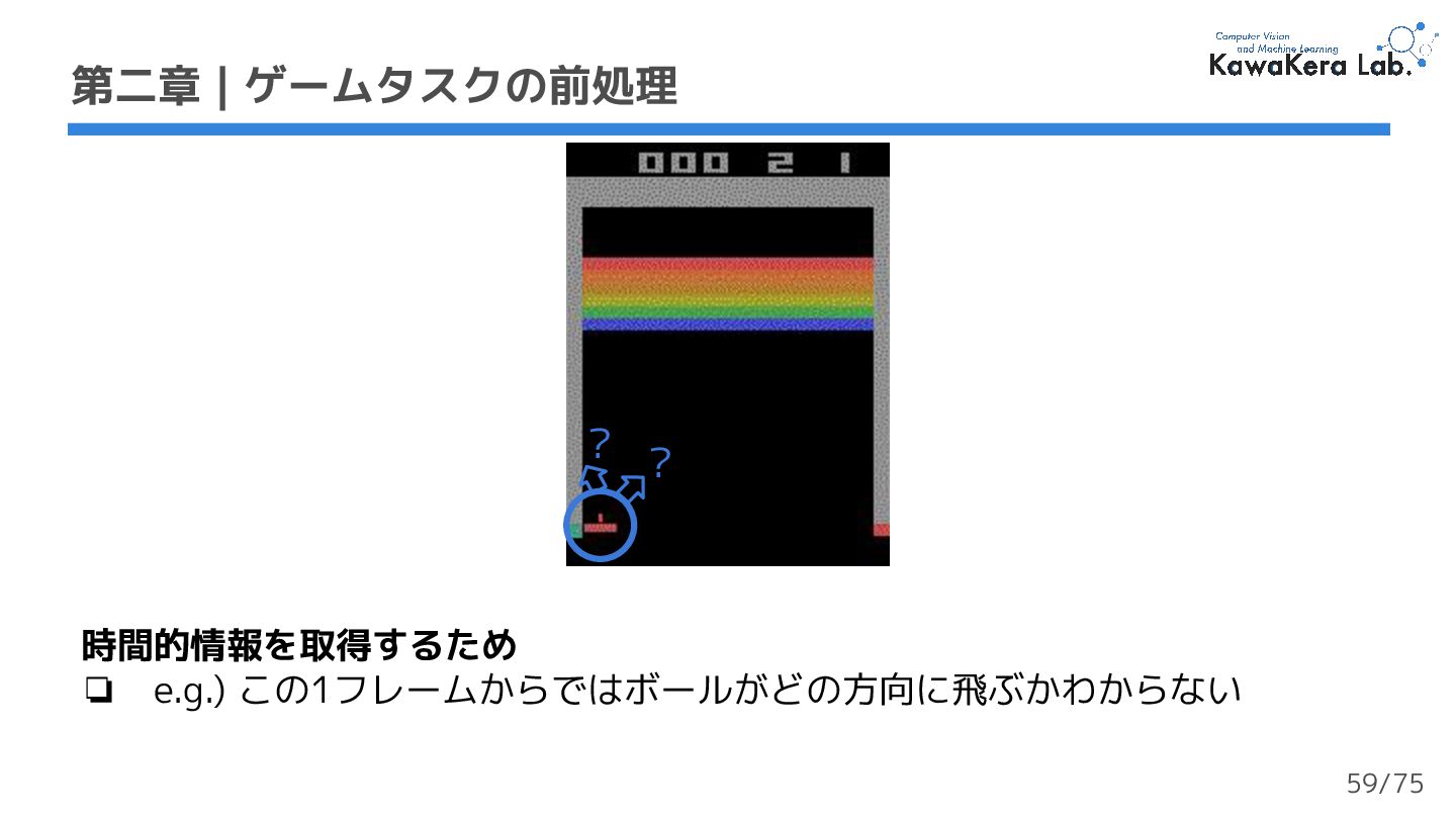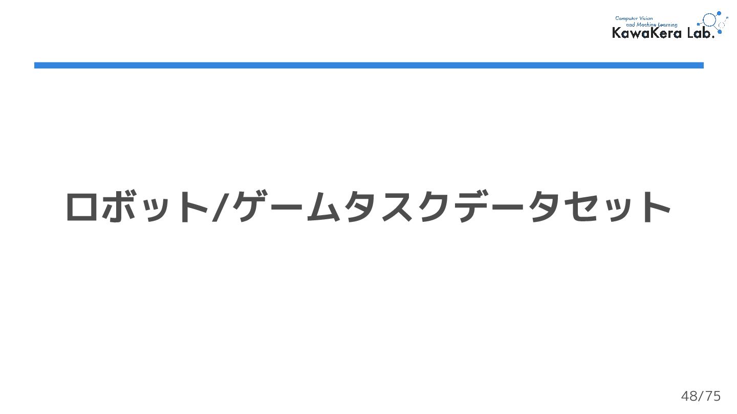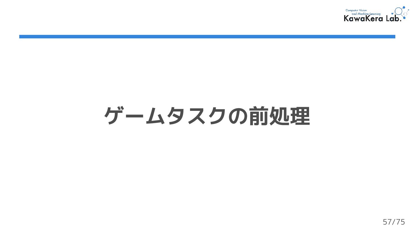 × 5000万タプル (st,at,rt,st+1) = 200M (2億)フレーム ❏ 大規模で多様なデータセット 第二章 | ゲームタスクデータセット 実装では50万ステップ を使用する (1%) 53/75