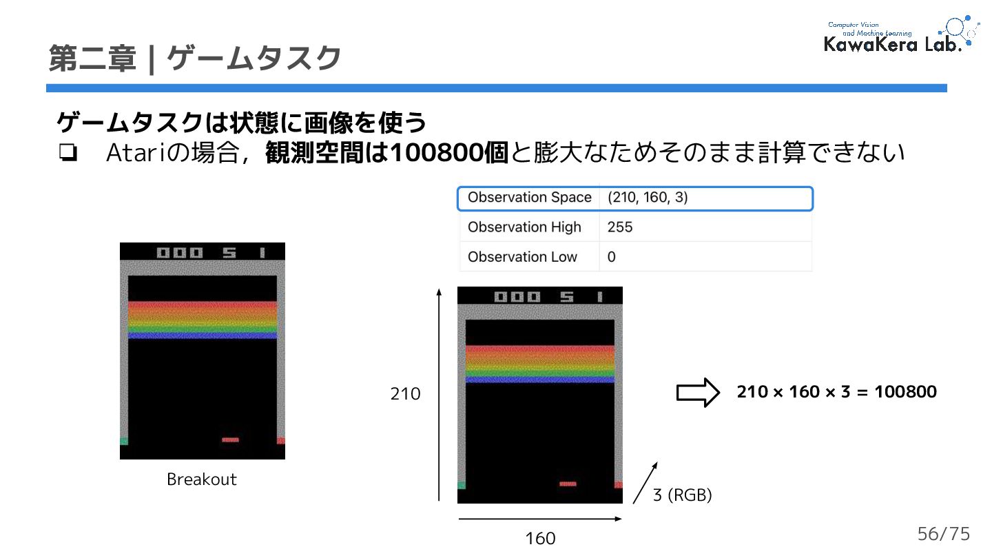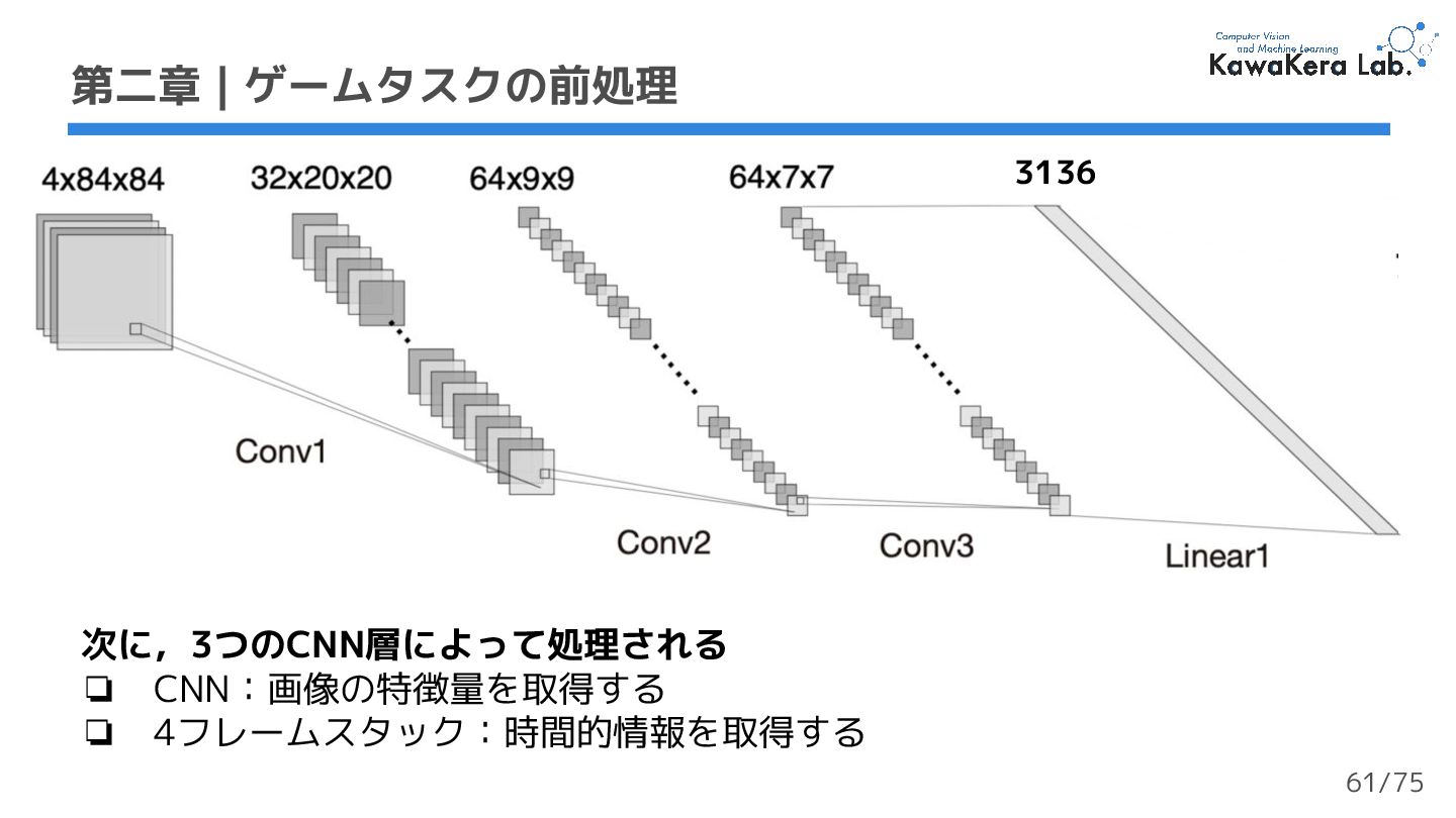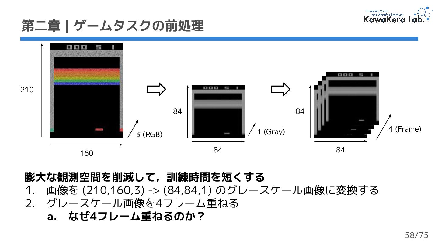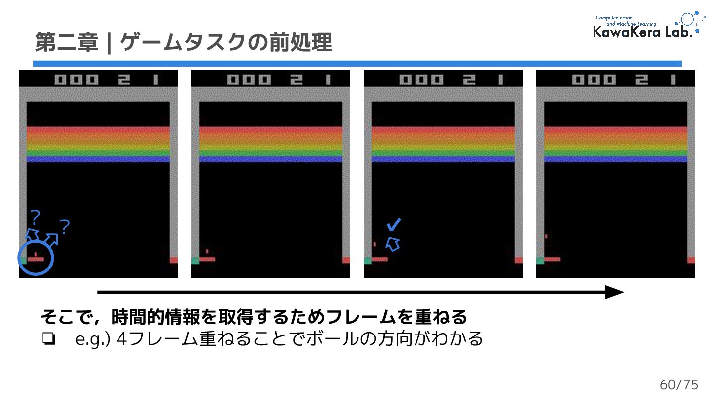 × 5000万タプル (st,at,rt,st+1) = 200M (2億)フレーム ❏ 大規模で多様なデータセット 第二章 | ゲームタスクデータセット 実装では50万ステップ を使用する (1%) 53/75