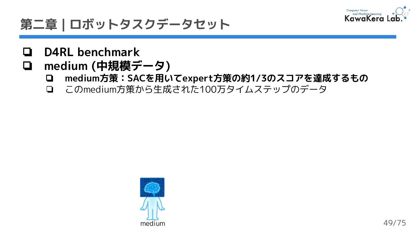 medium方策:SACを用いてexpert方策の約1/3のスコアを達成するもの ❏ このmedium方策から生成された100万タイムステップのデータ medium 49/75