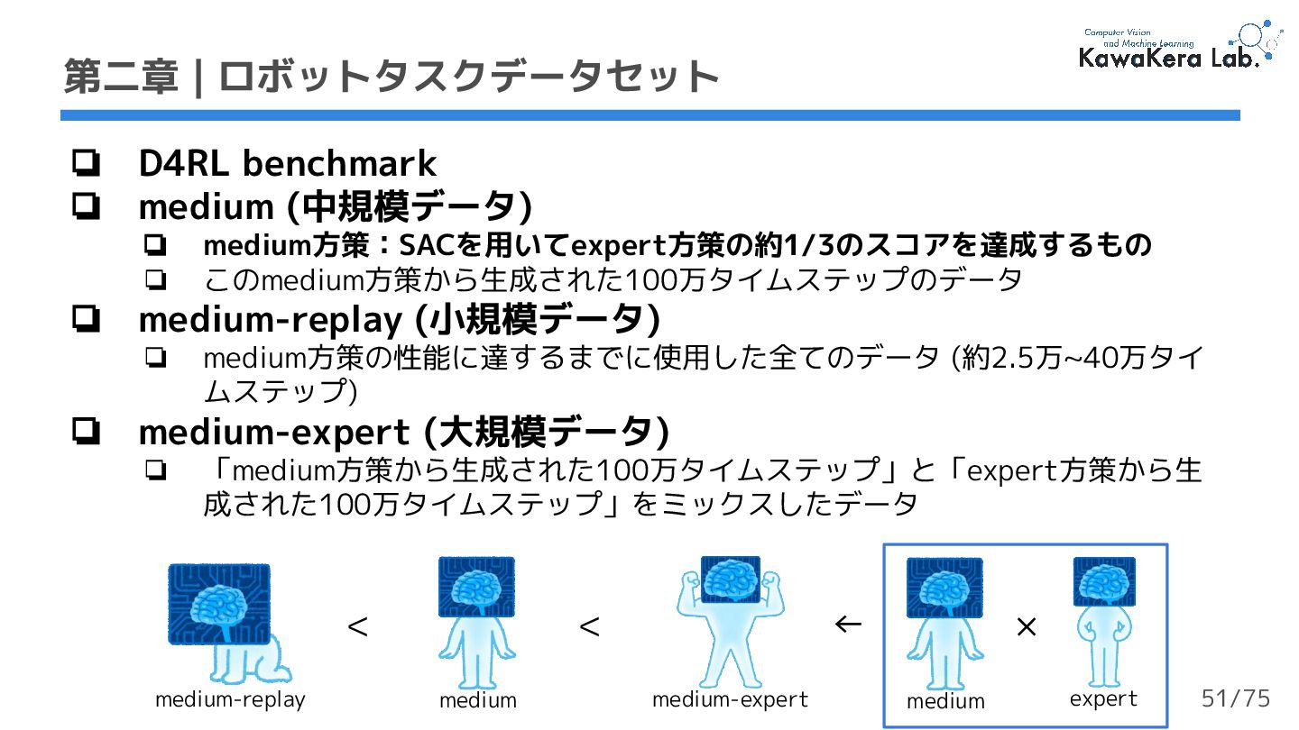 medium方策:SACを用いてexpert方策の約1/3のスコアを達成するもの ❏ このmedium方策から生成された100万タイムステップのデータ ❏ medium-replay (小規模データ) ❏ medium方策の性能に達するまでに使用した全てのデータ (約2.5万~40万タイ ムステップ) medium medium-replay < 50/75