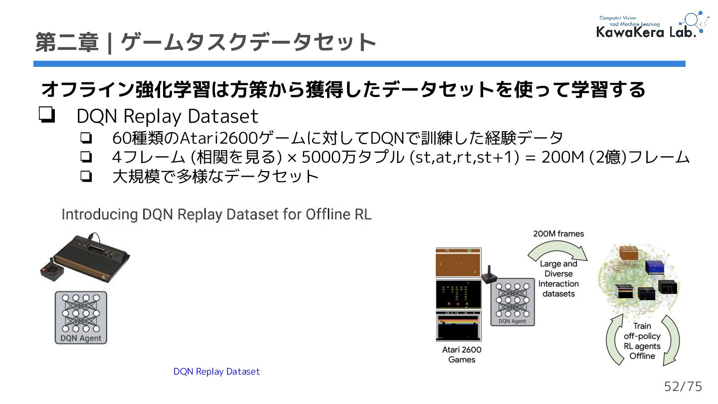 × 5000万タプル (st,at,rt,st+1) = 200M (2億)フレーム ❏ 大規模で多様なデータセット DQN Replay Dataset 第二章 | ゲームタスクデータセット 52/75