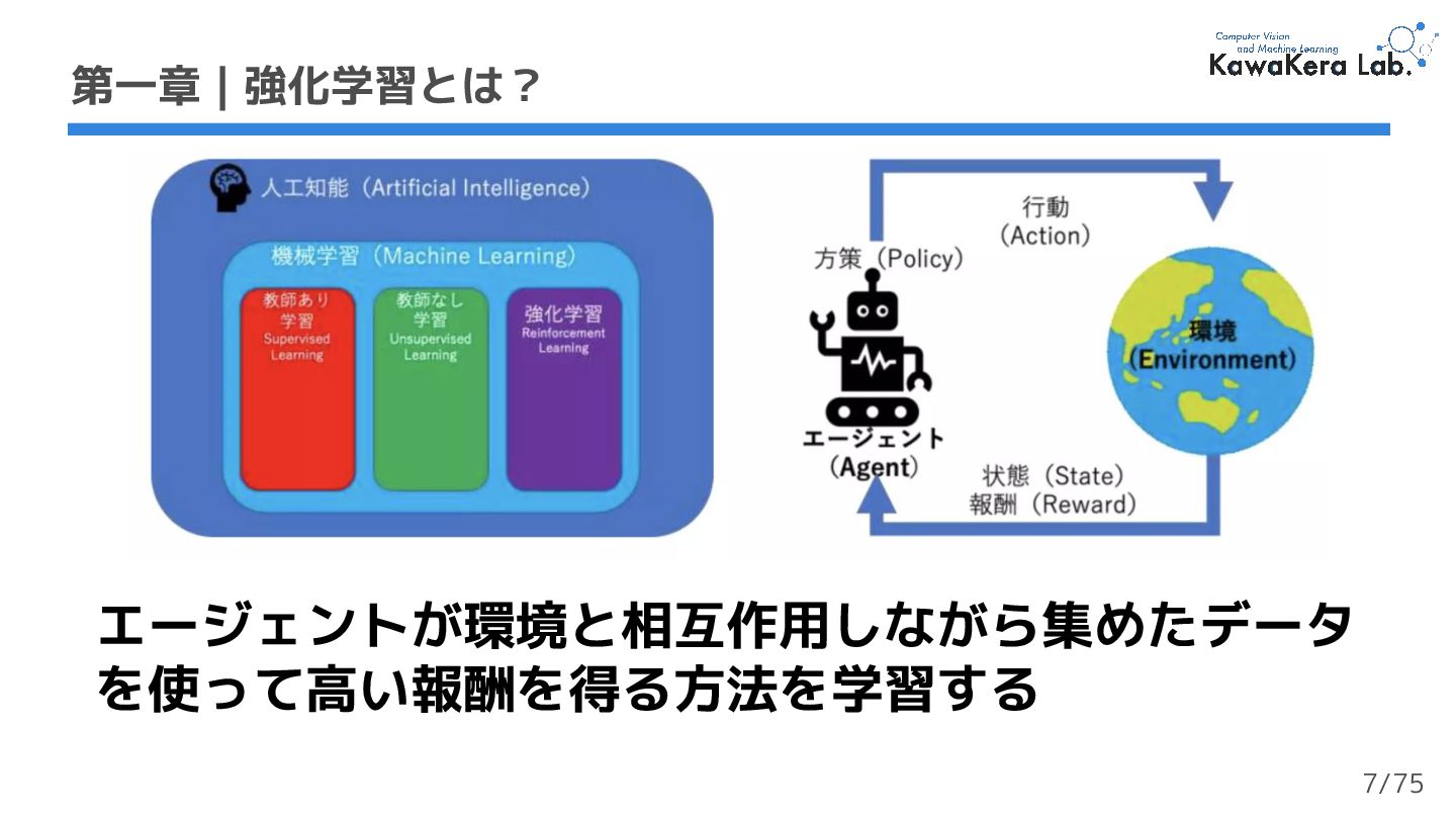6. 第二章 | オンライン強化学習とオフライン強化学習 ❏ オンライン強化学習 ❏ データ収集しながら学習 ❏ 環境と相互作用する ❏