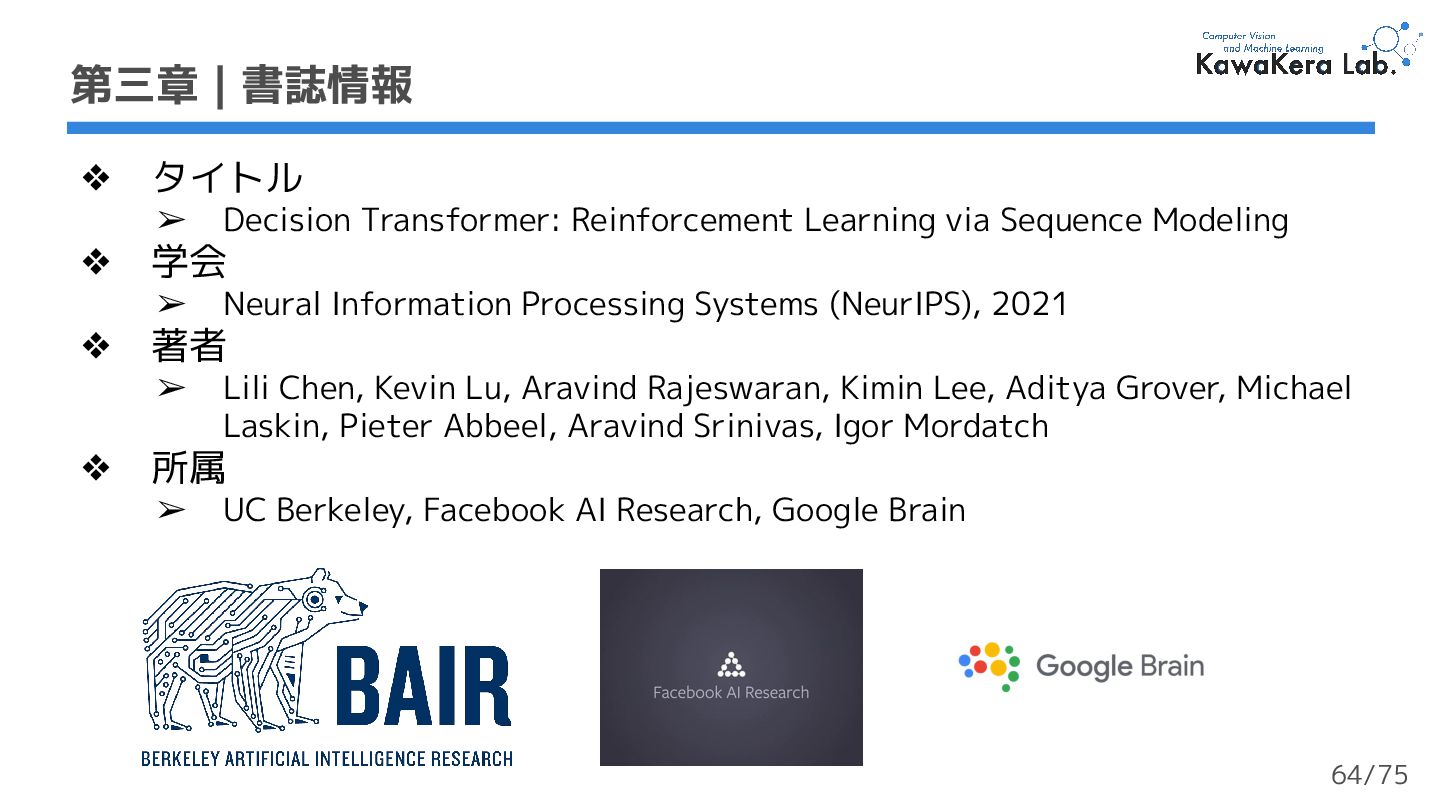 ❖ 学会 ➢ Neural Information Processing Systems (NeurIPS), 2021 ❖ 著者 ➢ Lili Chen, Kevin Lu, Aravind Rajeswaran, Kimin Lee, Aditya Grover, Michael Laskin, Pieter Abbeel, Aravind Srinivas, Igor Mordatch ❖ 所属 ➢ UC Berkeley, Facebook AI Research, Google Brain 第三章 | 書誌情報 64/75