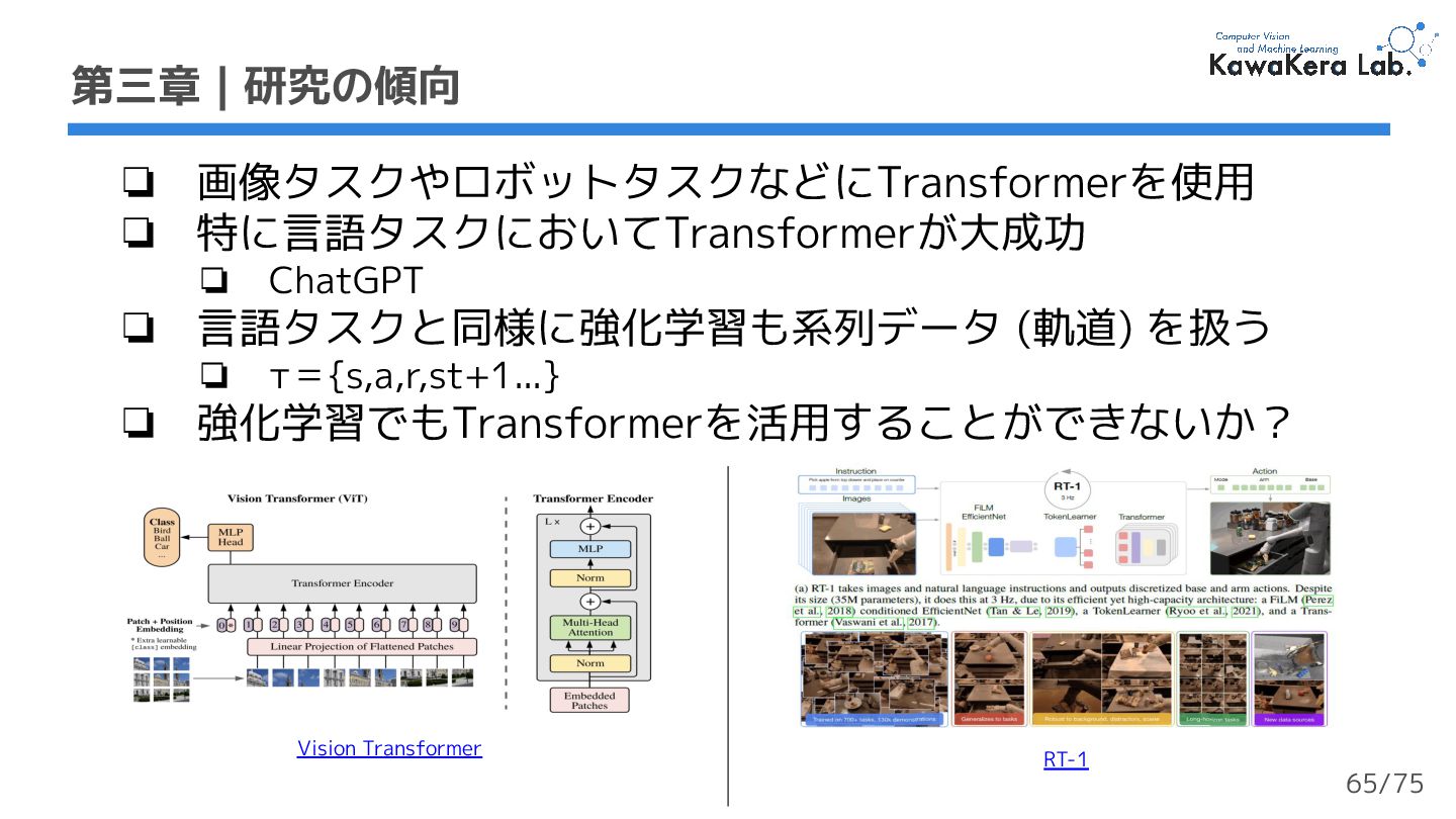 ❏ τ={s,a,r,st+1...} ❏ 強化学習でもTransformerを活用することができないか? Vision Transformer RT-1 第三章 | 研究の傾向 65/75