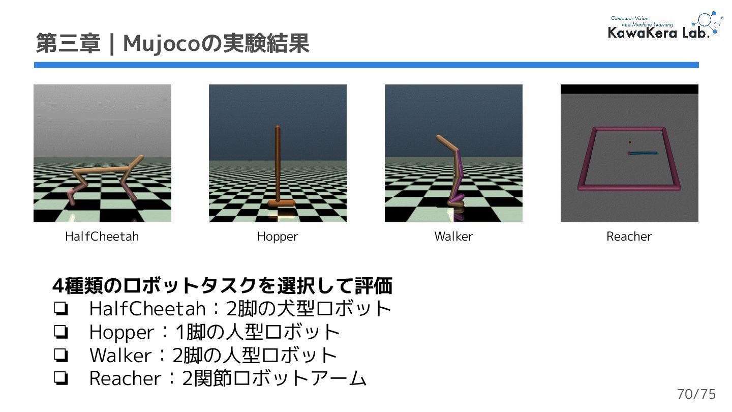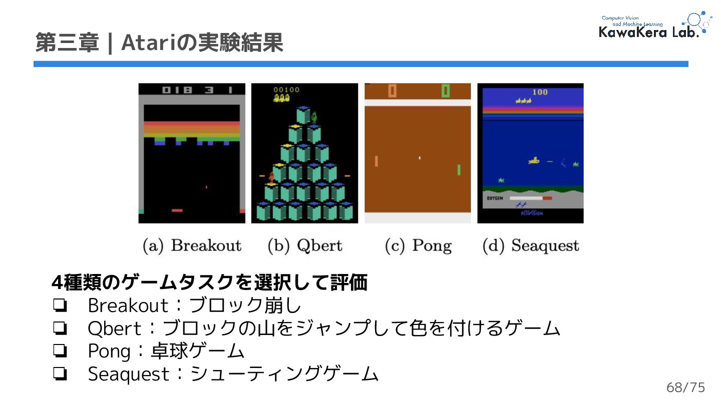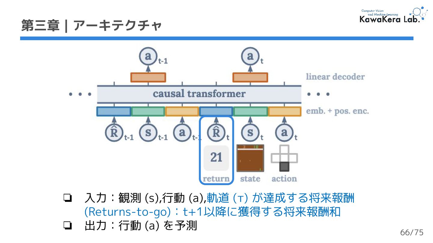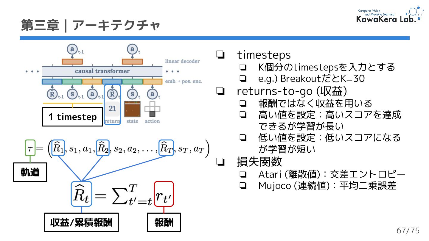 ❏ 報酬ではなく収益を用いる ❏ 高い値を設定:高いスコアを達成 できるが学習が長い ❏ 低い値を設定:低いスコアになる が学習が短い ❏ 損失関数 ❏ Atari (離散値):交差エントロピー ❏ Mujoco (連続値):平均二乗誤差 第三章 | アーキテクチャ 収益/累積報酬 報酬 軌道 1 timestep 67/75