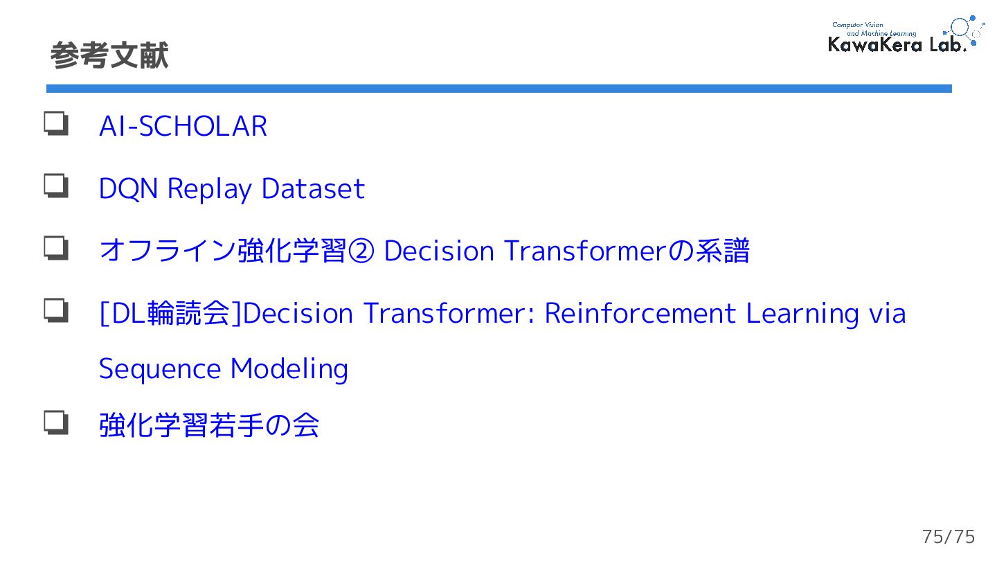 ❏ [DL輪読会]Decision Transformer: Reinforcement Learning via Sequence Modeling ❏ 強化学習若手の会 参考文献 75/75
