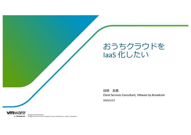 refers to Broadcom Inc. and/or its subsidiaries. 6 現状 p 運⽤ ü GUI ・⾃作スクリプト を使って仮想マシンを作成 ü ネットワーク・IP アドレスは スプレッドシート で管理 クラウド “サービス” とは⾔い難い… パブリッククラウドのように 仮想マシンやネットワークをクラウドサービス化しよう!!